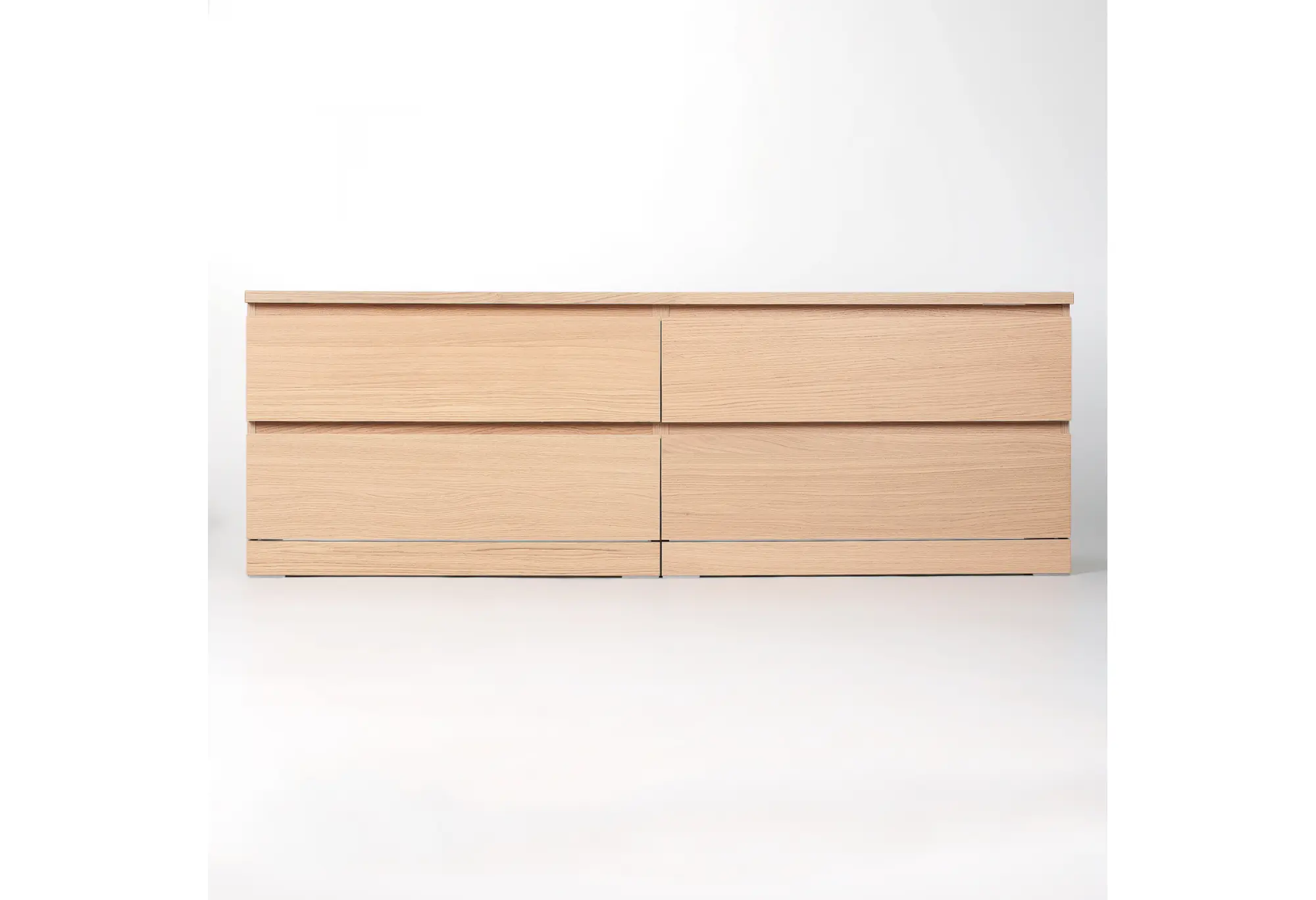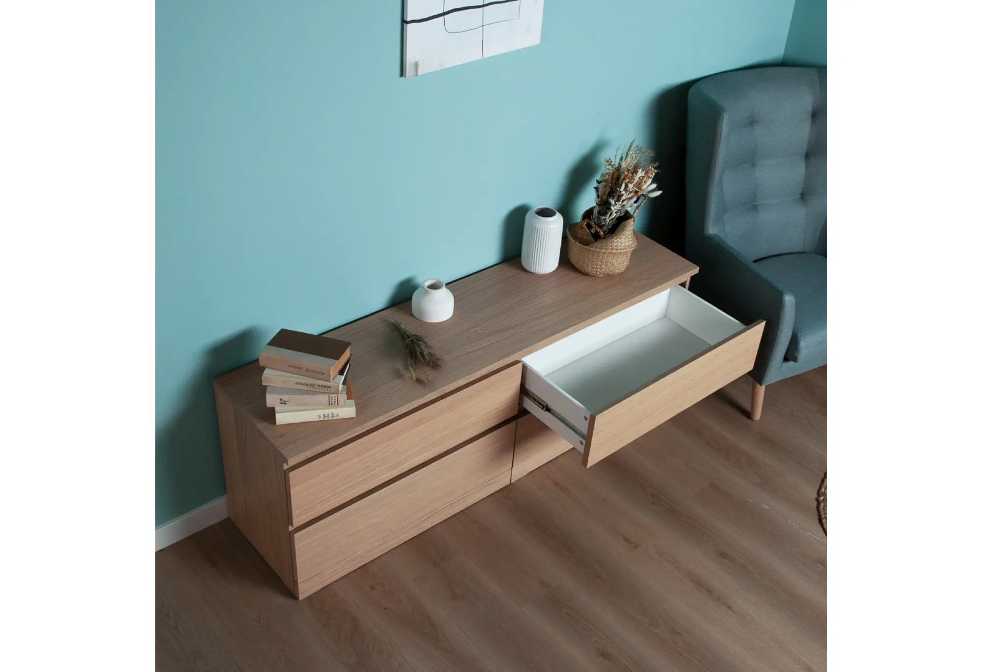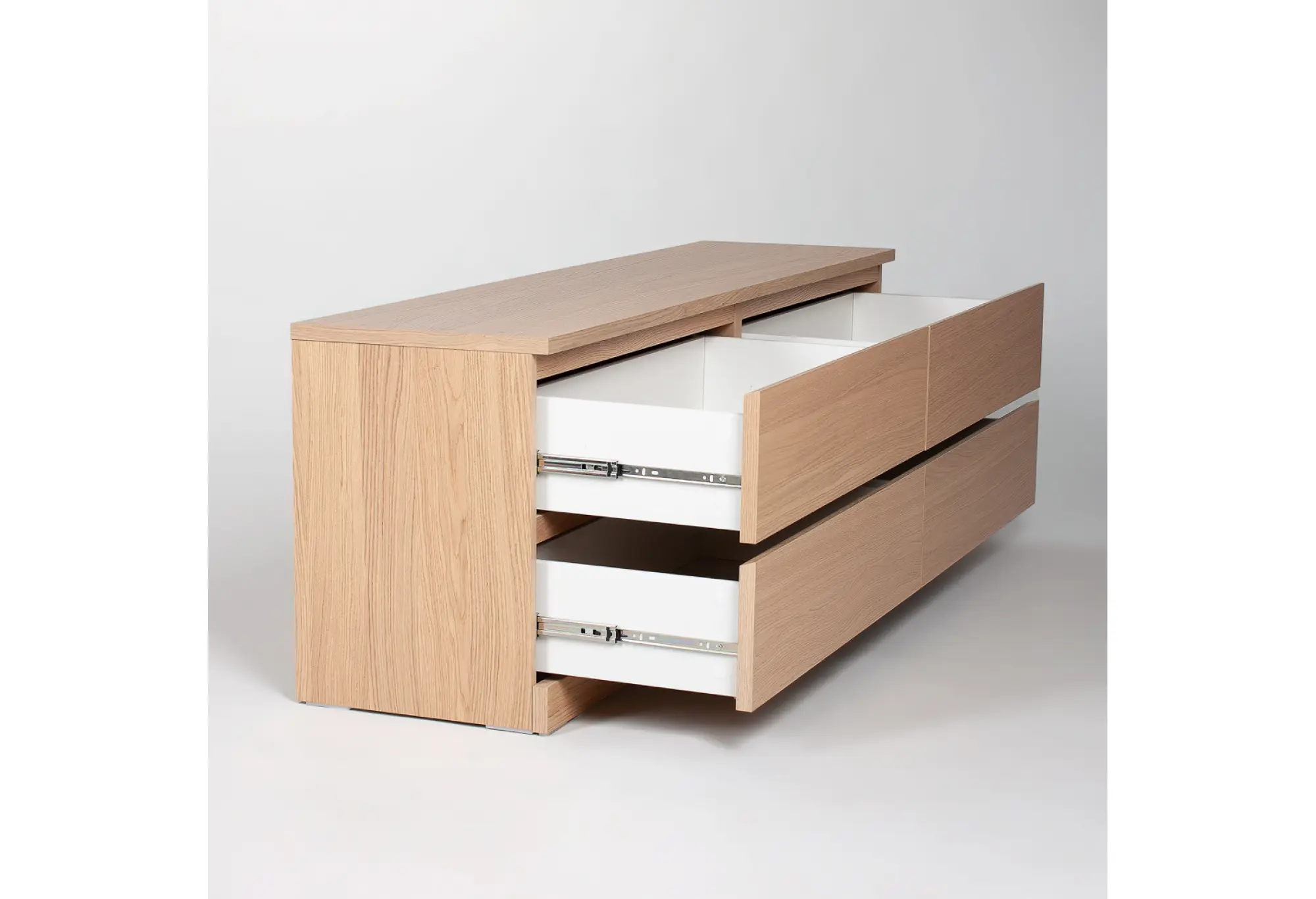 Выдвижные ящики оснащены телескопическими направляющими, которые обеспечивают плавное и полное выдвижение, облегчают доступ к содержимому и повышают комфорт ежедневного использования. Низкая высота делает верхнюю поверхность удобной для размещения телевизора, декора или оргтехники, не загромождая пространство. Конструкция рассчитана на установку у стены, при необходимости крепёжные элементы подбираются с учётом материала основания.