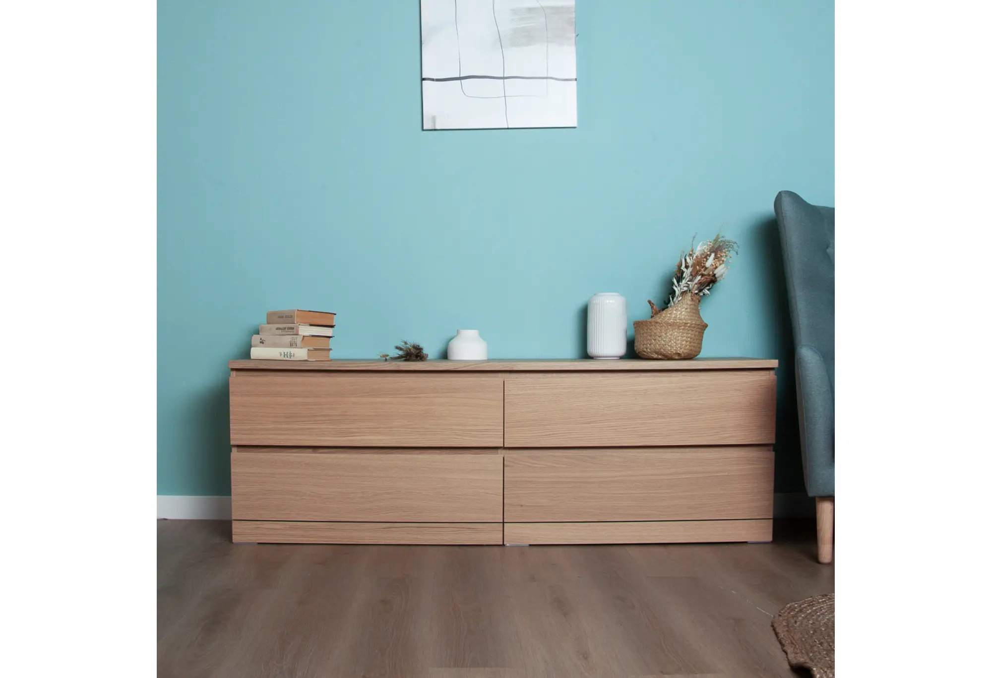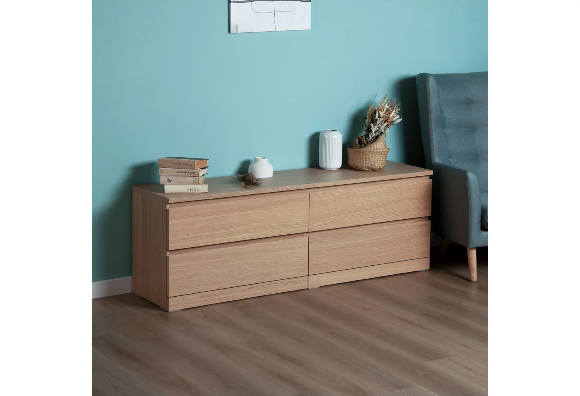 Комод Варма 4Д низкий с четырьмя выдвижными ящиками, цвет дуб белёный