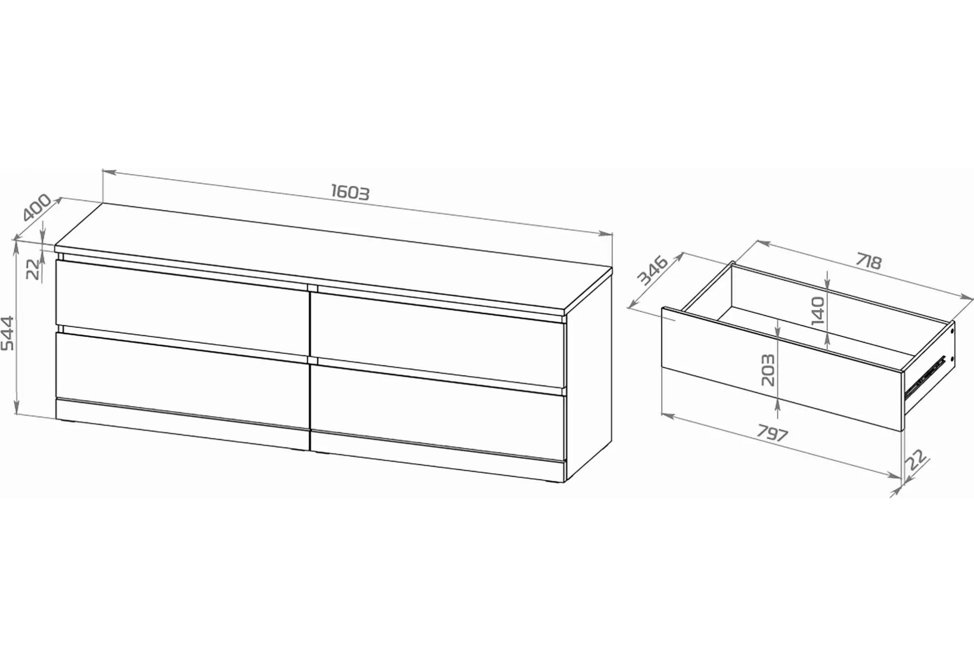 Ширина изделия 1603 мм при глубине 400 мм и высоте 548 мм делает комод удобным для размещения вдоль стены, под телевизором или большим зеркалом. Четыре выдвижных ящика образуют два симметричных ряда и создают аккуратный, упорядоченный фасад. Такая конфигурация позволяет рационально организовать хранение белья, одежды или других вещей, сохраняя внешний вид комнаты опрятным и лаконичным.