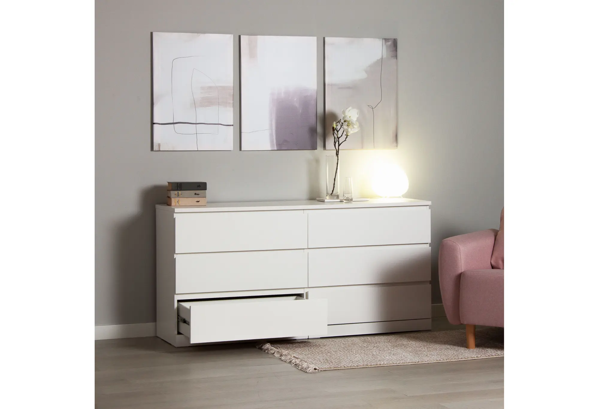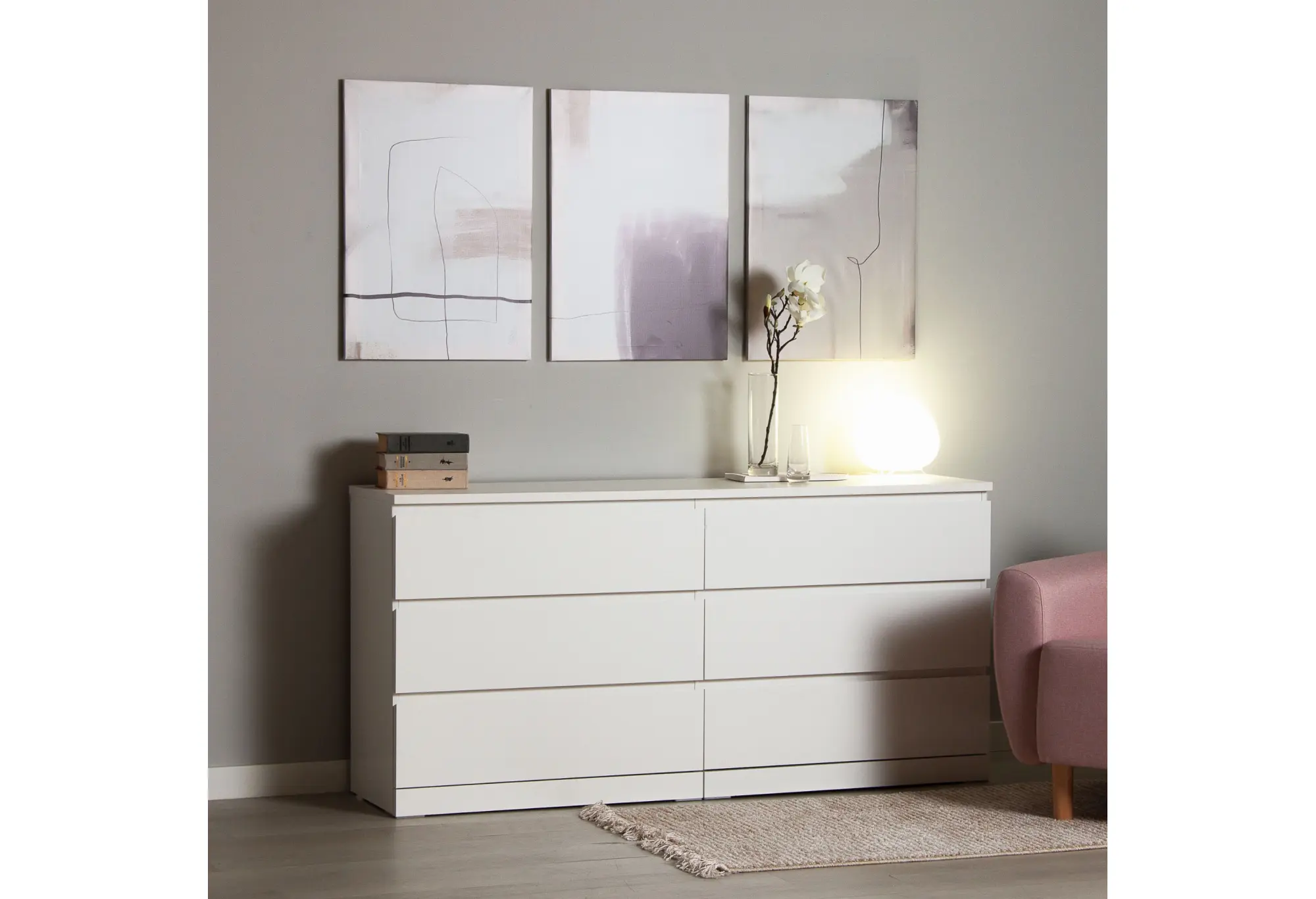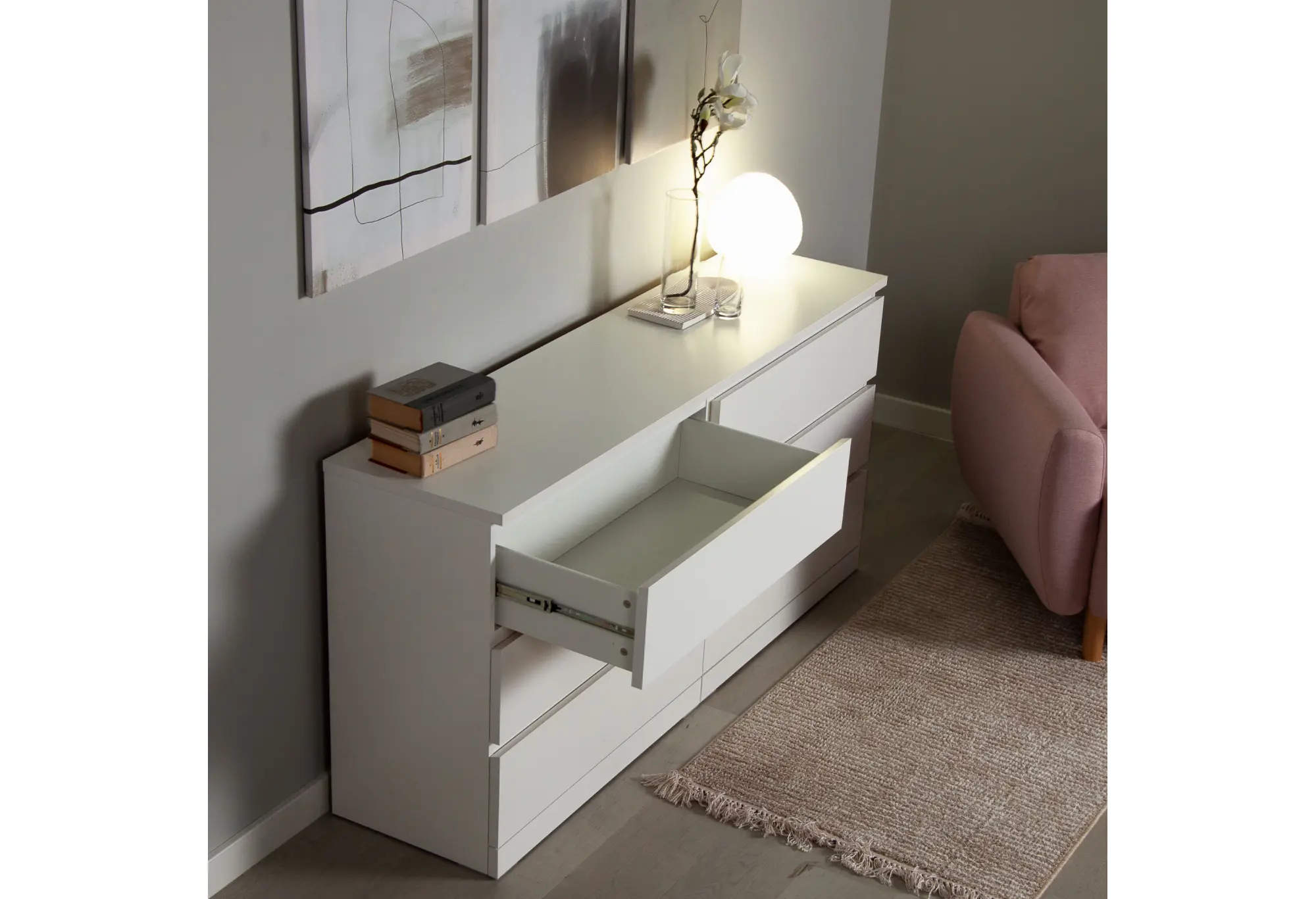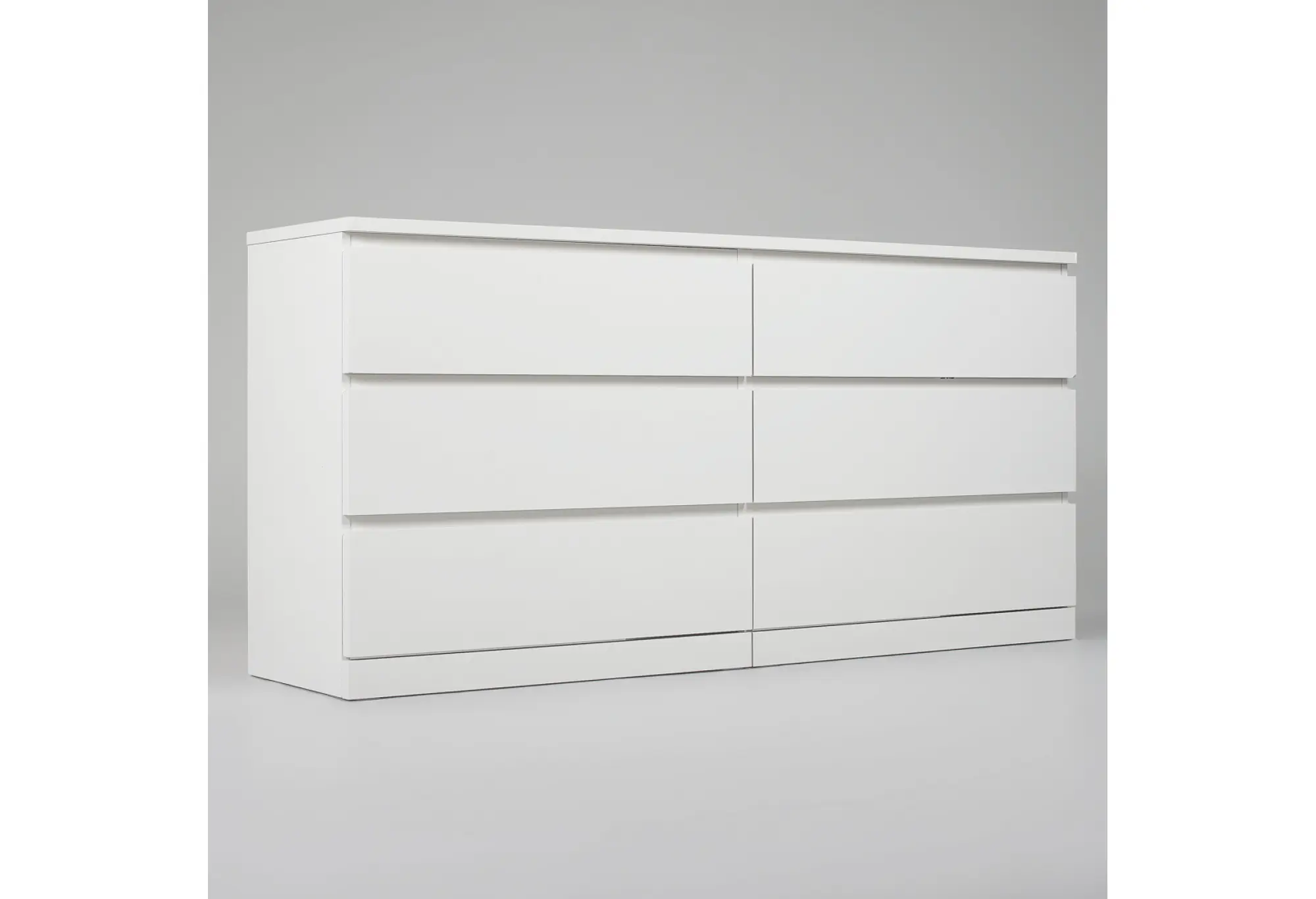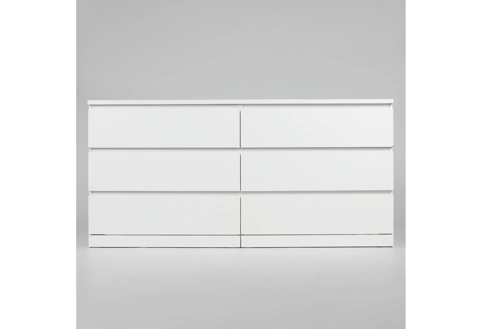 Комод «Варма 6Д» в белом цвете выполнен в лаконичном современном стиле и рассчитан на размещение вдоль стены благодаря продуманным габаритам 1603×400×775 мм. Широкий корпус из ДСП образует устойчивую конструкцию, а гладкие фасады без лишнего декора поддерживают аккуратный, сдержанный внешний вид. Шесть выдвижных ящиков расположены в два ряда по три, что помогает удобно распределить содержимое по категориям и использовать всю ширину комода.