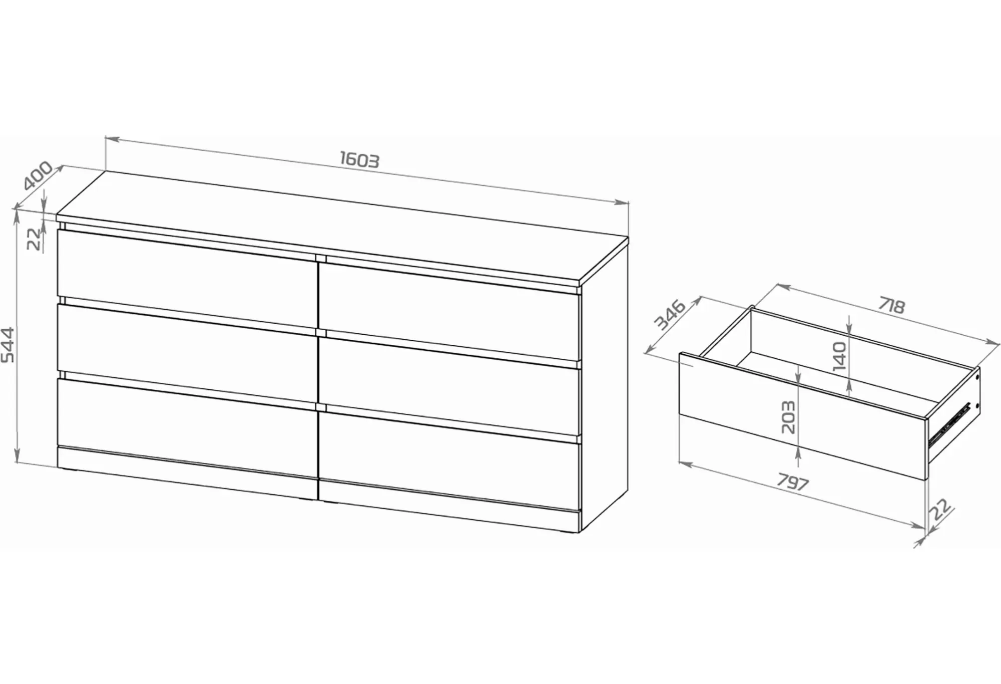 Все ящики оснащены качественными телескопическими направляющими, которые обеспечивают плавное выдвижение и позволяют комфортно пользоваться комодом каждый день. Небольшая глубина 400 мм делает модель удобной для установки в спальне, гостиной или коридоре, не перегружая пространство. Верхняя поверхность может использоваться как функциональная плоскость для размещения телевизора, техники, декоративных предметов или органайзеров.
