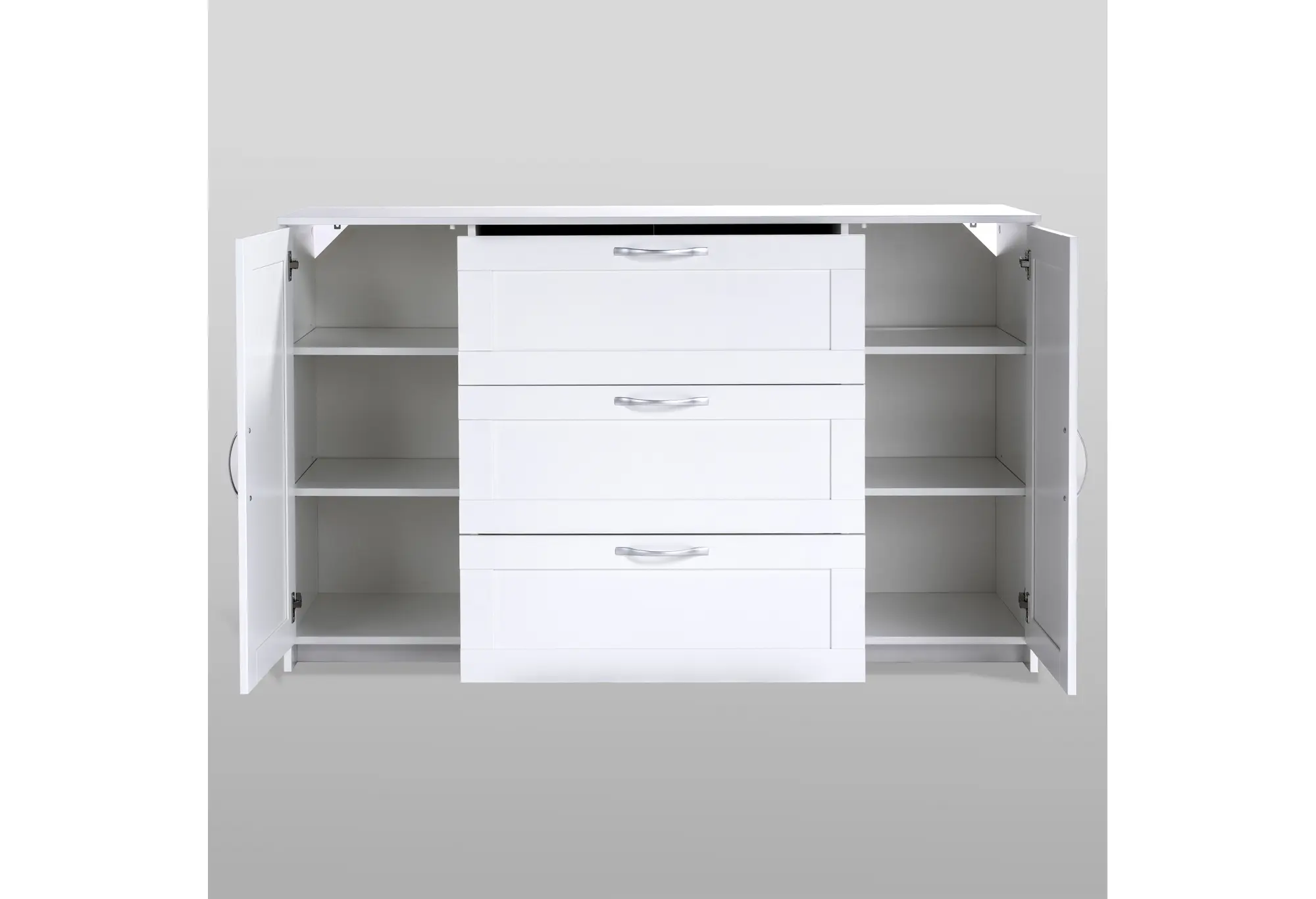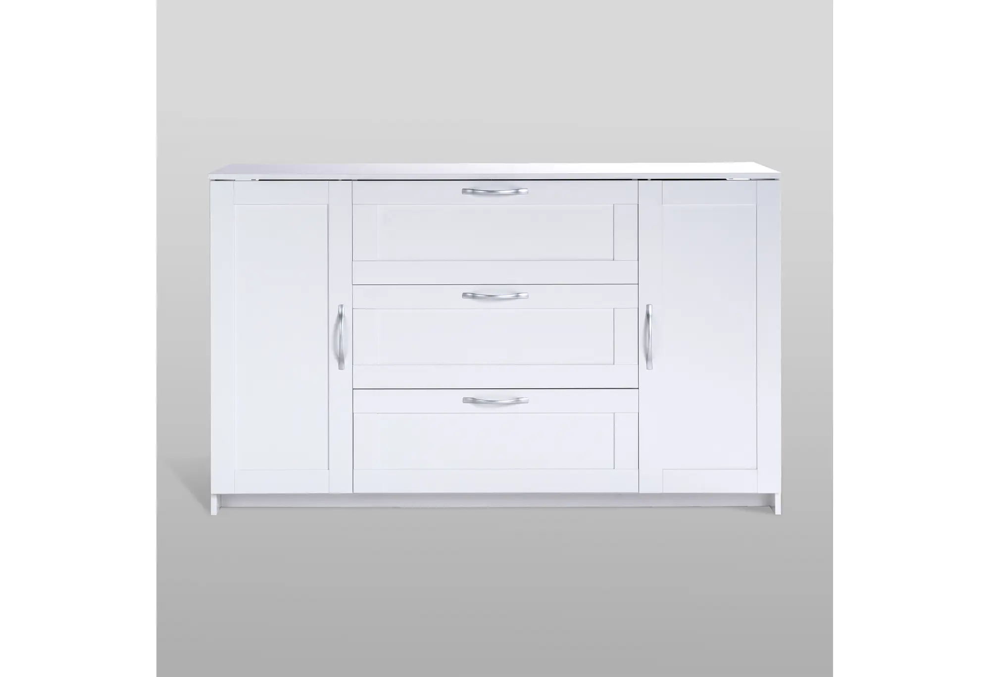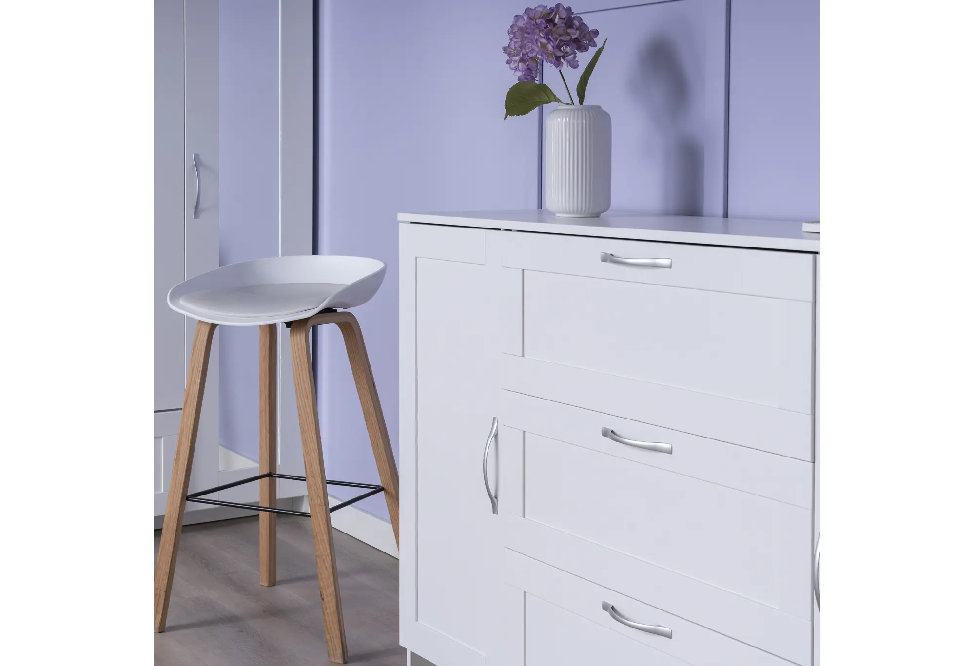 Тумба «СИРИУС» выполнена в современном лаконичном стиле и окрашена в универсальный белый цвет, который легко сочетается с большинством интерьерных решений. Корпус изготовлен из кашированного ДСП толщиной 16 мм, что обеспечивает стабильность конструкции и устойчивость к повседневной эксплуатации. Продуманная ширина 1560 мм и глубина 412 мм позволяют разместить тумбу вдоль стены в гостиной, спальне или коридоре, не перегружая пространство, а высота 946 мм делает её удобной и для размещения вещей, и для использования верхней поверхности как дополнительной плоскости.