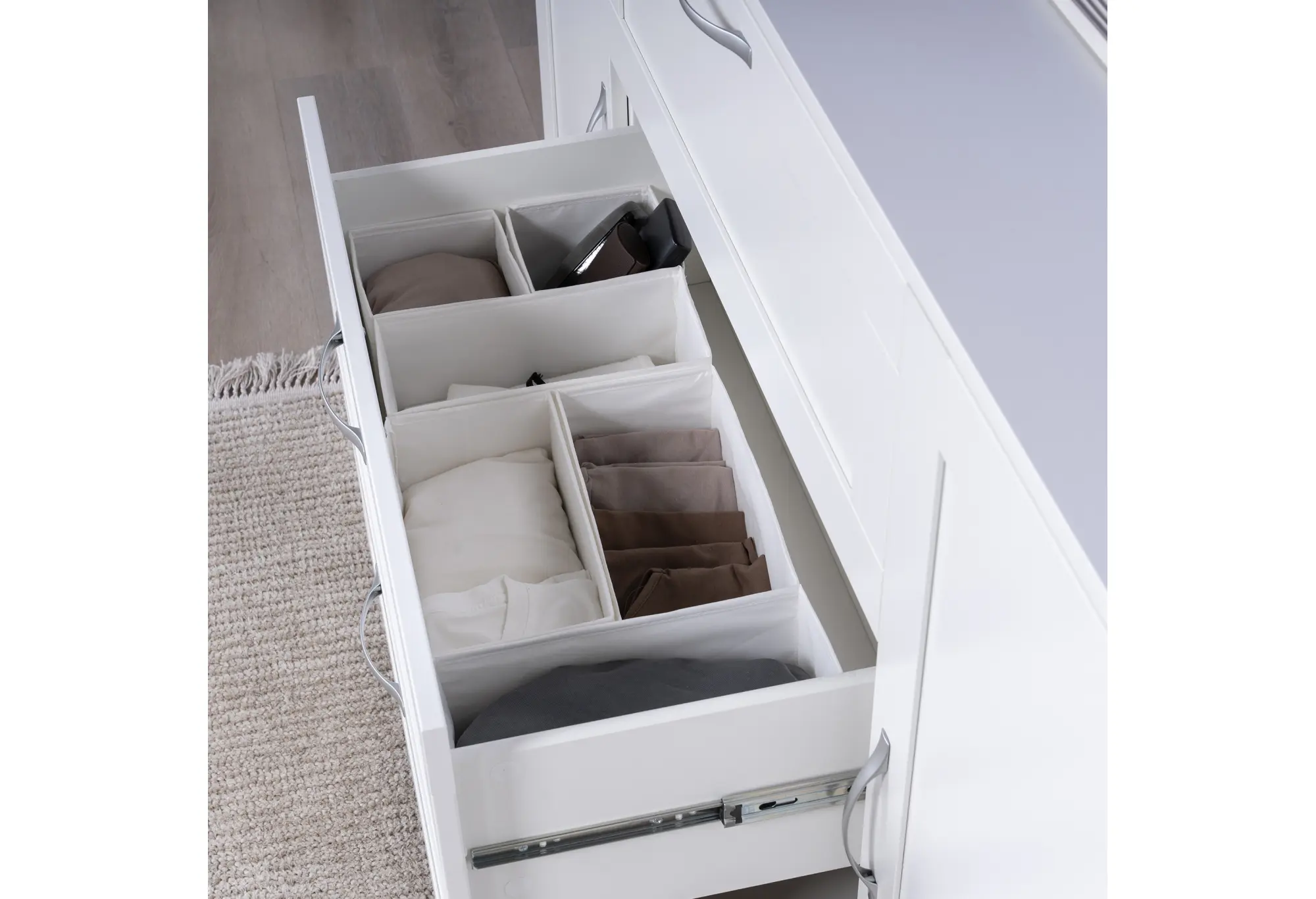 - Сочетание двух распашных отделений и трёх наружных ящиков для разного типа хранения