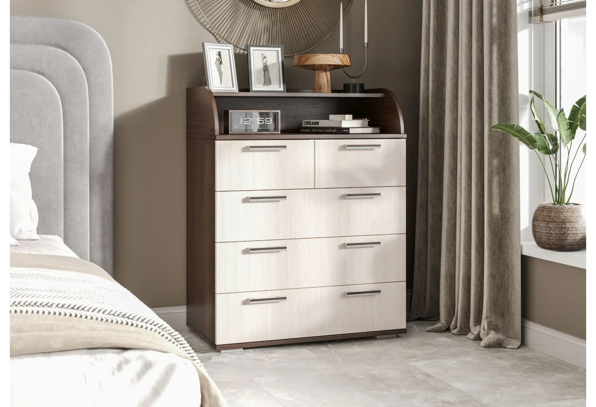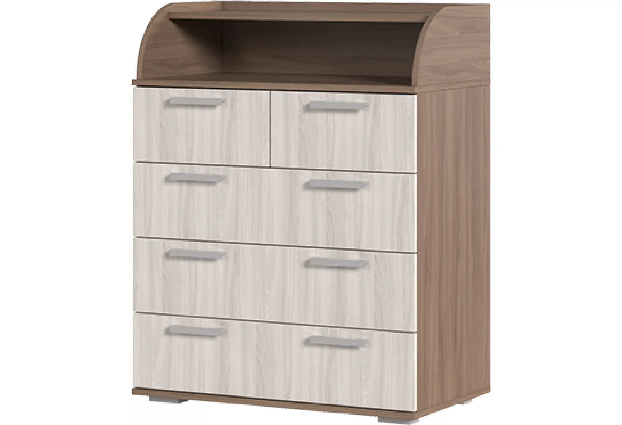 Фасады ящиков оформлены в светлом оттенке, который визуально облегчает конструкцию, а более тёмный корпус создаёт аккуратный контраст и помогает комоду гармонично сочетаться с другой мебелью в комнате. На фронтальной части расположены удобные удлинённые ручки, за которые легко браться, открывая и закрывая ящики. Несколько выдвижных секций дают возможность раздельно разместить бельё, одежду и другие вещи, поддерживая порядок внутри.