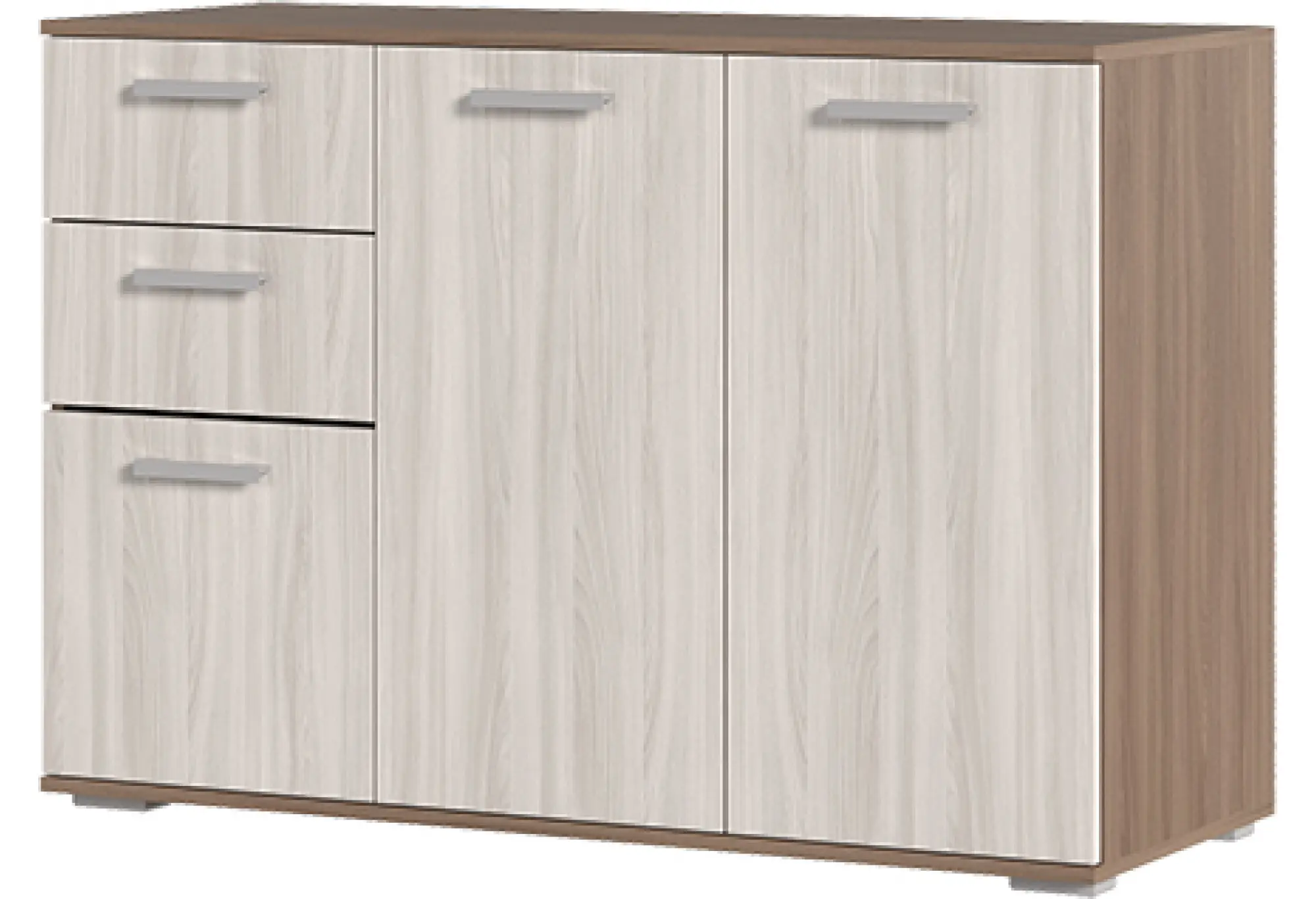 Комод опирается на небольшие опоры, что облегчает уборку вокруг него и придаёт мебели аккуратный завершённый вид. Благодаря расположению секций вещи можно разумно распределить по высоте и объёму - в отделениях за дверцами организовать хранение более габаритных предметов, а в ящиках — мелких и средних вещей. Нейтральная цветовая гамма и сдержанный дизайн позволяют сочетать комод с большинством современных мебельных серий.