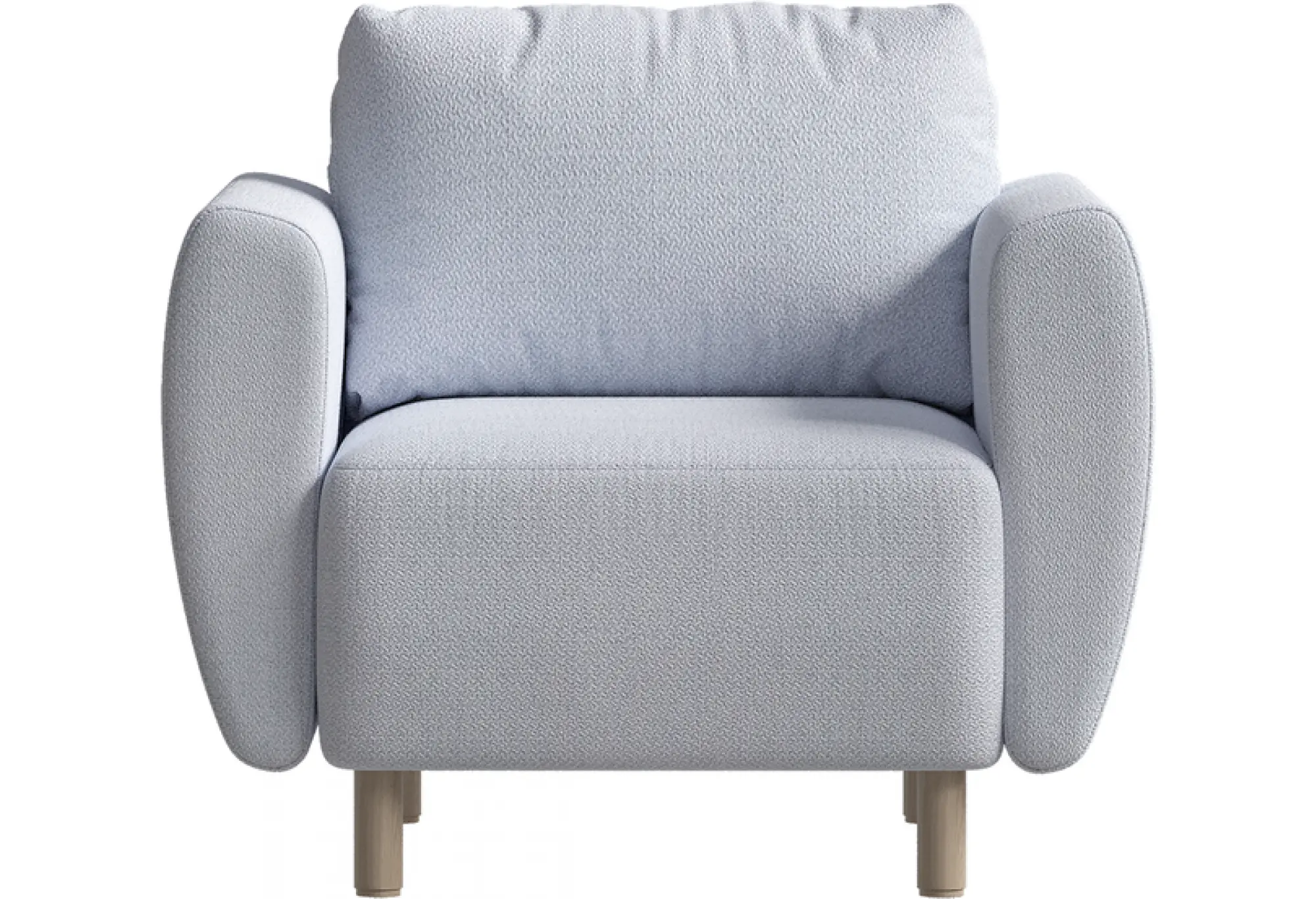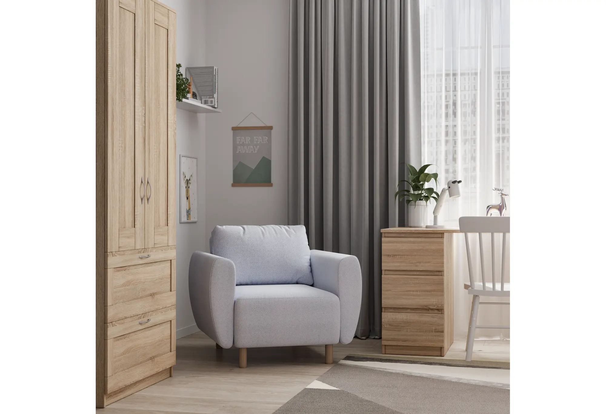 Корпус кресла основан на сочетании массива дерева, ДСП и фанеры – это обеспечивает устойчивость конструкции и долговечность при регулярной нагрузке. Наполнитель из пенополиуретана (ППУ) формирует упругую и в то же время комфортную посадку, помогая сохранить форму сиденья и спинки. Невысокие ножки визуально «облегчают» кресло и делают уборку вокруг него более удобной.