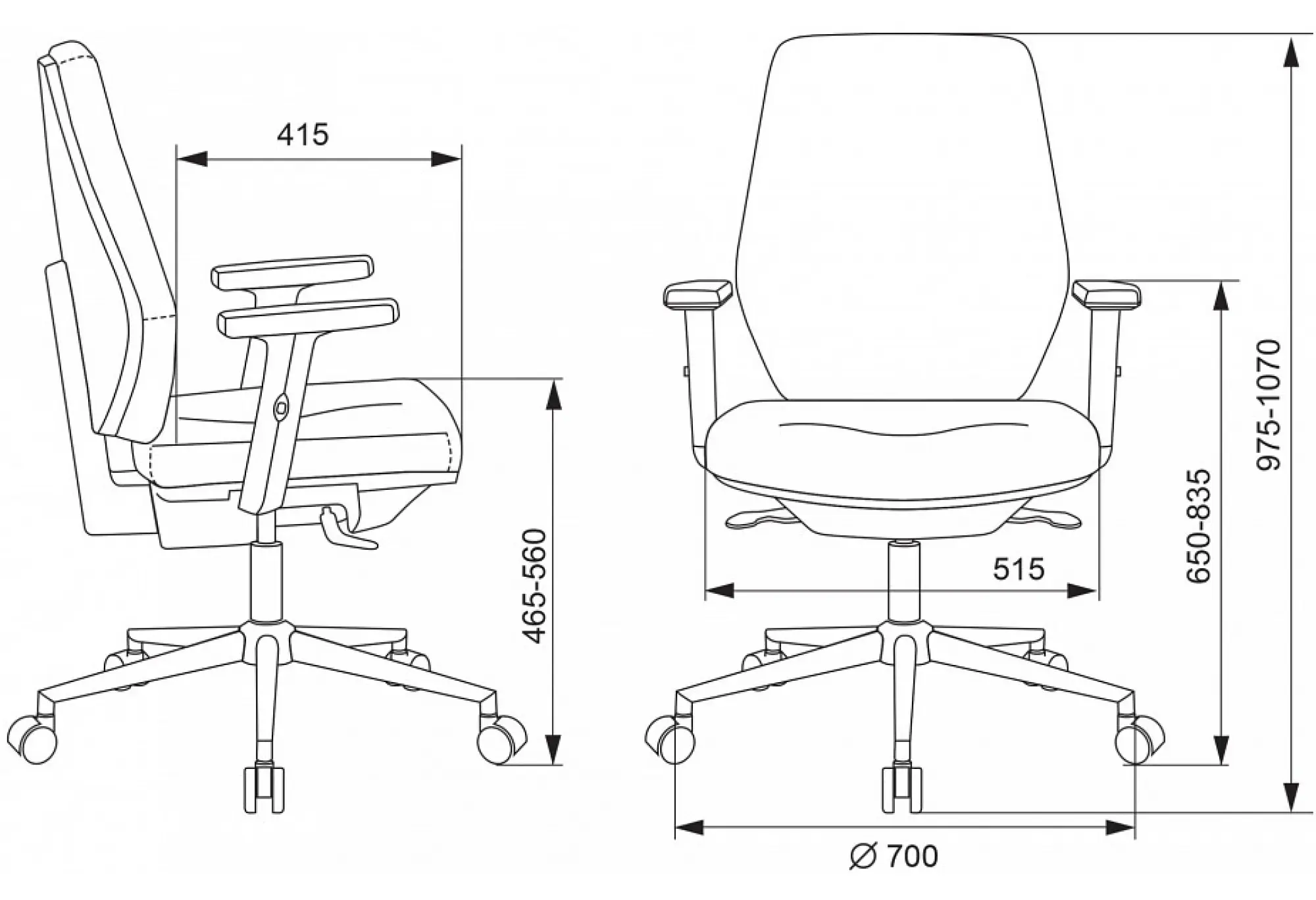 Дополнительные параметры: ширина сиденья - 515 мм, глубина сиденья - 415 мм, высота сиденья - 465-560 мм, высота спинки - 510 мм, высота от пола до подлокотников - 650-835 мм, высота подлокотника - 185-275 мм, диаметр крестовины - 700 мм, диаметр колес - 50 мм