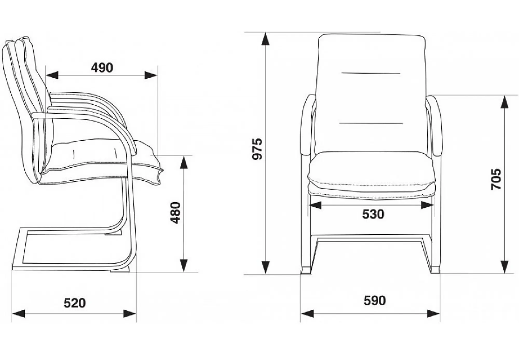 Дополнительные параметры: ширина сиденья - 530 мм, глубина сиденья - 490 мм, высота сиденья - 480 мм, высота с подлокотниками - 705 мм, высота спинки - низкая, высота подлокотника - 225мм, ширина с подлокотниками - 595 мм, ширина полозьев - 590 мм, глубина полозьев - 520 мм
