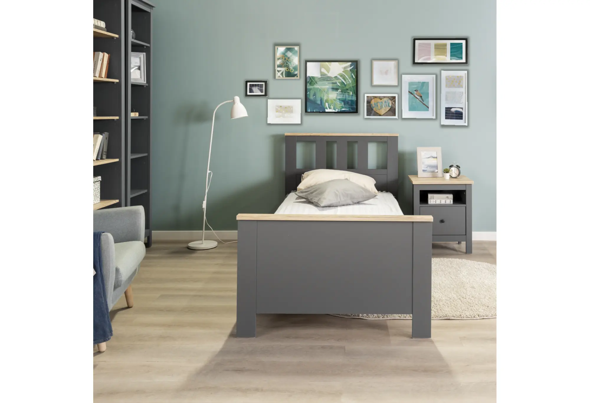 Одинарная кровать «Сага» размером 90×200 см выполнена из прочной ДСП и рассчитана на стандартный односпальный матрас. Корпус в спокойном сером цвете дополнен вставками под ясень по верхнему краю изголовья и изножья, за счет чего кровать выглядит сдержанно и аккуратно, подходит как для современной, так и для более классической обстановки. Высокое изголовье с прямыми линиями поддерживает общий строгий стиль, а изножье придает конструкции завершенный вид и визуально делает кровать более устойчивой. Реечное основание обеспечивает опору под матрас по всей длине спального места, что способствует равномерному распределению нагрузки. Компактная ширина 900 мм позволяет разместить кровать в комнате небольшого размера, при этом длина 2000 мм подходит для комфортного отдыха взрослого или подростка.