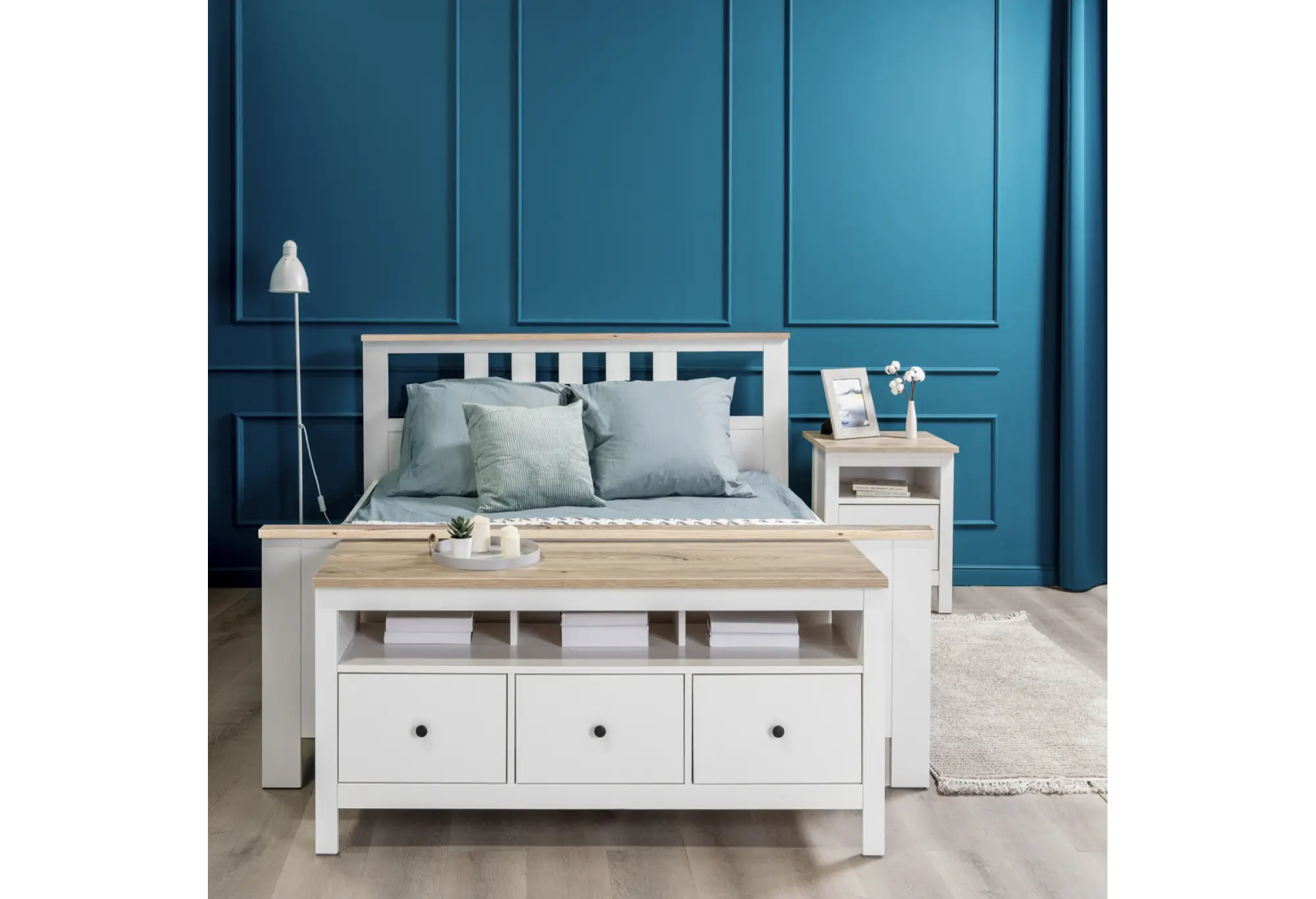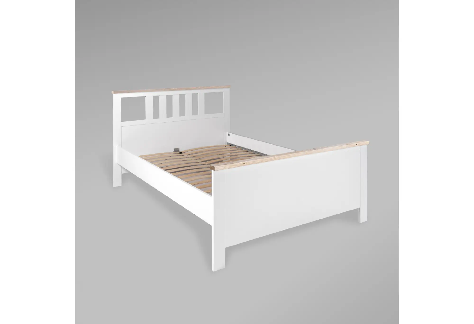 Двуспальная кровать из коллекции «Сага» выполнена в спокойном сочетании белого цвета и оттенка ясеня, что делает её уместной как в современном, так и в классическом интерьере. Контрастные верхние планки на изножье и изголовье визуально «собирают» композицию и придают кровати аккуратный, законченный вид.