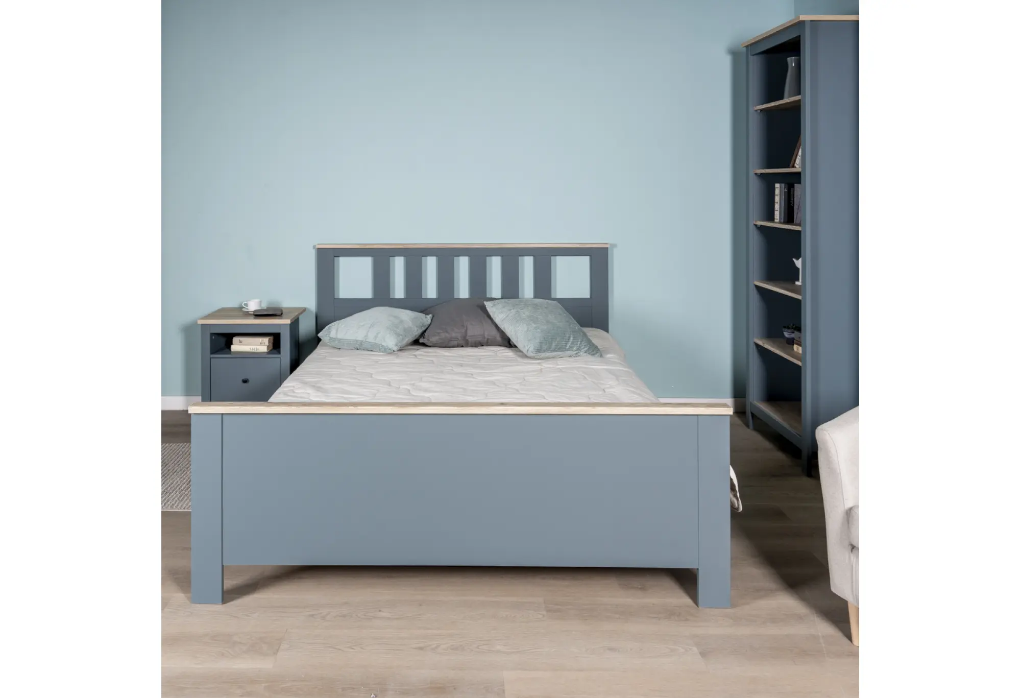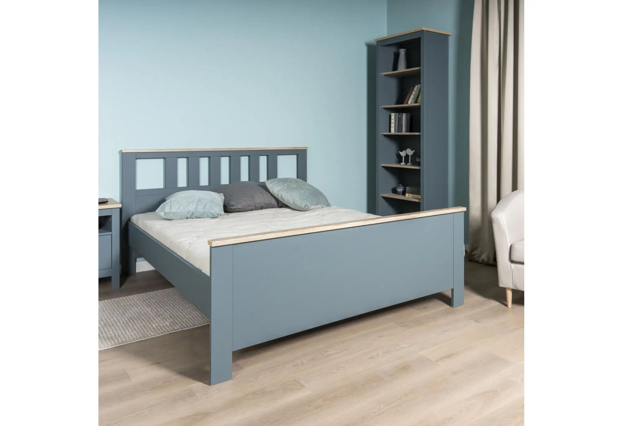 Двуспальная кровать 160×200 из коллекции «Сага» — это лаконичное решение для спальни, где важны уют, порядок и аккуратный внешний вид. Сочетание темно-бирюзового цвета с декором под ясень создаёт сдержанный, но выразительный акцент в интерьере, не перегружая пространство и хорошо сочетаясь с нейтральными и светлыми оттенками.