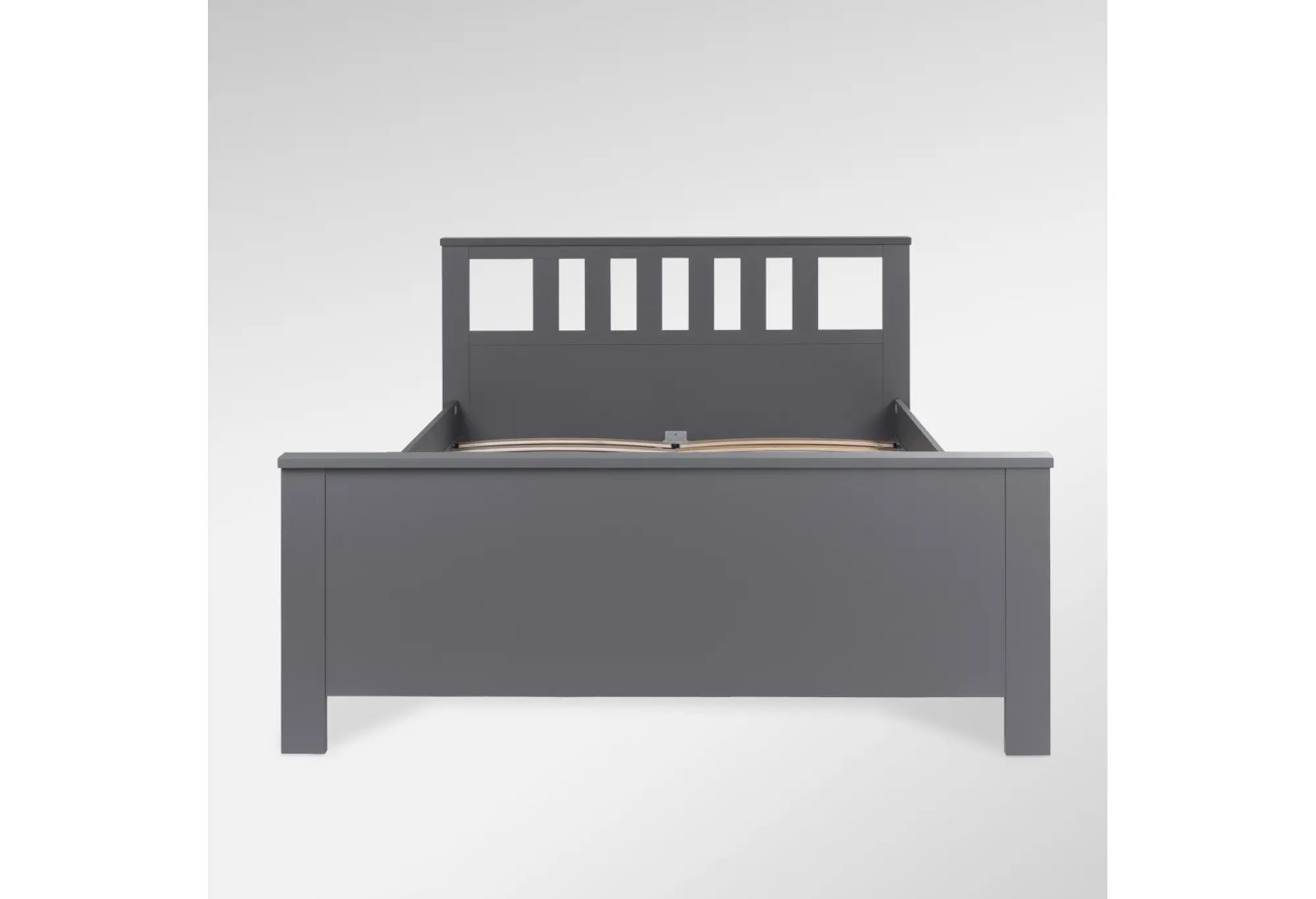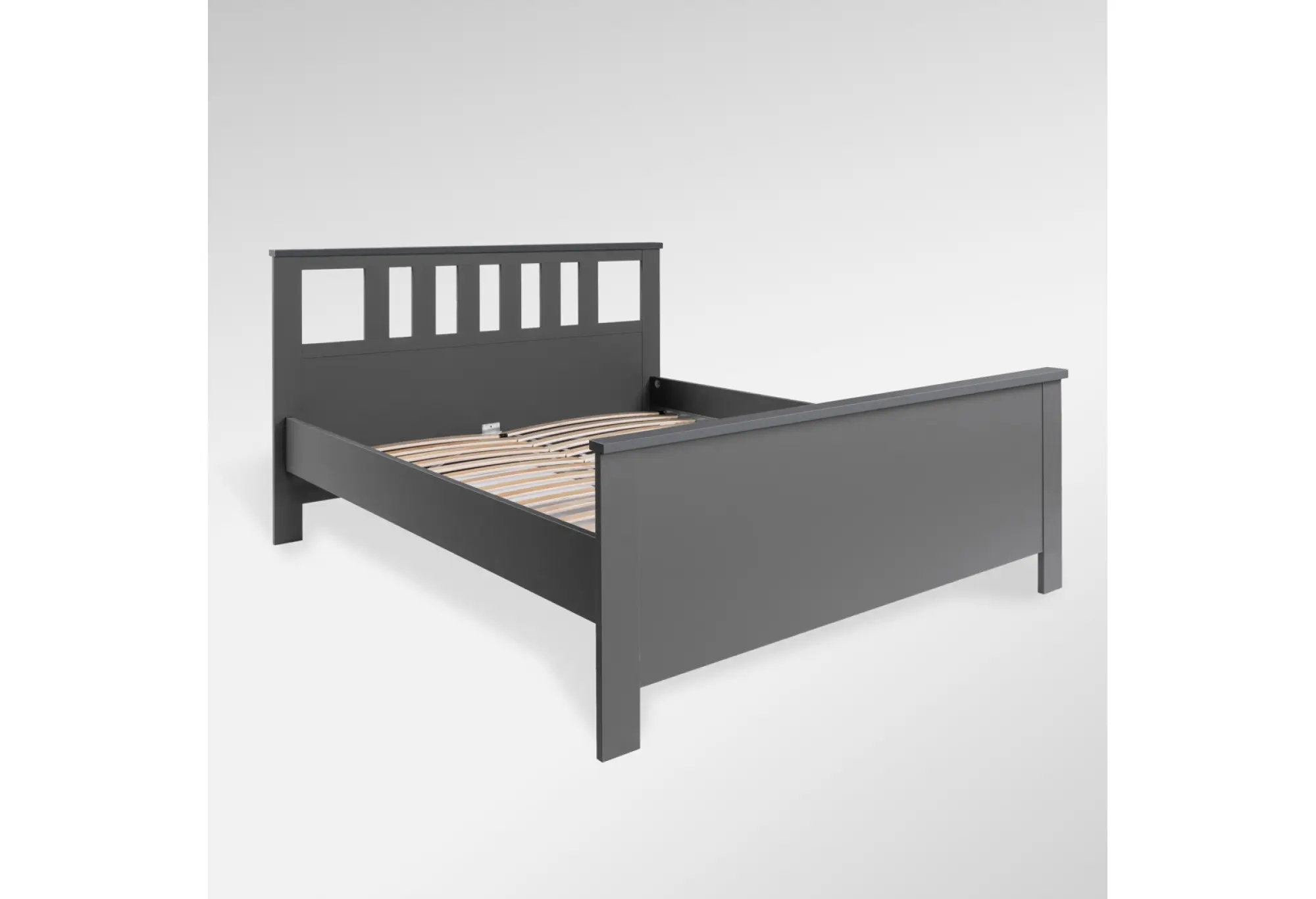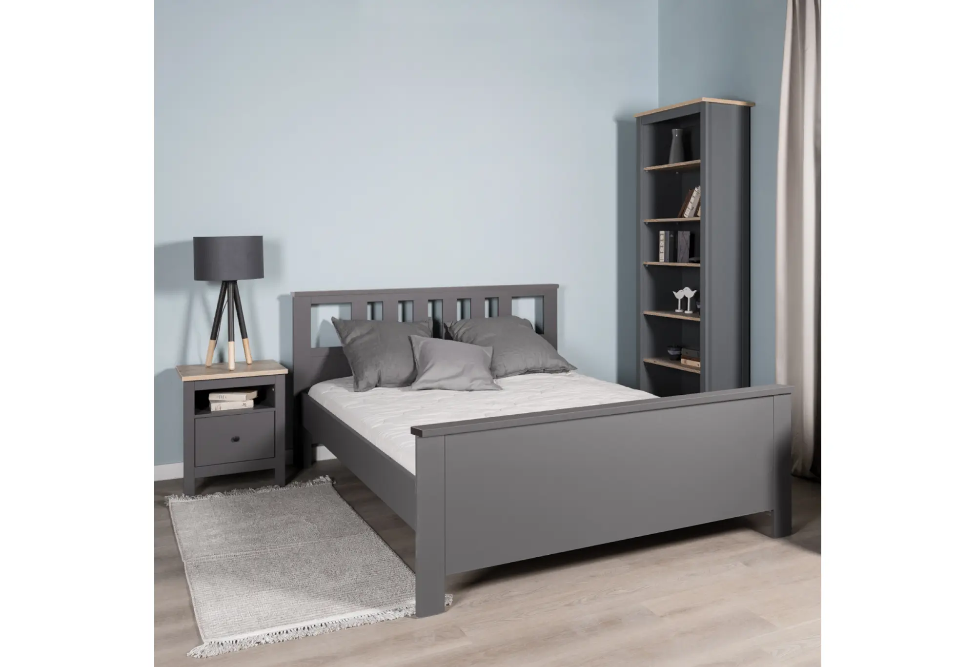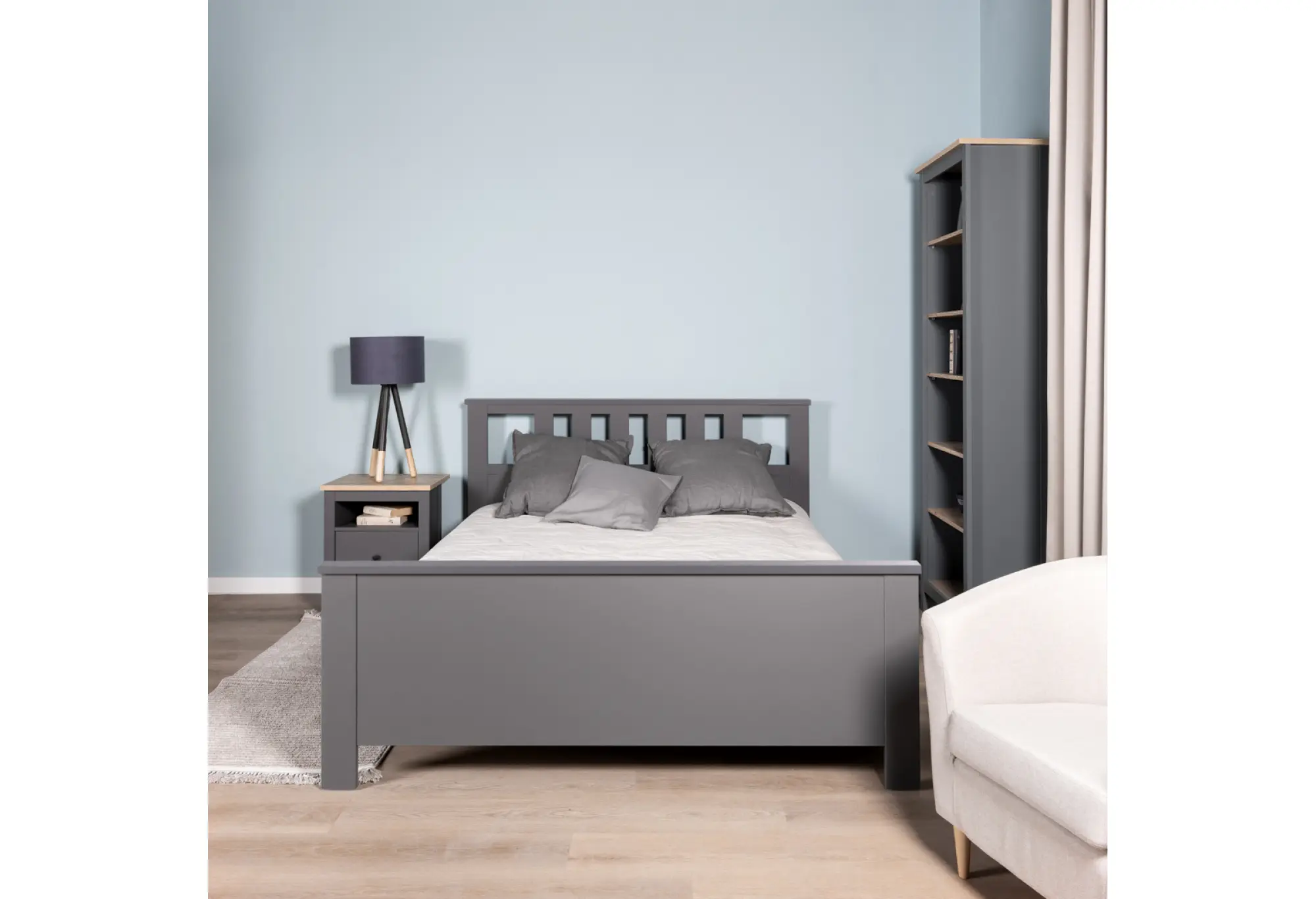 Серый цвет фасадов и корпуса практичен в уходе и визуально структурирует пространство, не перегружая его. Кровать органично сочетается с текстилем любых оттенков — от светлых пастелей до насыщенных темных тонов.