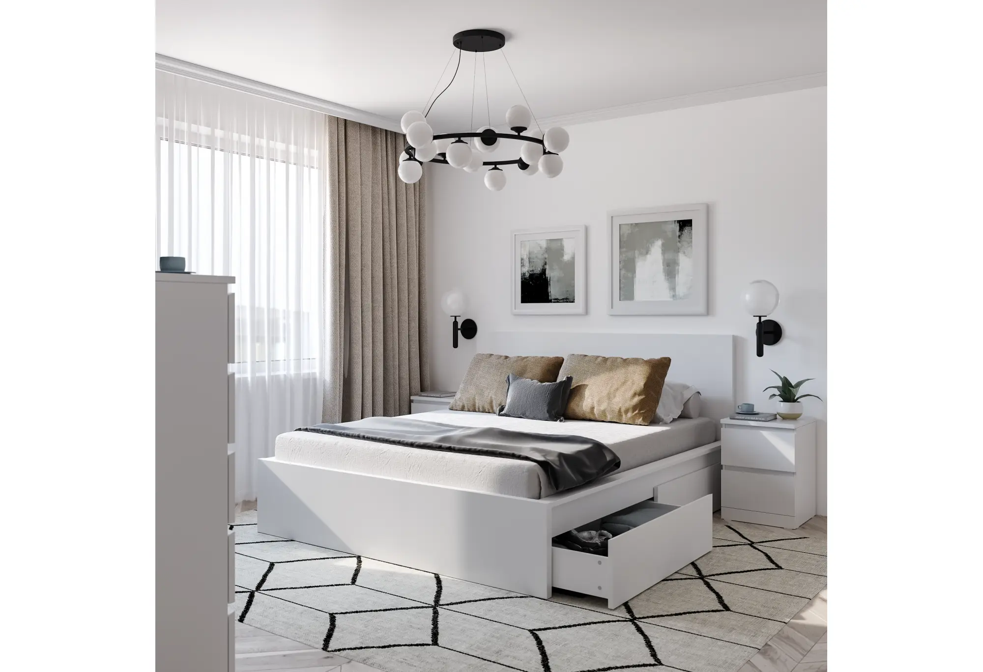 Лаконичная двуспальная кровать в белом цвете органично впишется в современный интерьер спальни и не перегрузит пространство. Прямые линии, высокий изголовье и ровные фасады создают аккуратный, продуманный силуэт, который легко сочетать как с нейтральным текстилем, так и с яркими акцентами.
