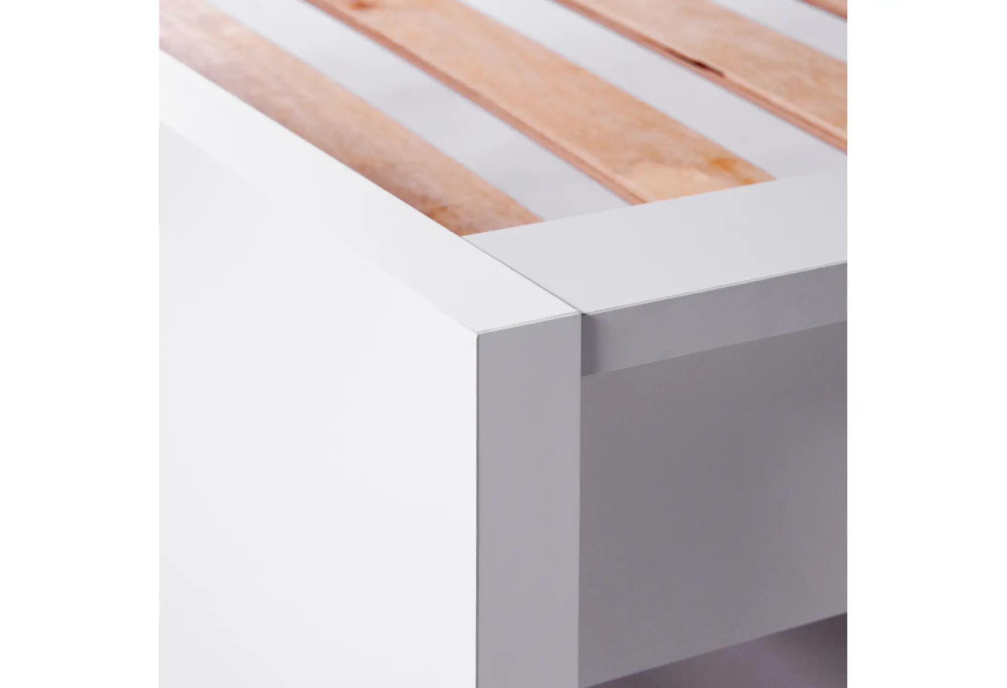 Спальное место 160×200 см подходит для комфортного сна двух человек, не занимая лишних квадратных метров в комнате. В основании предусмотрены ламели, обеспечивающие равномерное распределение нагрузки и поддержку матраса по всей площади. Это помогает сохранить форму матраса и делает отдых более комфортным.