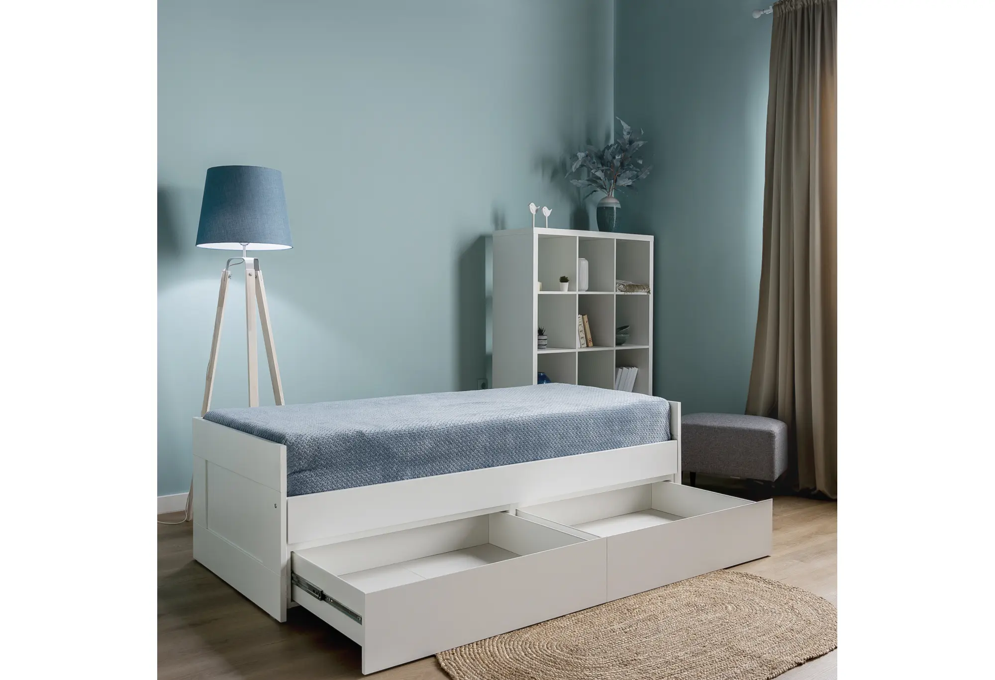 Ортопедическое основание «Лурой» с ламелями поддерживает матрас по всей площади, способствует более равномерному распределению нагрузки и помогает продлить срок его службы. Два выдвижных ящика в нижней части кровати создают дополнительное место для хранения постельного белья, пледов или сезонных вещей, позволяя рационально использовать пространство комнаты.