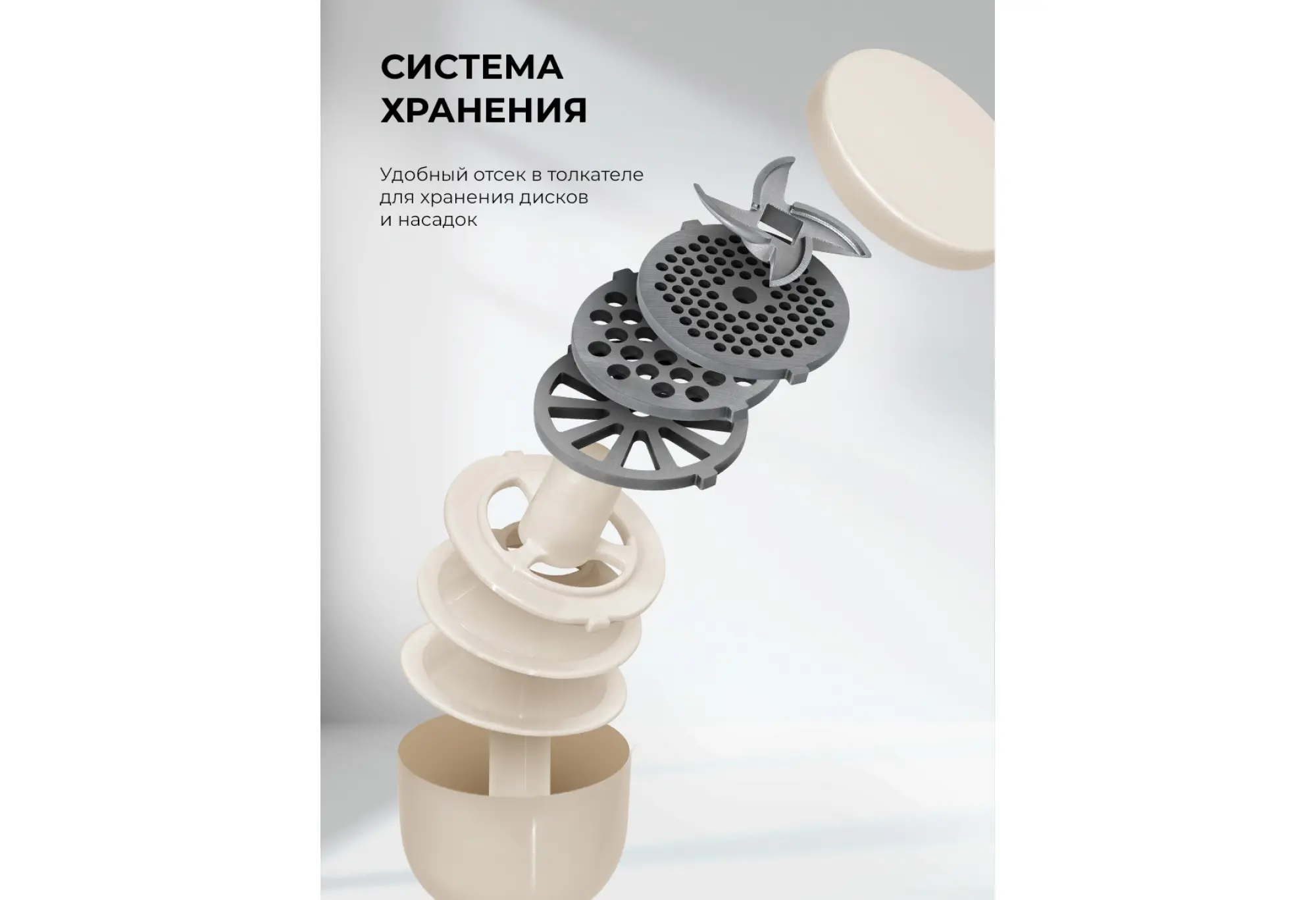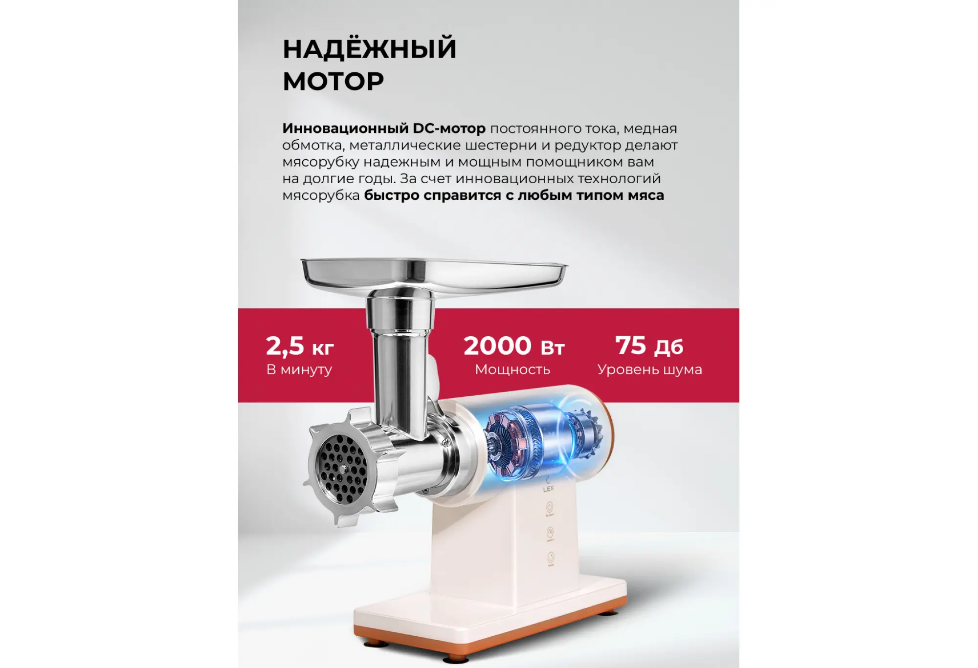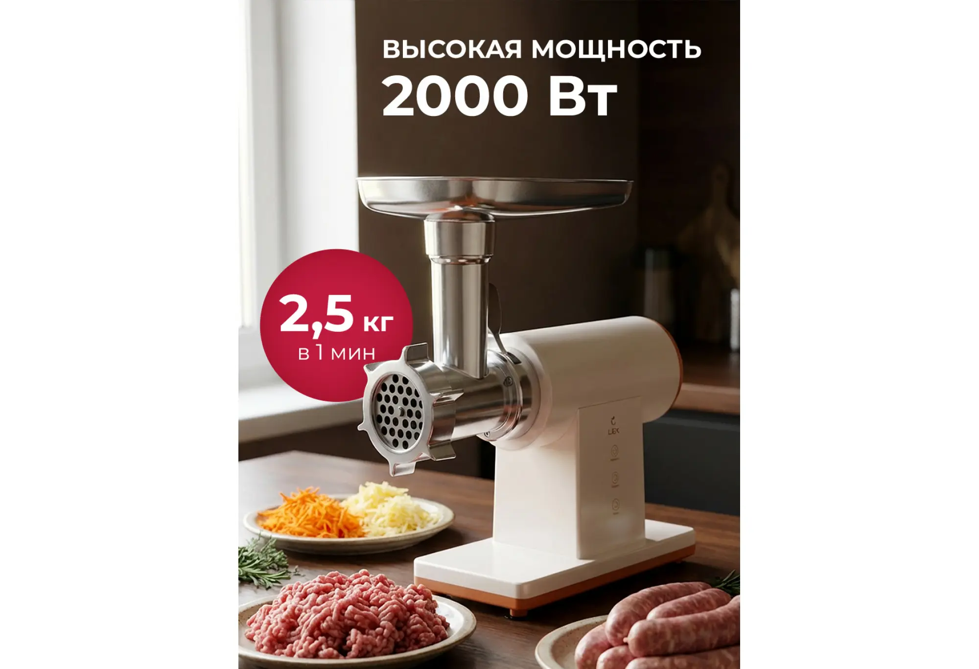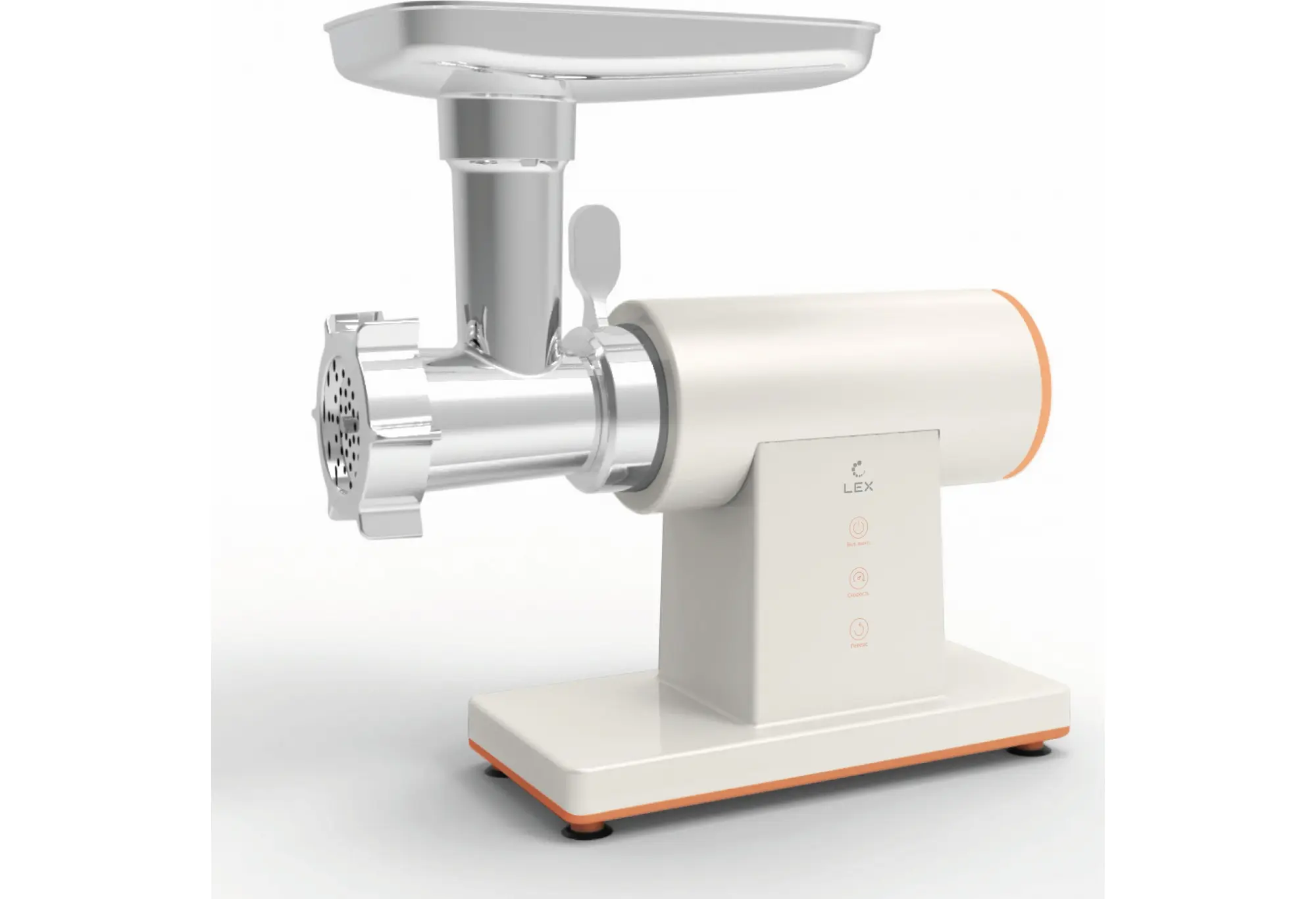 LEX LX4003 PRO – функциональная и продуманная мясорубка для тех, кто часто готовит дома и ценит удобство. Мощность до 2000 Вт позволяет перерабатывать до 2,5 кг продукта в минуту, что подходит как для повседневных блюд, так и для заготовок. Корпус в жемчужно-белом и коралловом цвете аккуратно вписывается в современный кухонный интерьер и не перегружает пространство.
