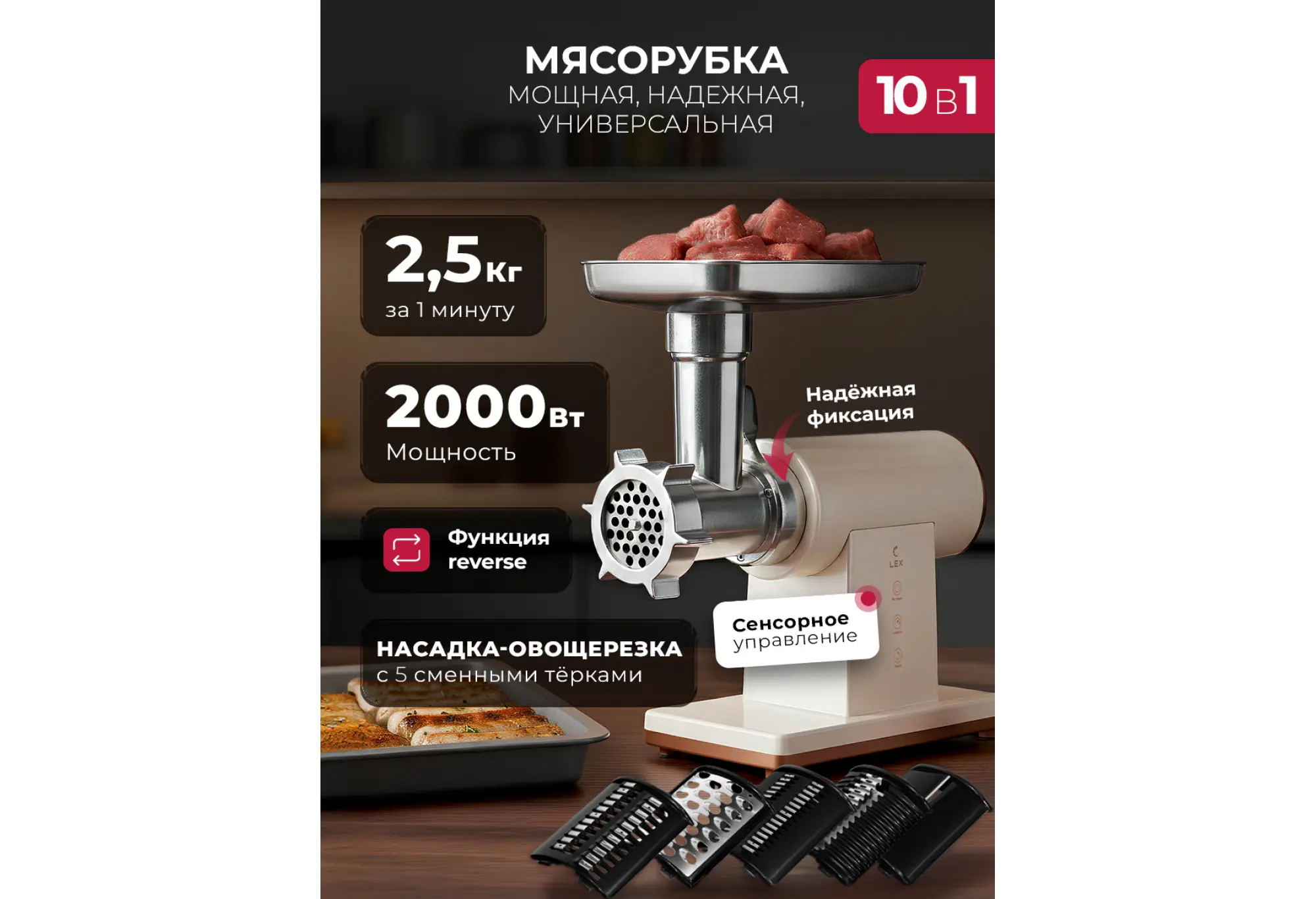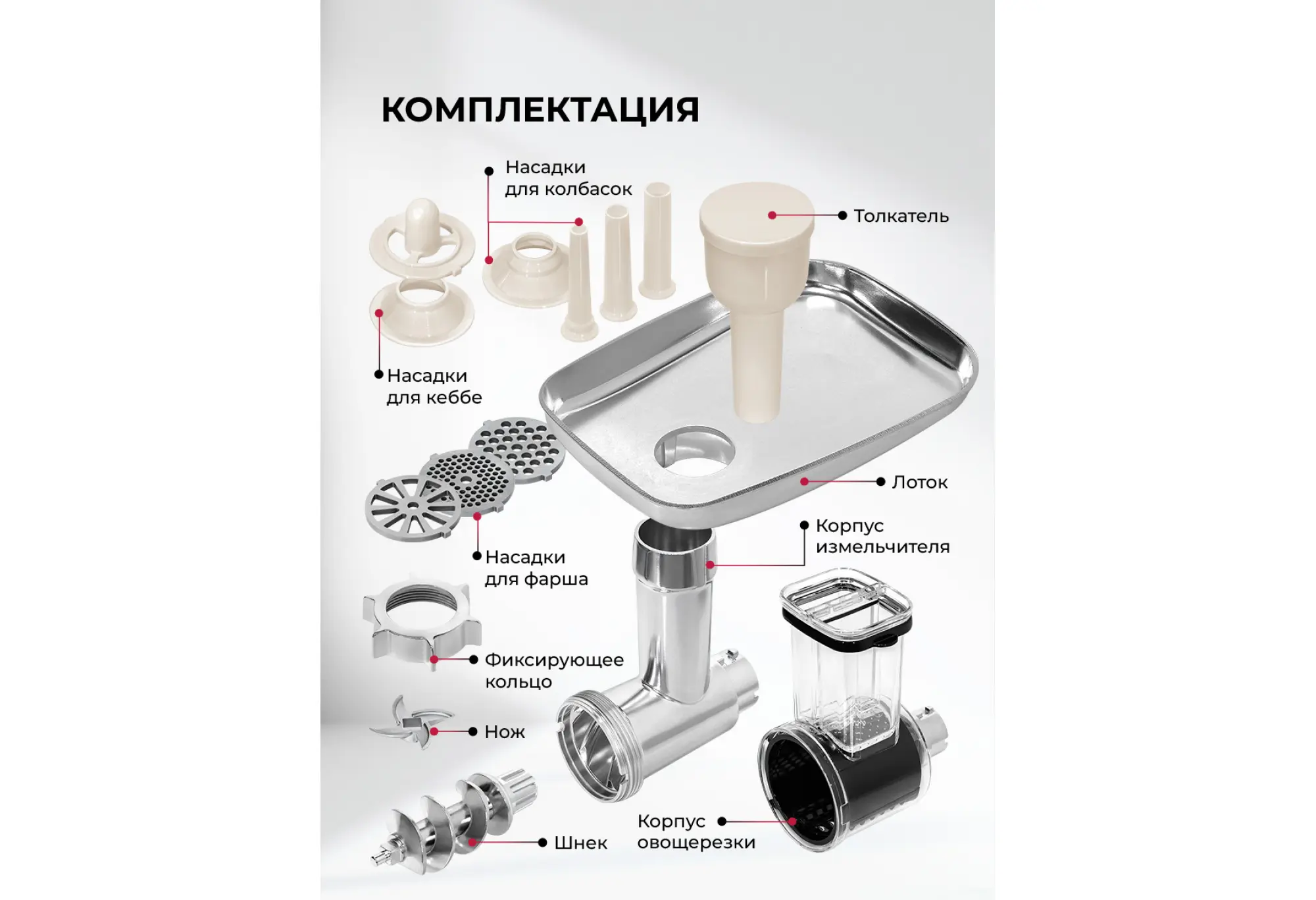 Расширенная комплектация превращает мясорубку в многофункциональный кухонный прибор. Насадка-овощерезка с несколькими тёрками и слайсерами помогает быстро шинковать и нарезать продукты – от крупной и мелкой соломки до тонких ломтиков, включая вариант с рифлением. Насадки для колбасок и кеббе позволяют готовить домашние колбасные изделия и традиционные блюда на собственной кухне, контролируя состав и качество продуктов.