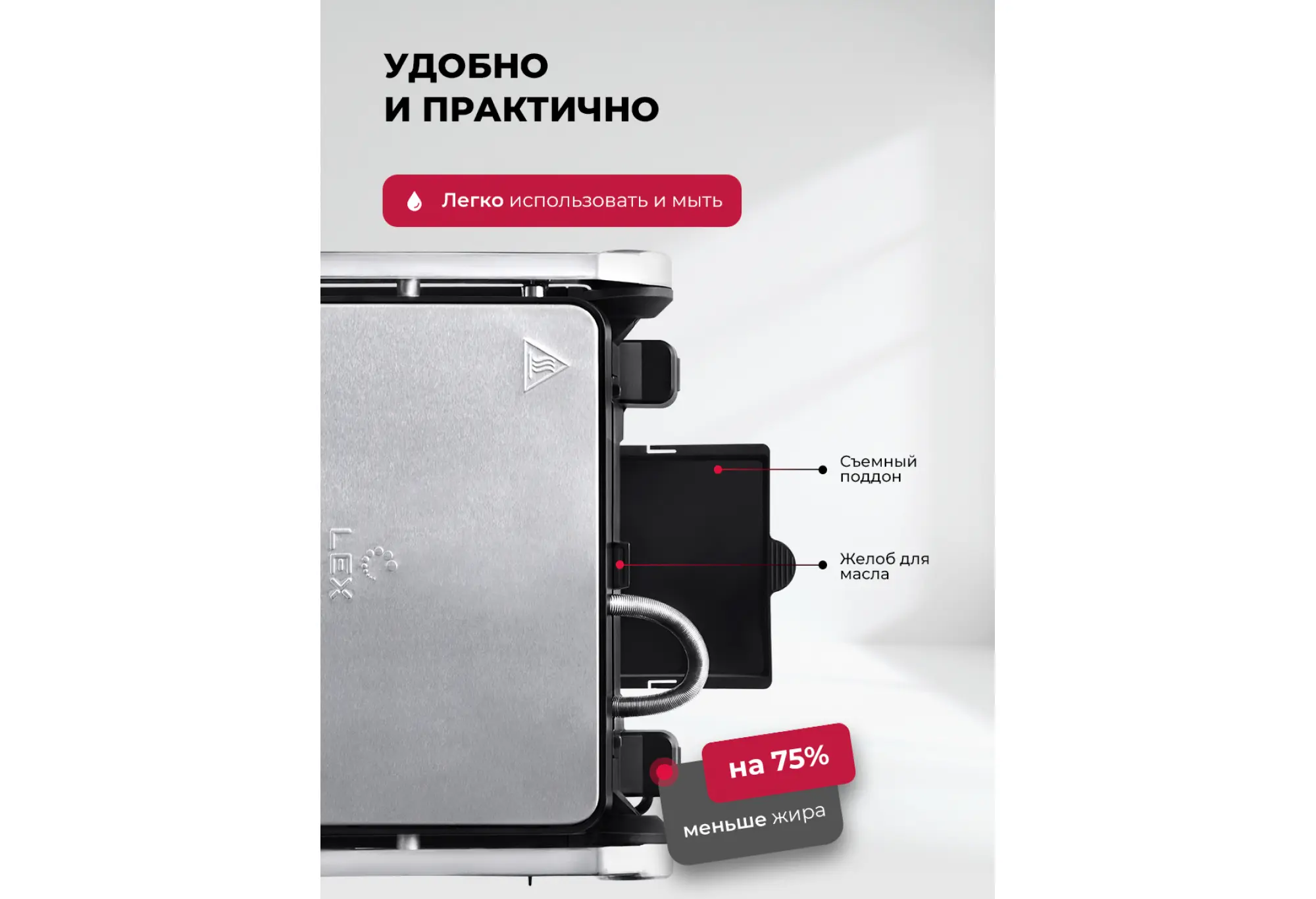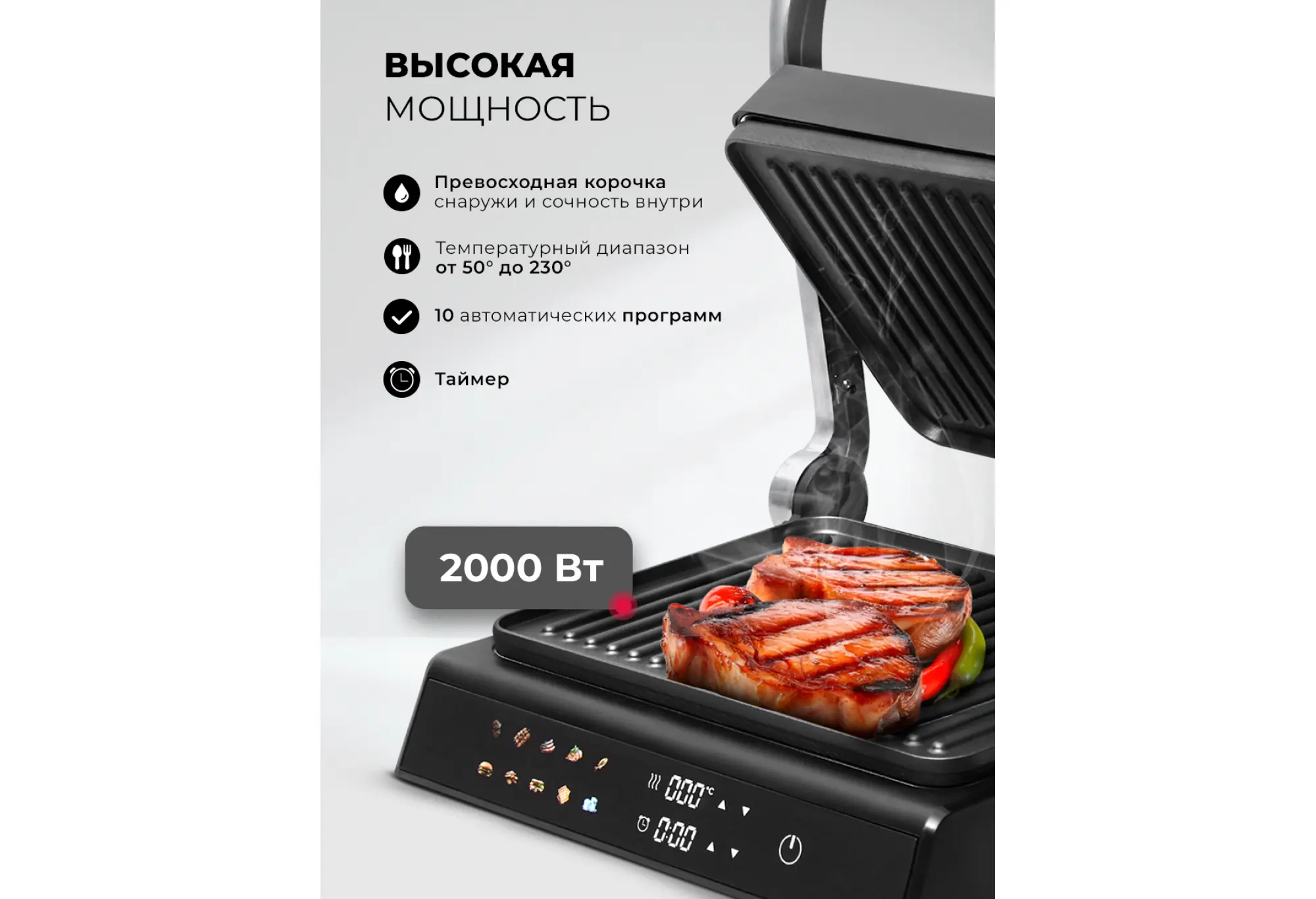 Электрический гриль со съемными панелями с вафельницей LEX LXGR 5007 — это гриль, барбекю и вафельница в одном устройстве.Гриль быстро и равномерно нагревается, обеспечивает нужную температуру приготовления для превосходной корочки снаружи и сочности внутри. Модель имеет 10 автоматических программ, в том числе для приготовления вафель. Сменные панели для них входят в комплект.Максимальная мощность гриля — 2000 Вт, температуру можно выбрать в диапазоне от 50 до 230 °C. Это дает возможность точной настройки под любой рецепт. Вы можете изменить время и температуру приготовления в любом режиме.Рабочие поверхности раскрываются на 180 градусов, что позволяет приготовить блюда в режиме «Барбекю» на двух панелях одновременно. На гриле можно поджарить мясо и овощи, а также приготовить аппетитные вафли на десерт.Панели с антипригарным покрытием позволяют готовить блюда без лишнего масла и жира: они стекают по специальному желобу в поддон.За устройством просто ухаживать: съемный поддон и антипригарные сменные панели легко очищать после использования.Интуитивно понятное сенсорное управление и яркий цветной дисплей обеспечивают простоту и удобство использования, а функция автоматического отключения гарантирует безопасность при длительном приготовлении.