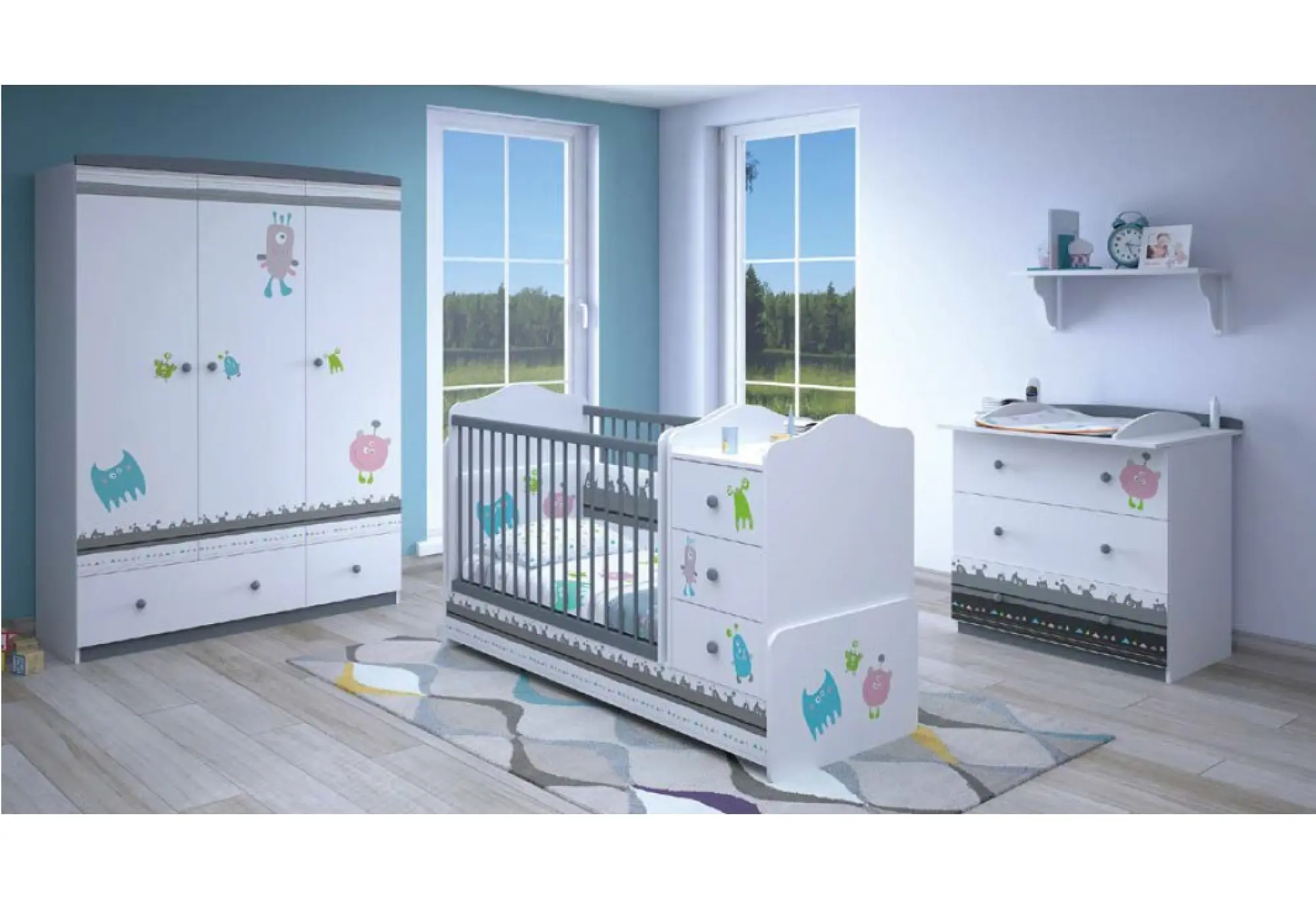 - белый-серый — это коллекция Polini Basic Монстрики с ярким принтом на фасадах в виде монстриков