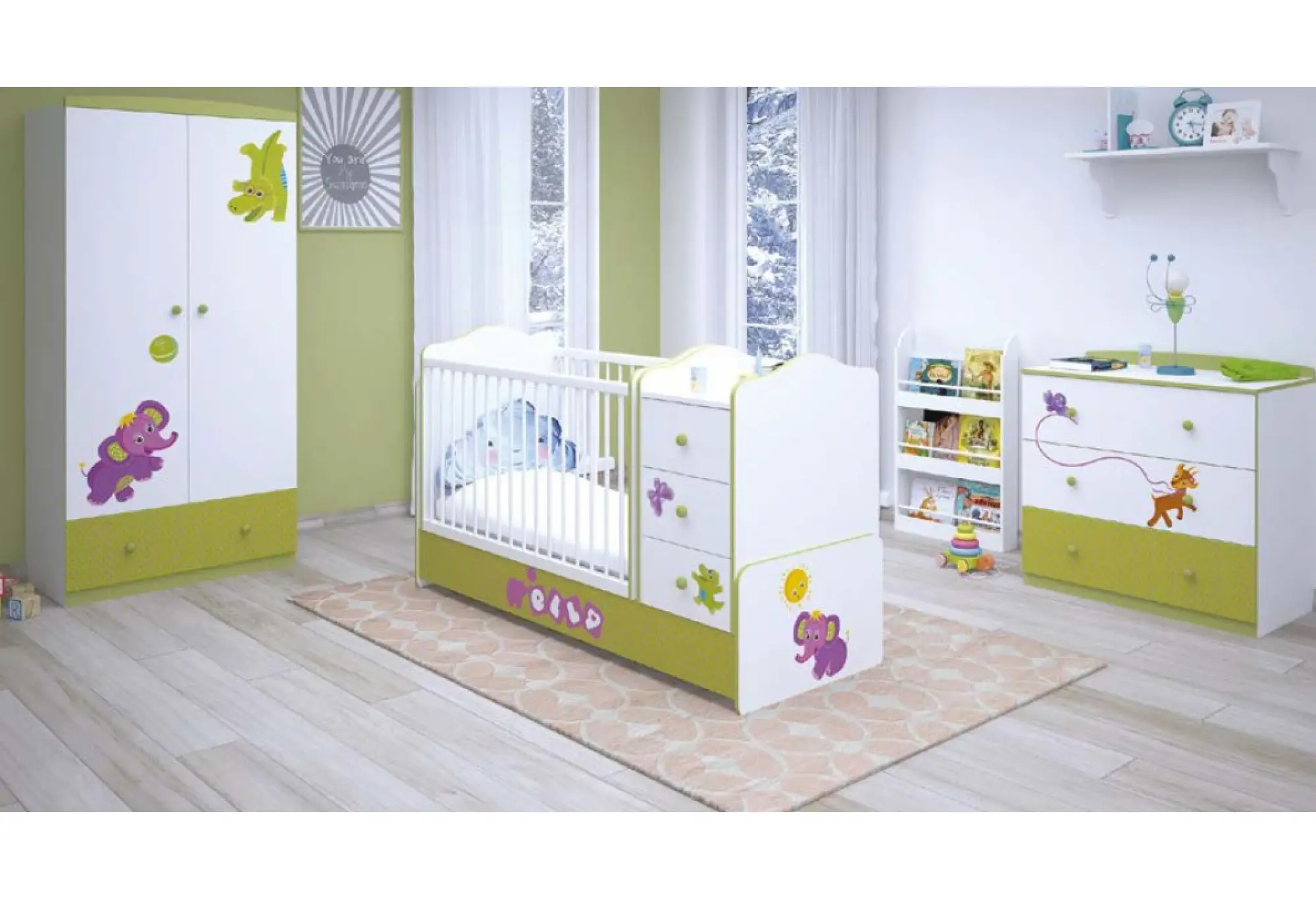 Коллекция Polini kids Basic Элли — это забавный рассказ о слоненке Элли и ее друзьях. Нейтральный зеленый цвет в сочетании с белыми фасадами с зеленой кромкой несет в себе интересную концепцию для яркой и красочной детской комнаты.