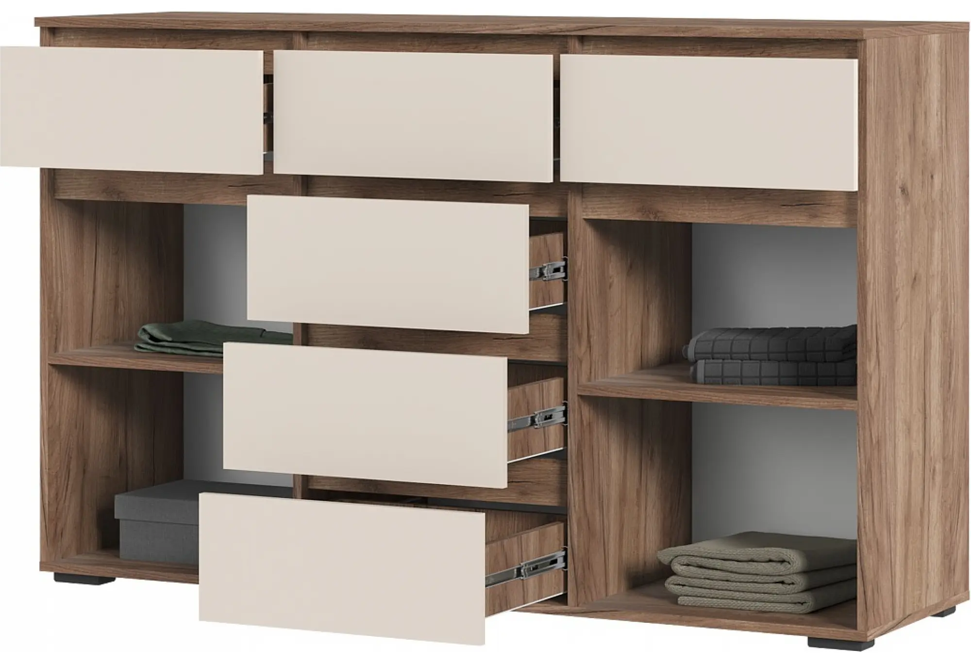 Комод оснащен просторными полками и ящиками на надежных шариковых направляющих, что обеспечивает легкость и плавность их открытия и закрытия. Благодаря компактным размерам и функциональному наполнению, он отлично подойдет для хранения вашей одежды или других вещей, помогая организовать пространство.