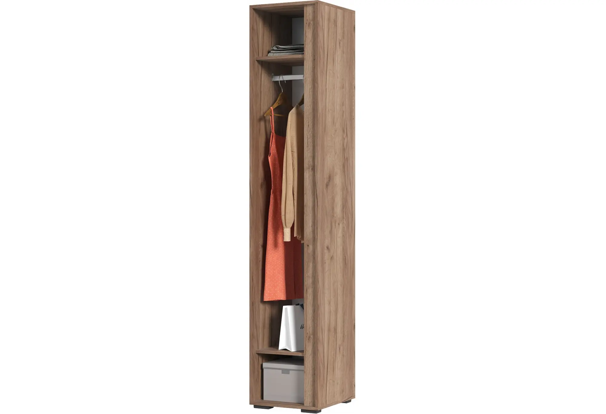 Внутри пенала предусмотрена штанга для верхней одежды, рубашек и других вещей на вешалках. Такое наполнение удобно для узких помещений - одежда располагается аккуратно и остается легко доступной. Пластиковые опоры высотой 20 мм обеспечивают устойчивость конструкции и помогают защитить нижнюю кромку корпуса от прямого контакта с полом.