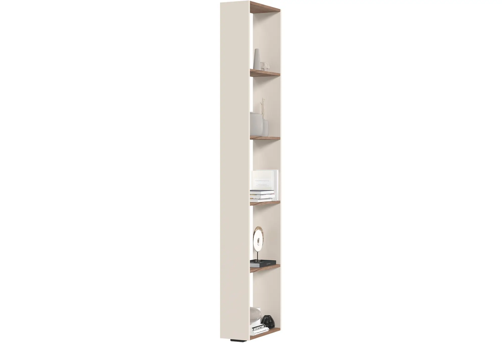 Узкий стеллаж СТЛ 01 «Хелен» выполнен в современном скандинавском стиле. Высокая конструкция высотой 2100 мм и глубиной 460 мм при ширине всего 200 мм позволяет разместить его в ограниченном пространстве в нише, между мебелью или вдоль стены, не перегружая интерьер. Открытые полки образуют вертикальную систему хранения для книг, декора и повседневных вещей, поддерживая визуальную легкость помещения. ЛДСП служит основным материалом изделия, обеспечивая геометрию и устойчивость стеллажа. Пластиковые опоры высотой 20 мм приподнимают корпус над полом и помогают защитить нижнюю часть от случайных контактов с уборочным инвентарем. Нейтральная гамма в сочетании с теплым древесным оттенком органично вписывается в большинство современных интерьеров квартиры или офиса.