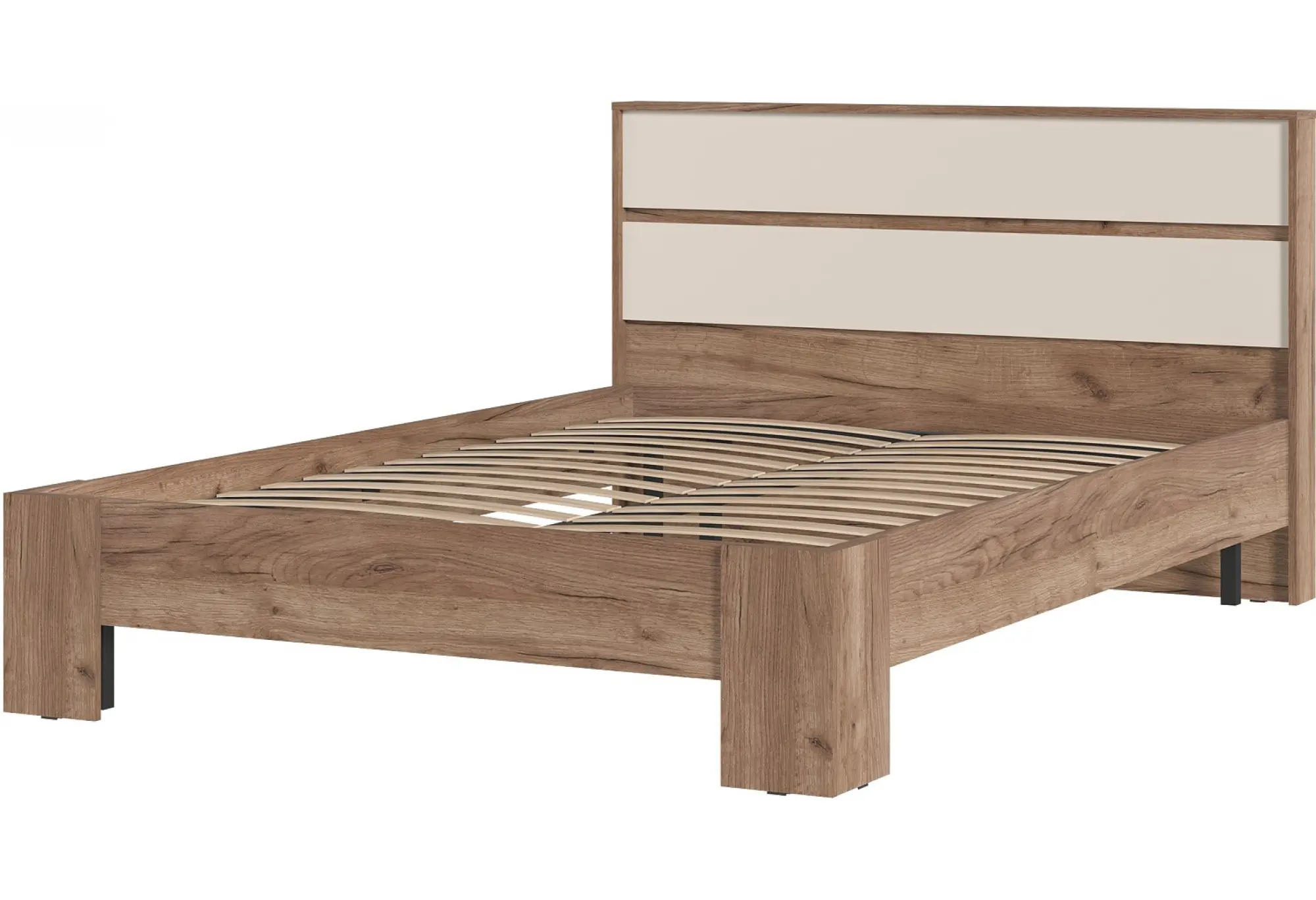 Ширина 1470 мм и глубина 2114 мм обеспечивают комфортное размещение матраса без лишнего выступа каркаса, при этом высота 928 мм позволяет изголовью оставаться заметным элементом интерьера. Прямые массивные опоры по периметру добавляют конструкции визуальную надежность. Основание выполнено из ряда ламелей, предназначенных для укладки матраса (матрас приобретается отдельно), что способствует равномерному распределению нагрузки. Нейтральная серо-древесная палитра легко сочетается с другими элементами мебели и текстилем в спальне.