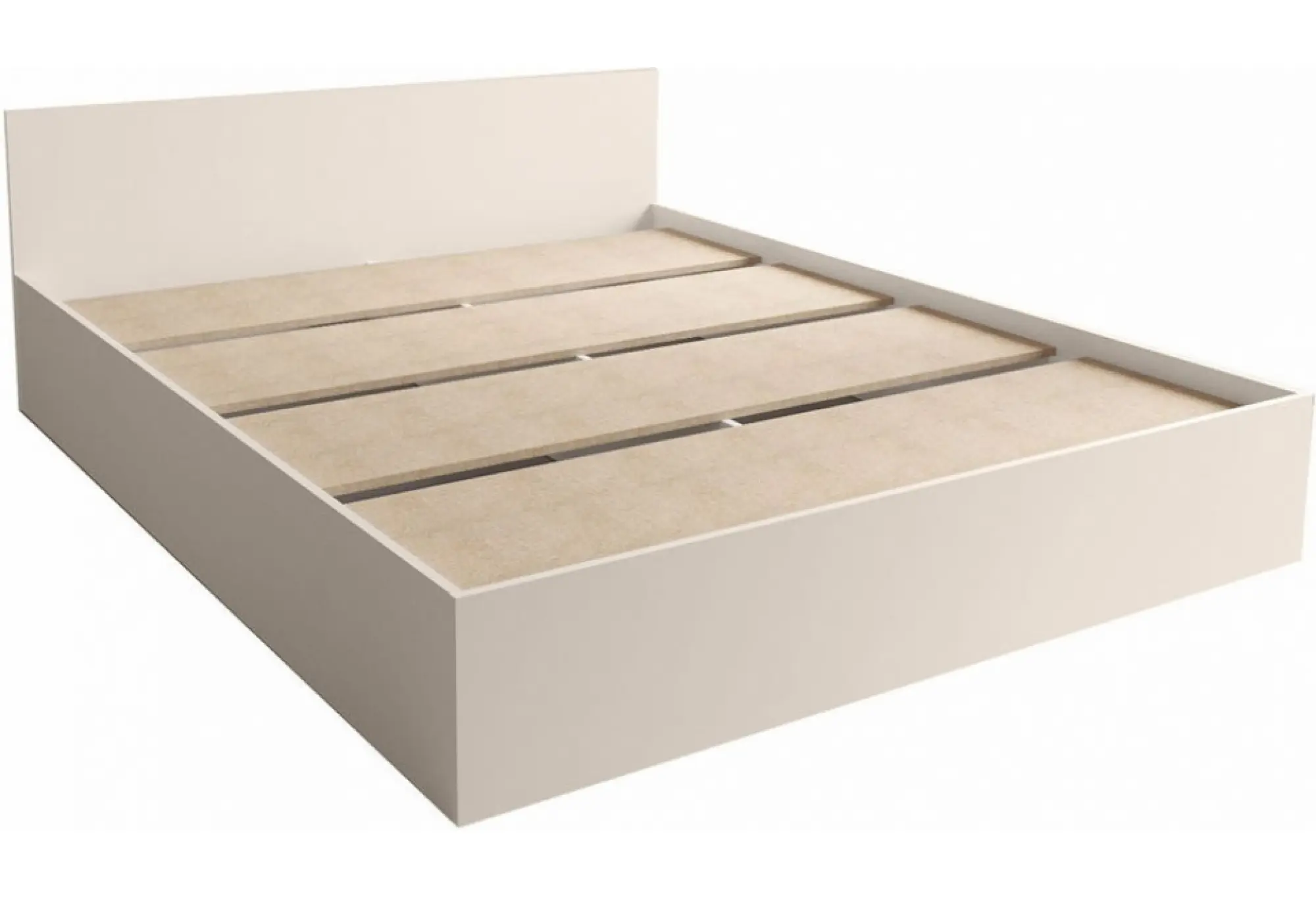 Корпус кровати опирается по периметру на сплошные боковые и торцевые панели, что визуально делает конструкцию монолитной. Основание под матрас выполнено в виде нескольких широких опорных плит из ЛДСП, равномерно распределяющих нагрузку по всей площади спального места. Такое решение обеспечивает устойчивость конструкции и снижает риск точечных прогибов матраса.