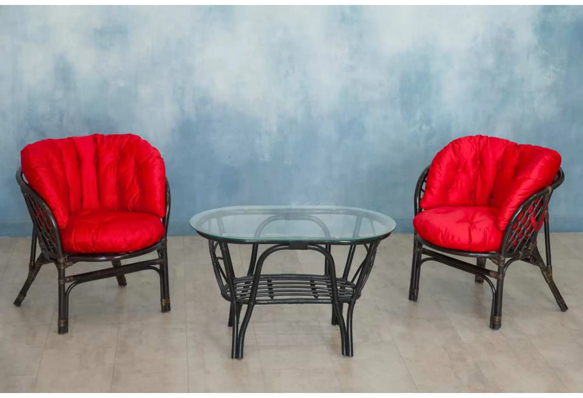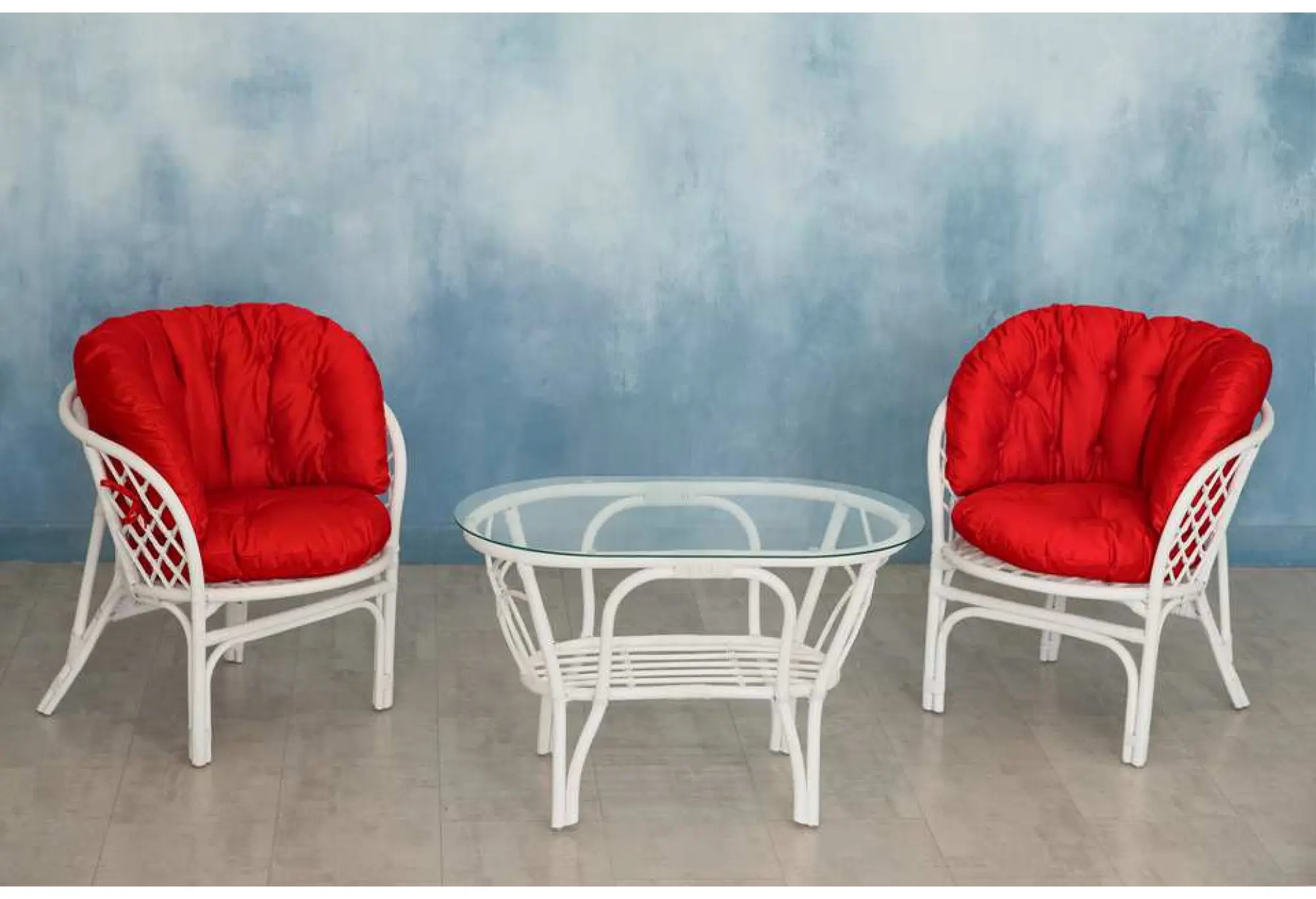 — В набор входят два удобных кресла с мягкими подушками и стильный круглый столик с прозрачной стеклянной столешницей.