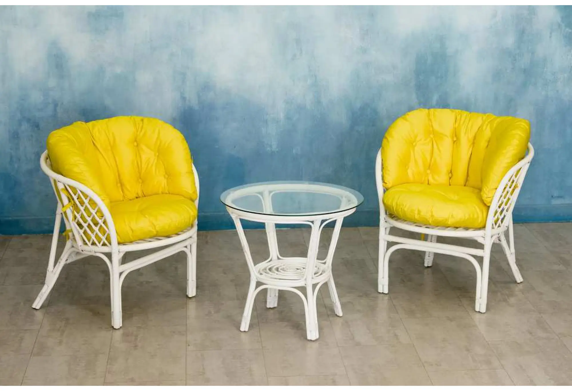 — В набор входят два удобных кресла с мягкими подушками и стильный круглый столик с прозрачной стеклянной столешницей.
