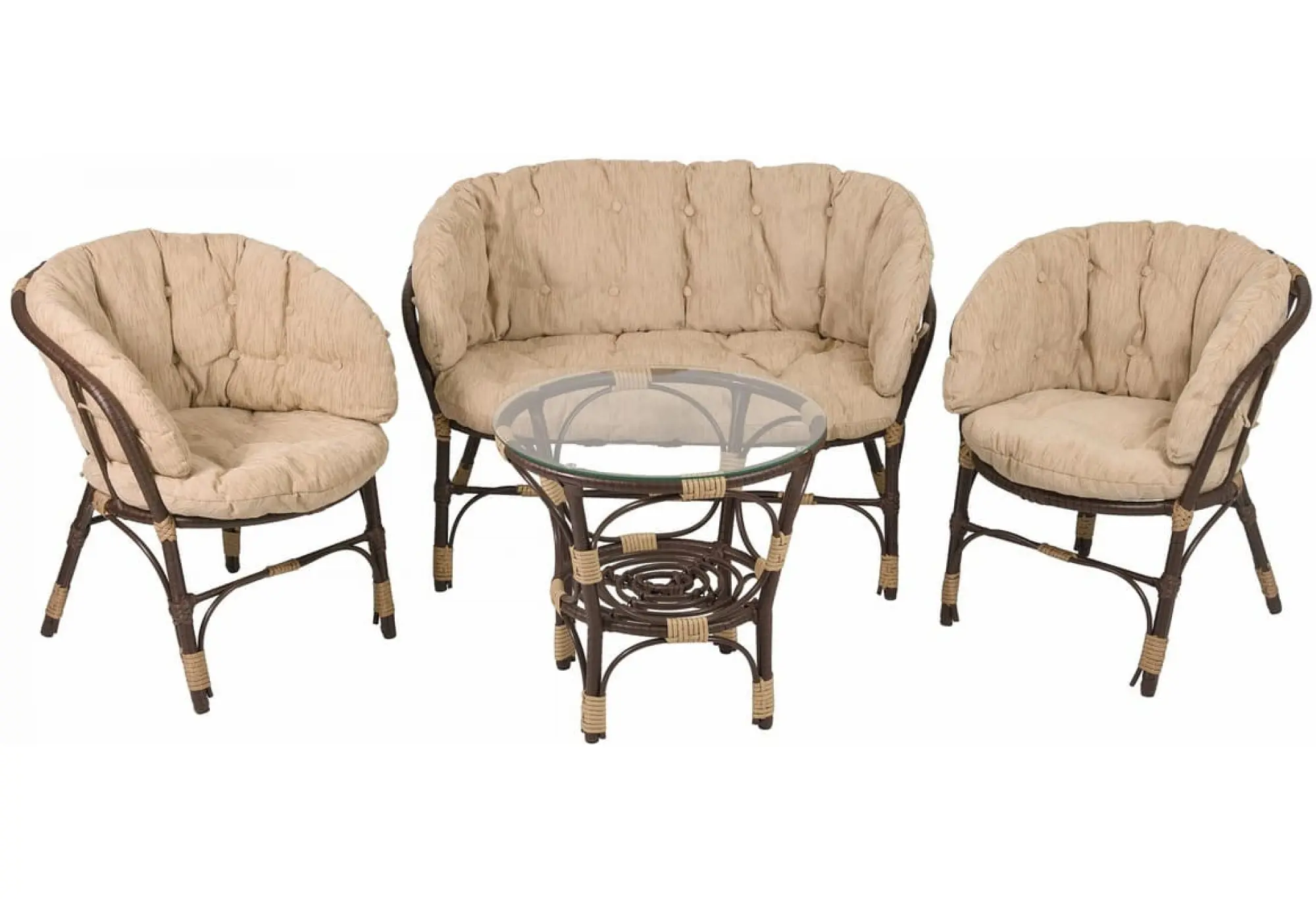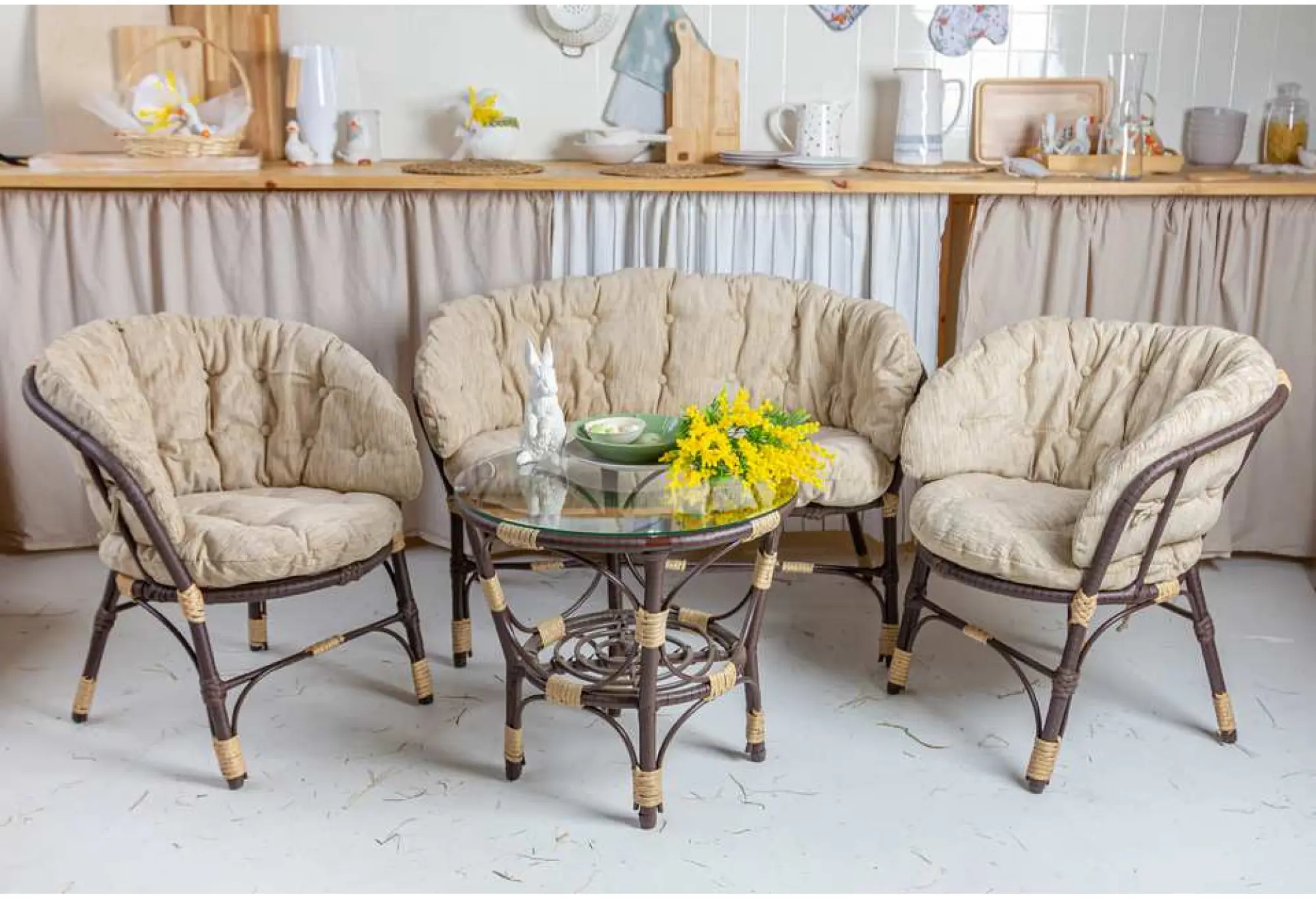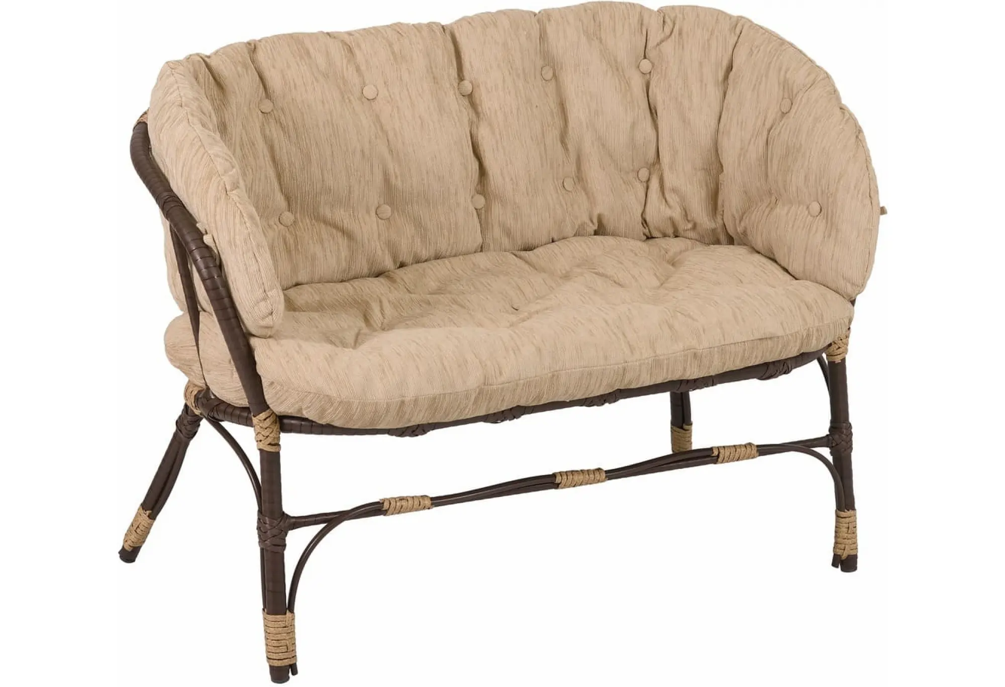 Двухместный диван из искусственного ротанга с удобной мягкой бежевой подушкой станет отличным выбором для обустройства вашего дачного участка, будь то терраса, открытая веранда, внутренний дворик или сад. Его размеры составляют всего лишь 115×70×75 сантиметров, позволяя гармонично вписаться даже в ограниченное пространство.