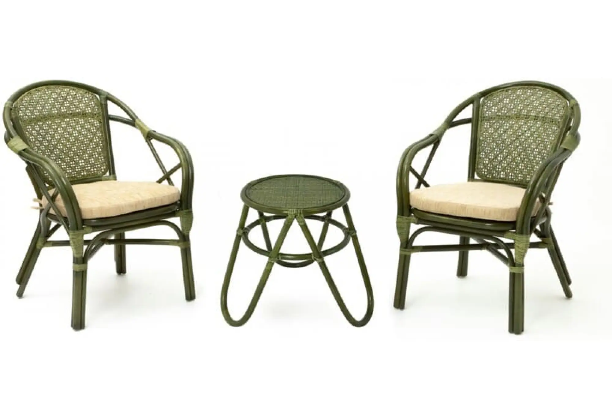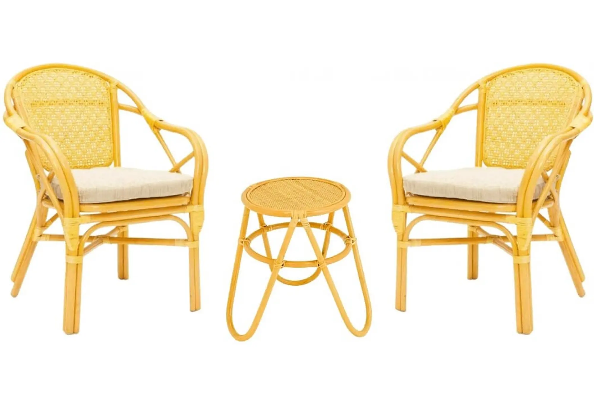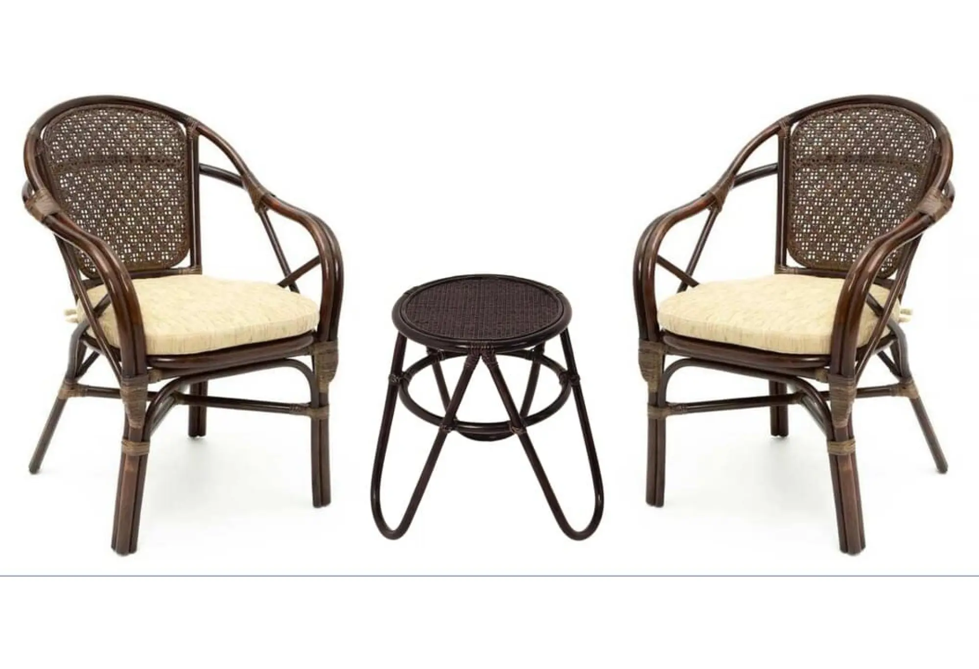 Компактный кофейный комплект из натурального ротанга класса А включает в себя столик Киви диаметром 45 см и два кресла Петани с красивой плетеной спинкой.