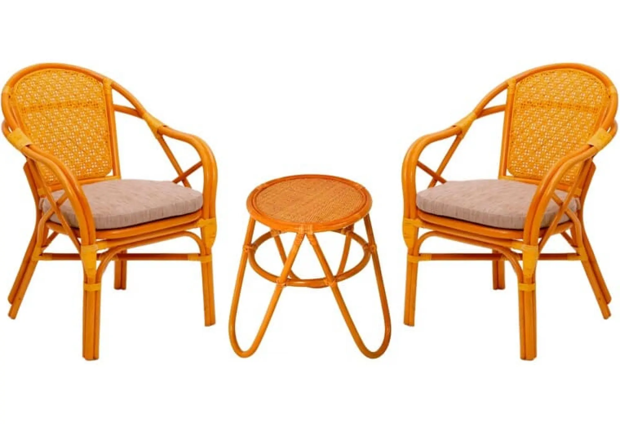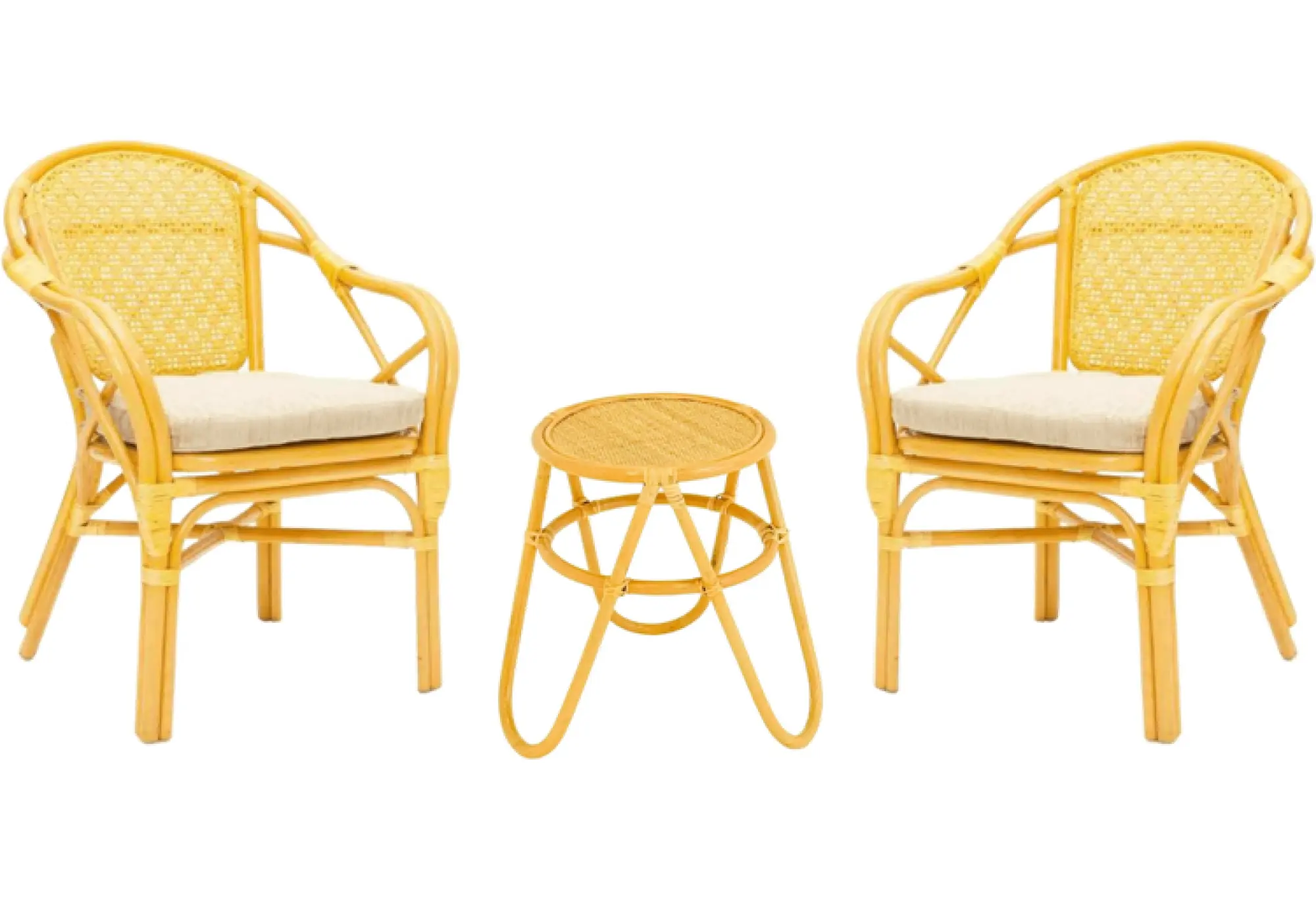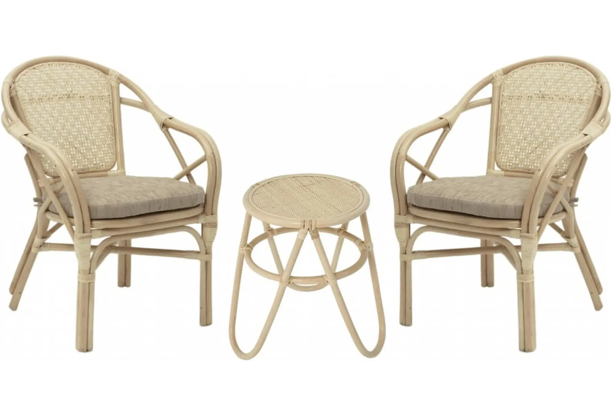 Компактный кофейный комплект из натурального ротанга класса А включает в себя столик Киви диаметром 45 см и два кресла Петани с красивой плетеной спинкой.