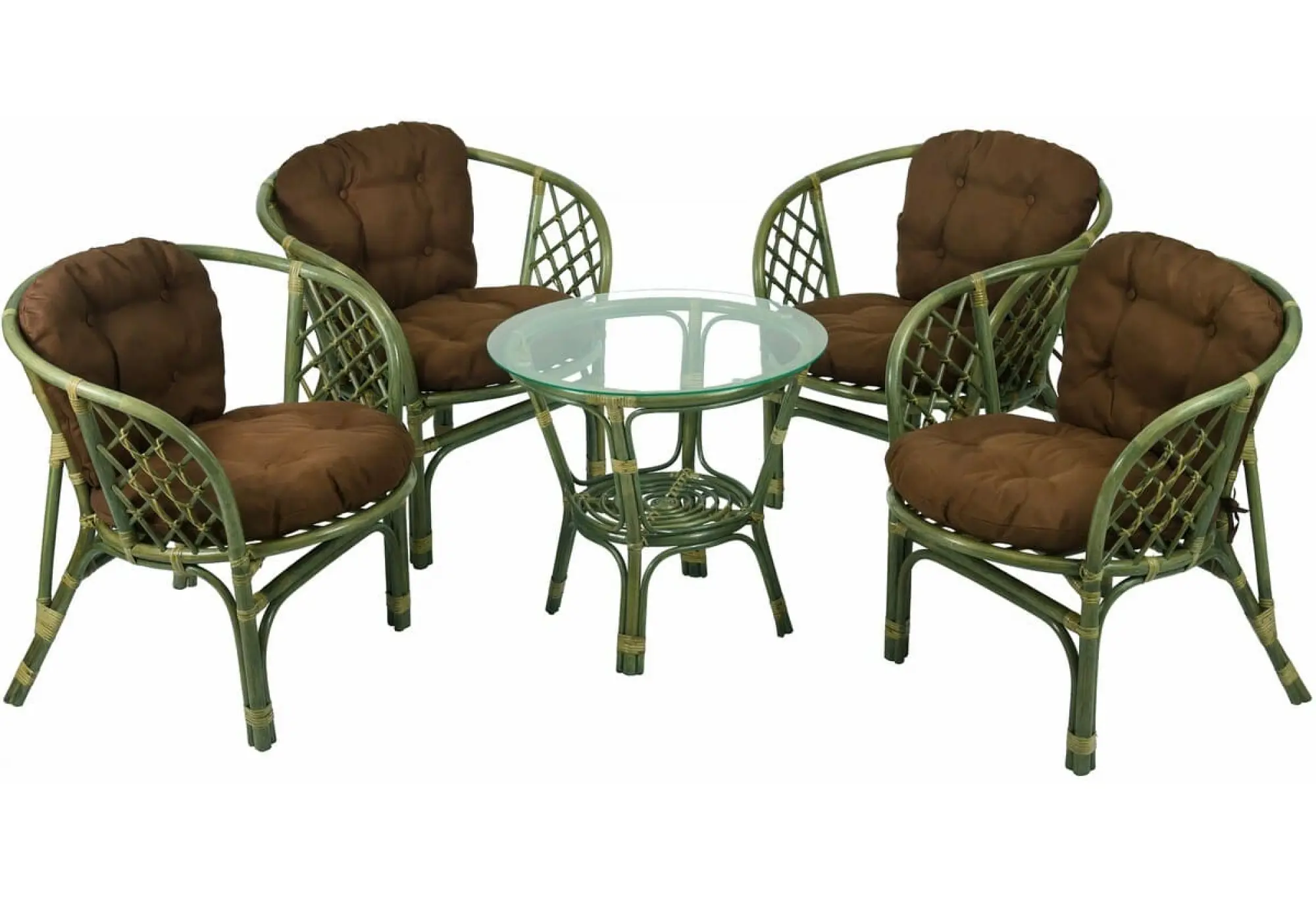 Комплект «Багама» из натурального ротанга станет прекрасным дополнением вашего сада или патио благодаря своему изысканному дизайну и натуральным материалам. Изготовленный вручную в Индонезии, набор включает круглый столик и четыре кресла, окрашенные в приятный оттенок, подчеркнутый удобными коричневыми подушками для сидений.