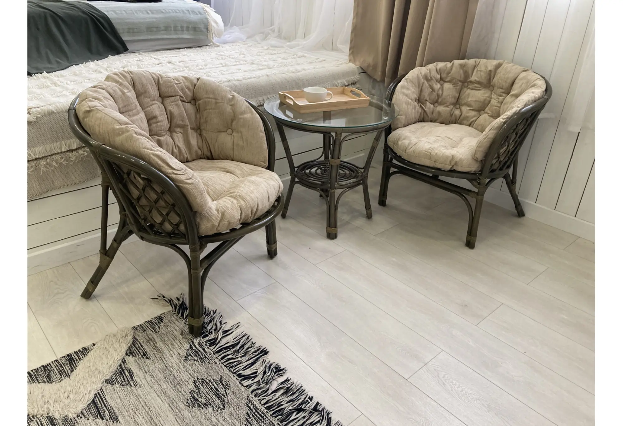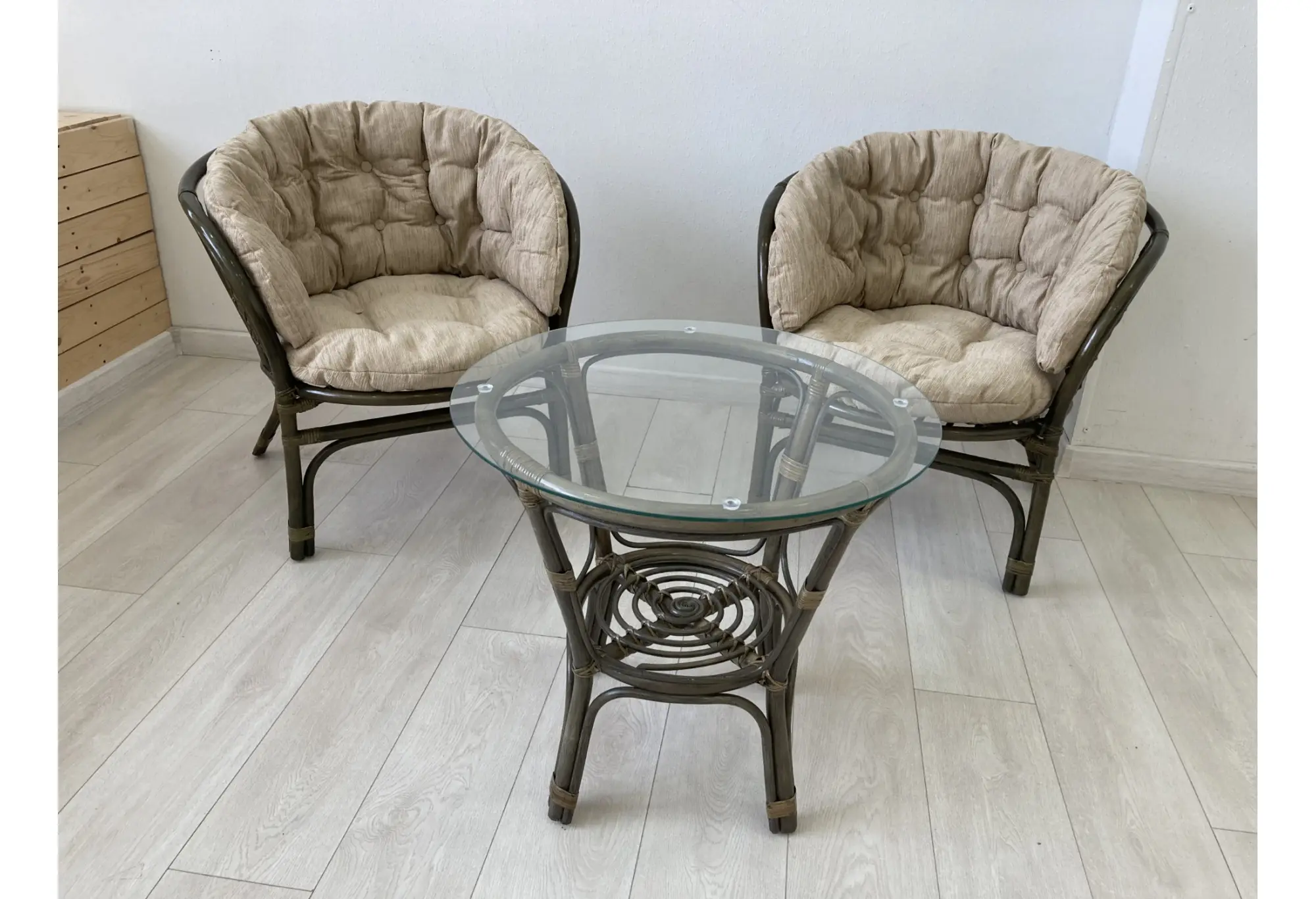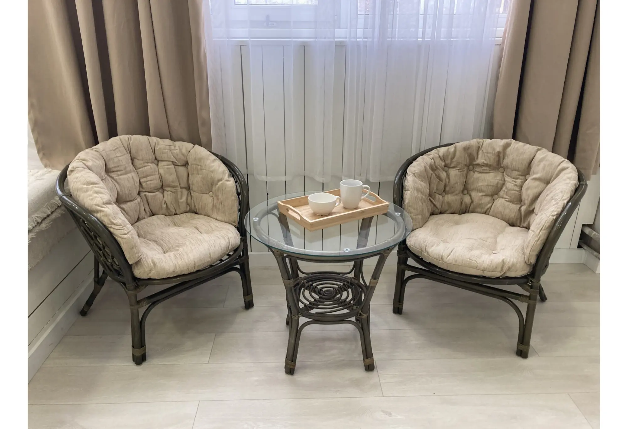 В набор входят два удобных кресла с подушками и круглый стеклянный столик. Стеклянная поверхность надежно фиксируется с помощью присосок, обеспечивая устойчивость конструкции.