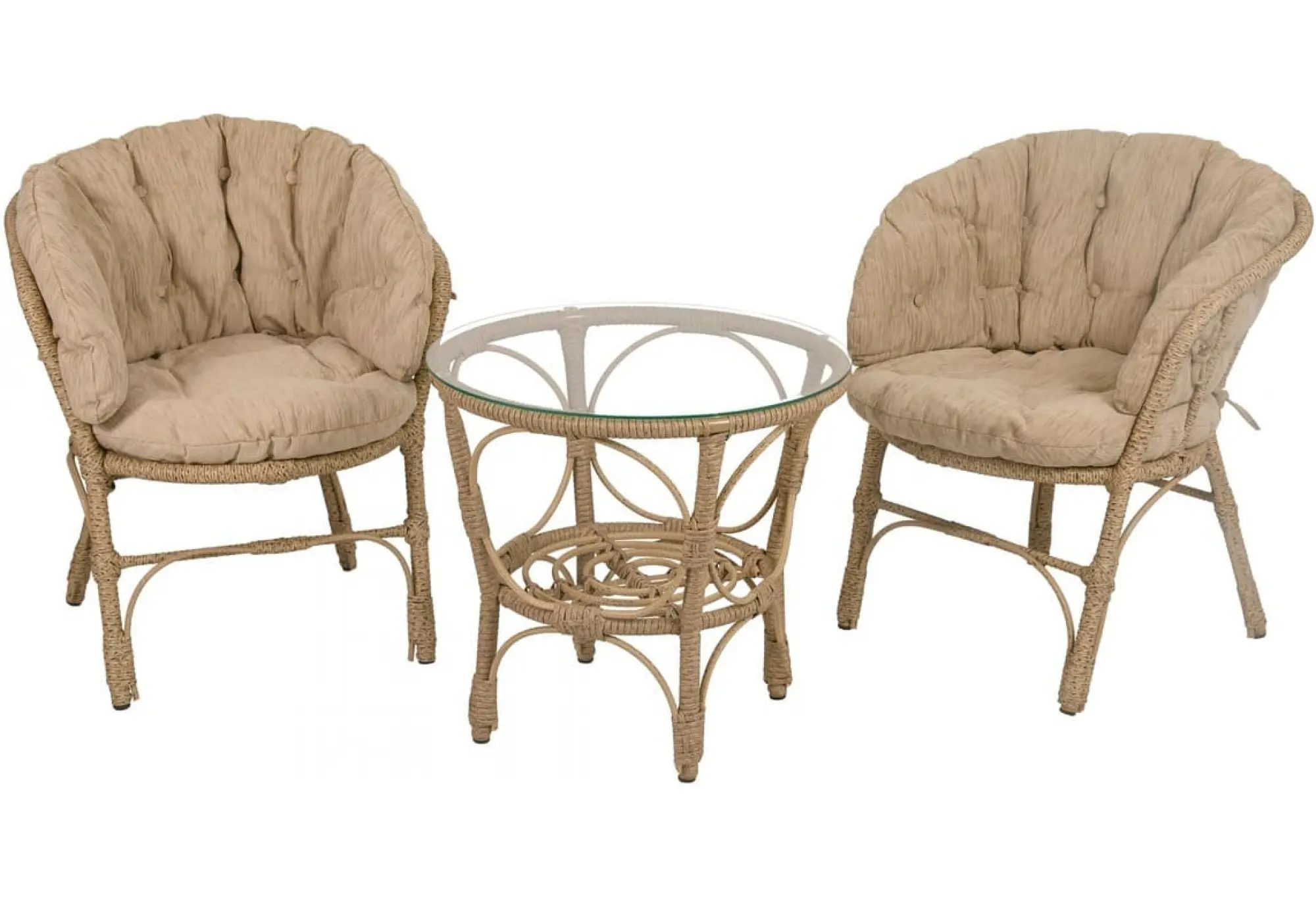 Каркас кресел выполнен из сталь с полимерным покрытием, а плетение — прочный искусственный ротанг, который отличается долговечностью и устойчивостью к воздействию погодных условий. Мягкие подушки обеспечивают комфорт и удобство при использовании.