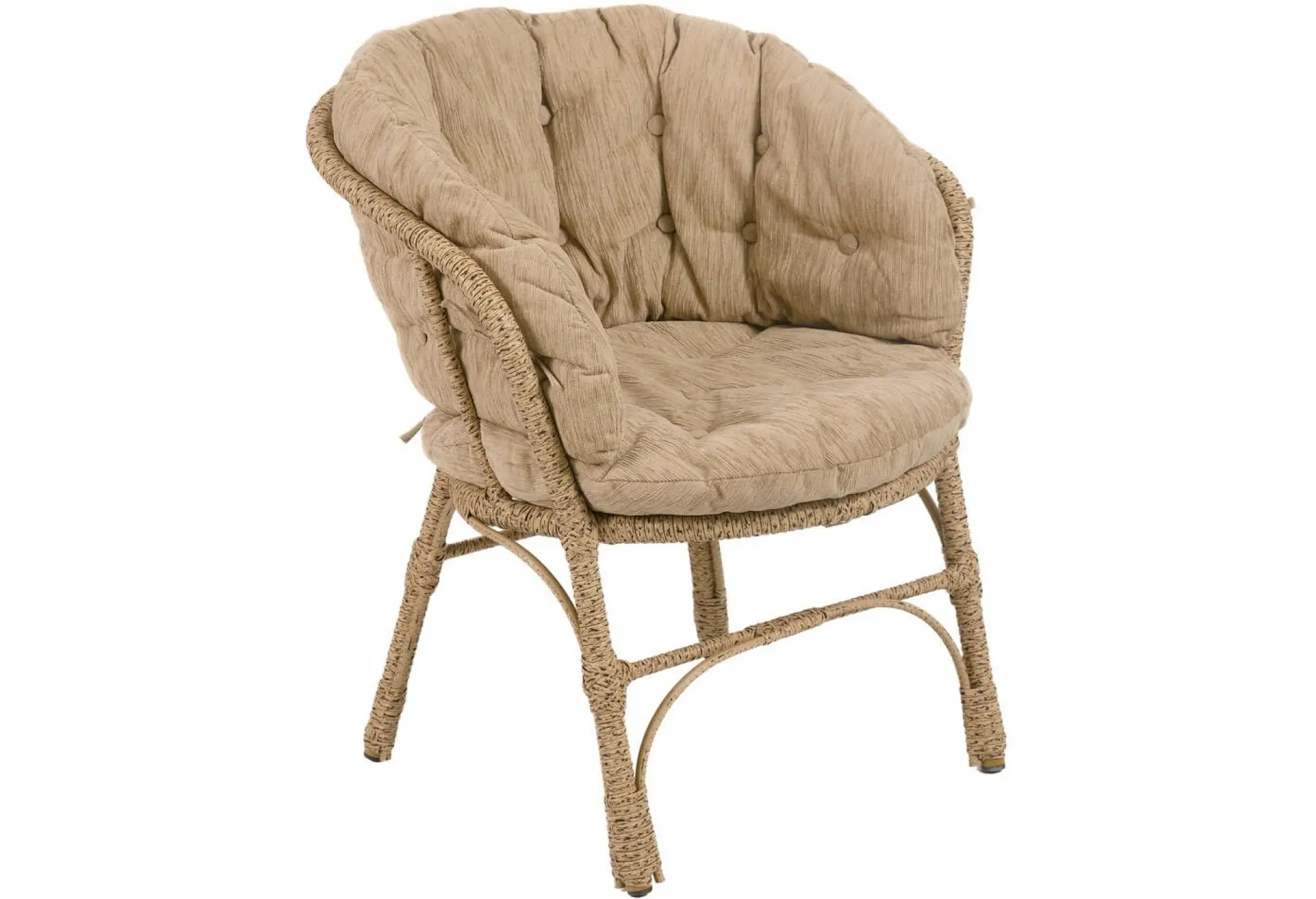 Кресла имеют округлую форму спинки и сиденья, создавая удобную посадку для длительного отдыха. Мягкие бежевые подушки визуально облегчают композицию и улучшают комфорт, их легко снимать при необходимости. Стол оснащен круглой столешницей оптимального диаметра для размещения напитков, посуды и небольших закусок. Небольшая высота стола способствует комфортному общению, не загромождая пространство.