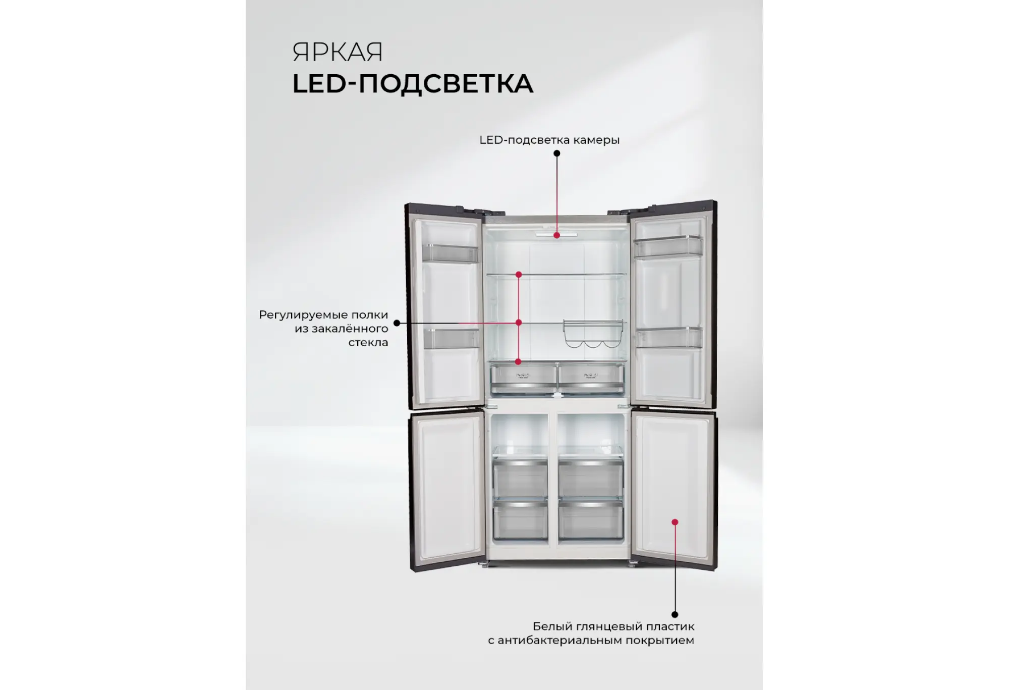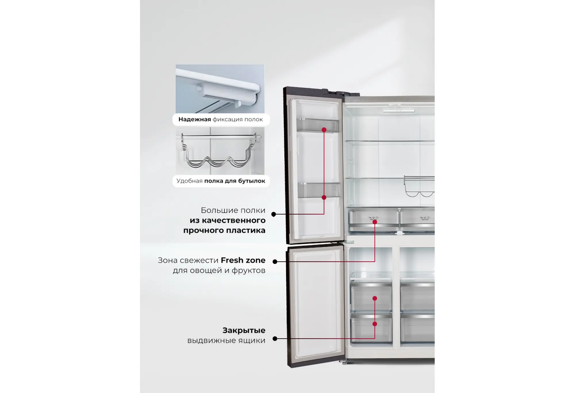 В холодильной камере предусмотрены 2 полки и 2 выдвижных ящика для хранения овощей, фруктов и свежих продуктов. В морозильной камере – 4 удобных выдвижных отсека для заморозки и длительного хранения. Электронное управление размещено на фасаде и позволяет быстро выбирать режимы и контролировать параметры работы. Есть звуковой сигнал при открытой двери, что помогает избежать перегрева камеры и лишнего расхода энергии.