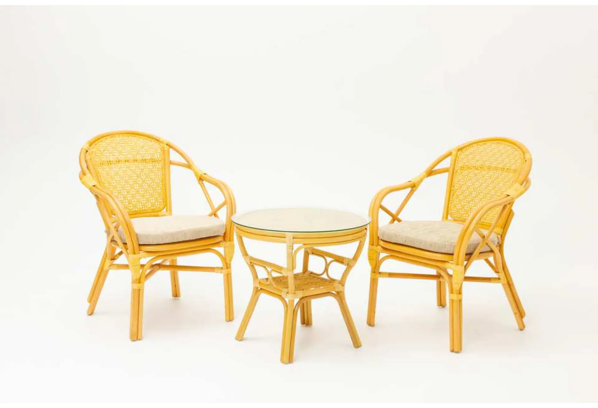 Мебель изготовлена в Индонезии, славящейся мастерством плетения, что гарантирует высокое качество и долговечность. Стильные кресла с мягкими подушками обеспечат комфорт даже при длительном сидении. Столик, дополненный стеклянной столешницей, создаёт гармоничный дуэт с креслами и служит удобной поверхностью для напитков или книг.