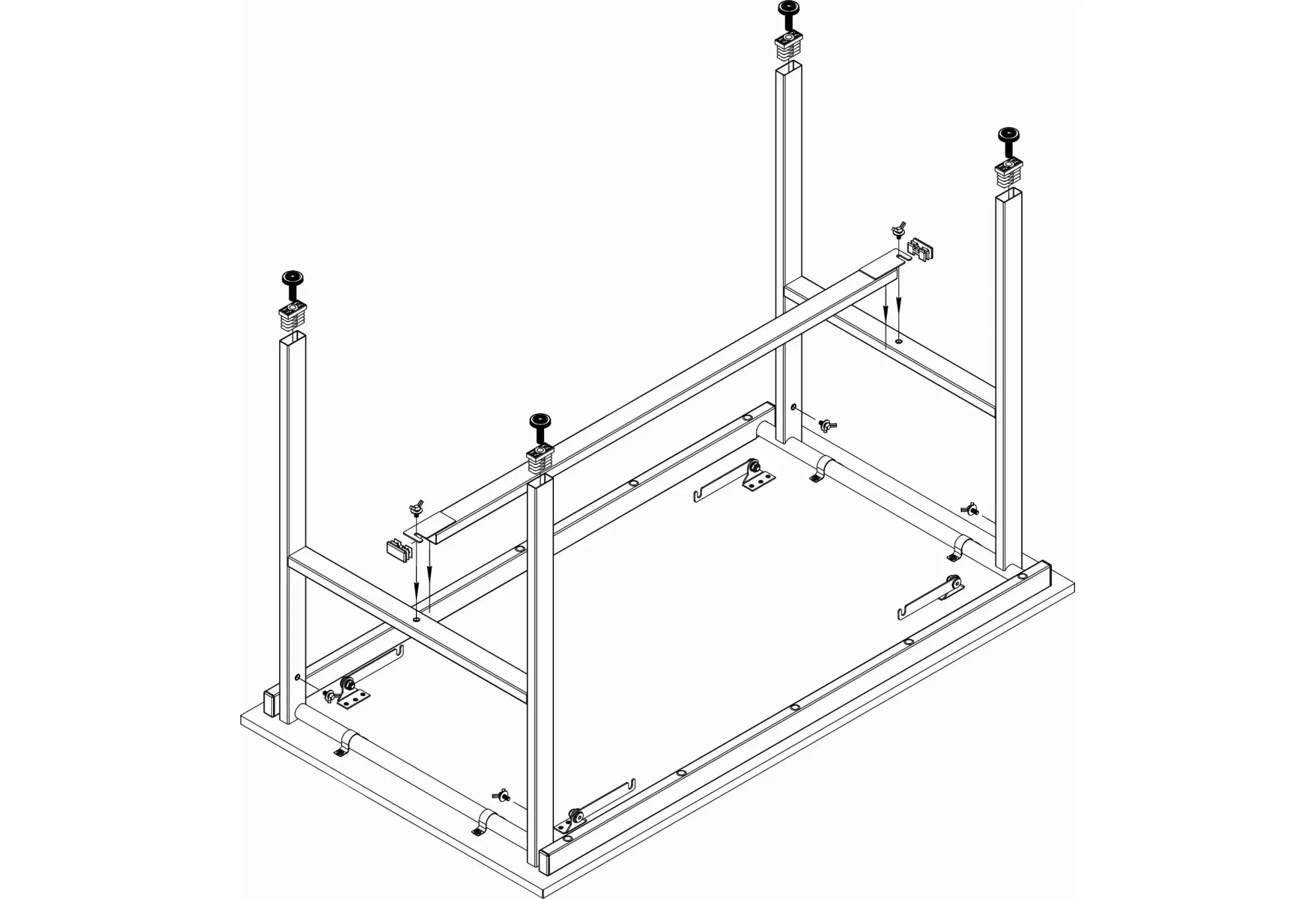 Надежный металлокаркас из профильной трубы 40x20x1,2 мм в черном цвете обеспечивает устойчивость и долговечность конструкции. Две раскладные металлические рамы соединены поперечиной, которую при необходимости можно разобрать для более компактного хранения или транспортировки. Фиксация рам выполняется крючками и несъемными винтами «барашек», что делает сборку и разборку удобной и безопасной без использования инструмента.
