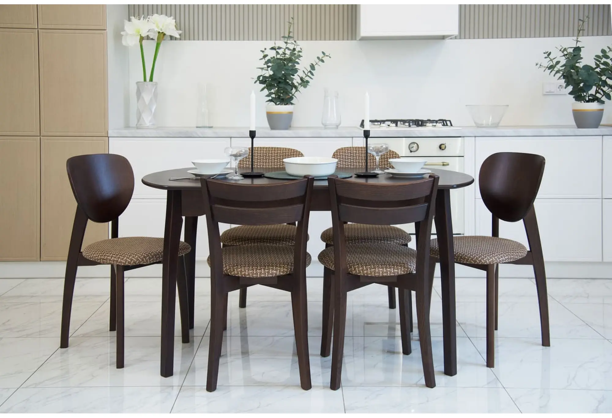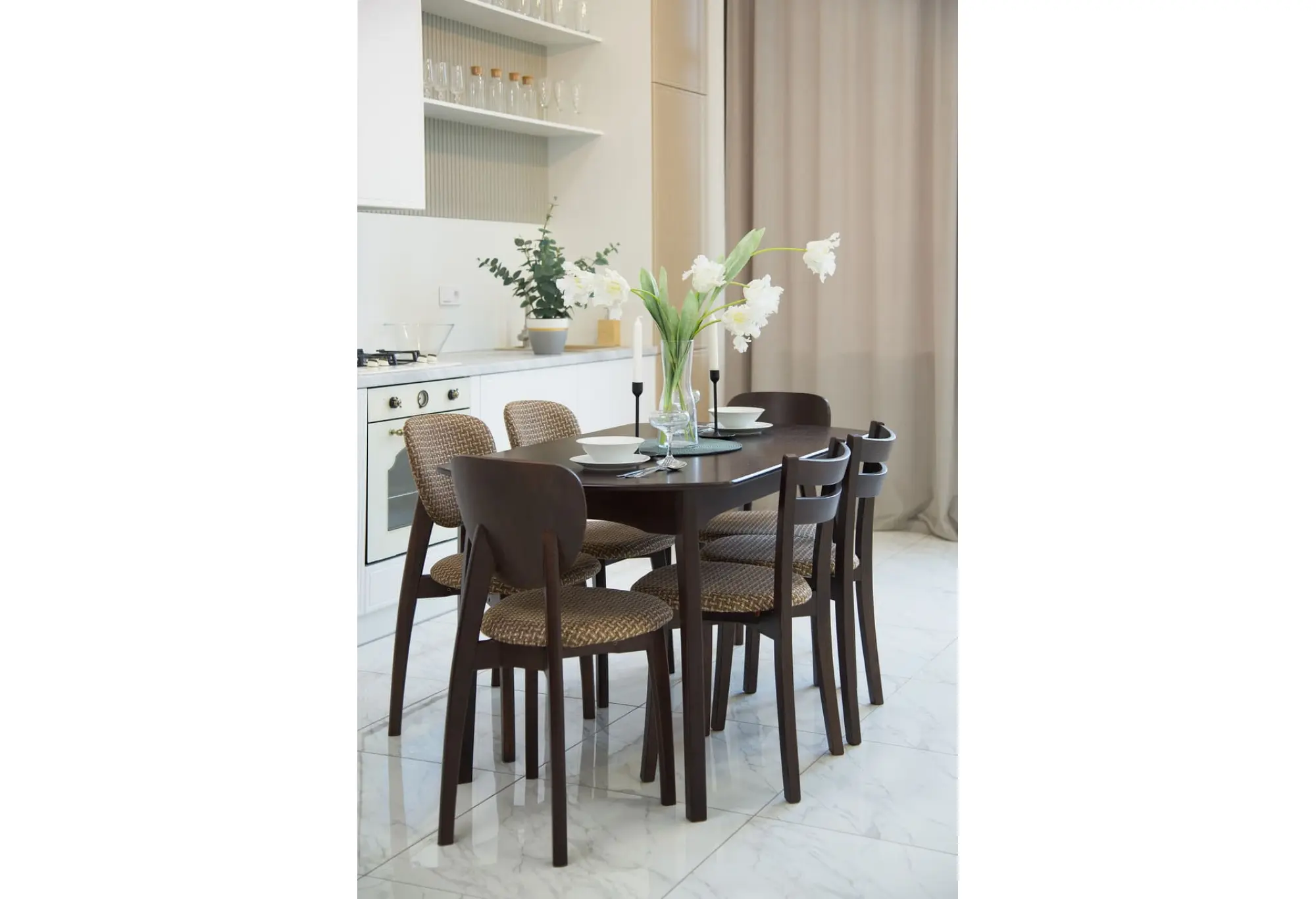 Стул Модерн сочетает в себе элегантный дизайн и функциональность. Он выполнен из массива бука, спинка стула имеет округлую форму, обеспечивающую комфорт, а сиденье обито рогожкой либо велюром с мраморным рисунком. Такой стул станет отличным дополнением к интерьеру в современном и минималистичном стиле.