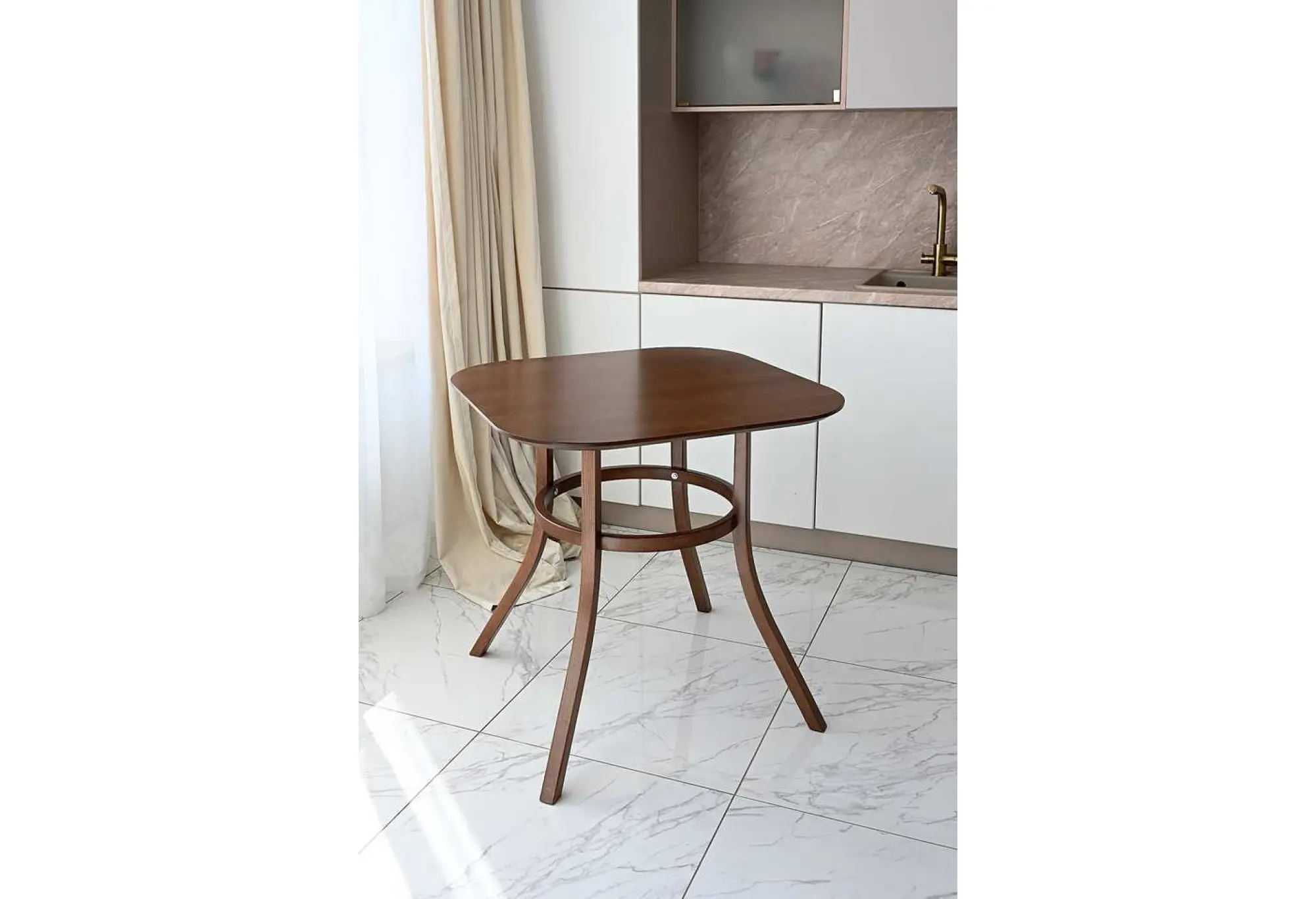 Продуманная конструкция сочетает прочность гнутого деревянного каркаса из бука с износостойким покрытием, представленным комбинацией материалов: верхняя и нижняя поверхности столешницы выполнены из качественного материала — многослойного МДФ, покрытого двумя слоями натурального шпона бука. Это решение обеспечивает надежность и долговечность даже при интенсивном использовании.