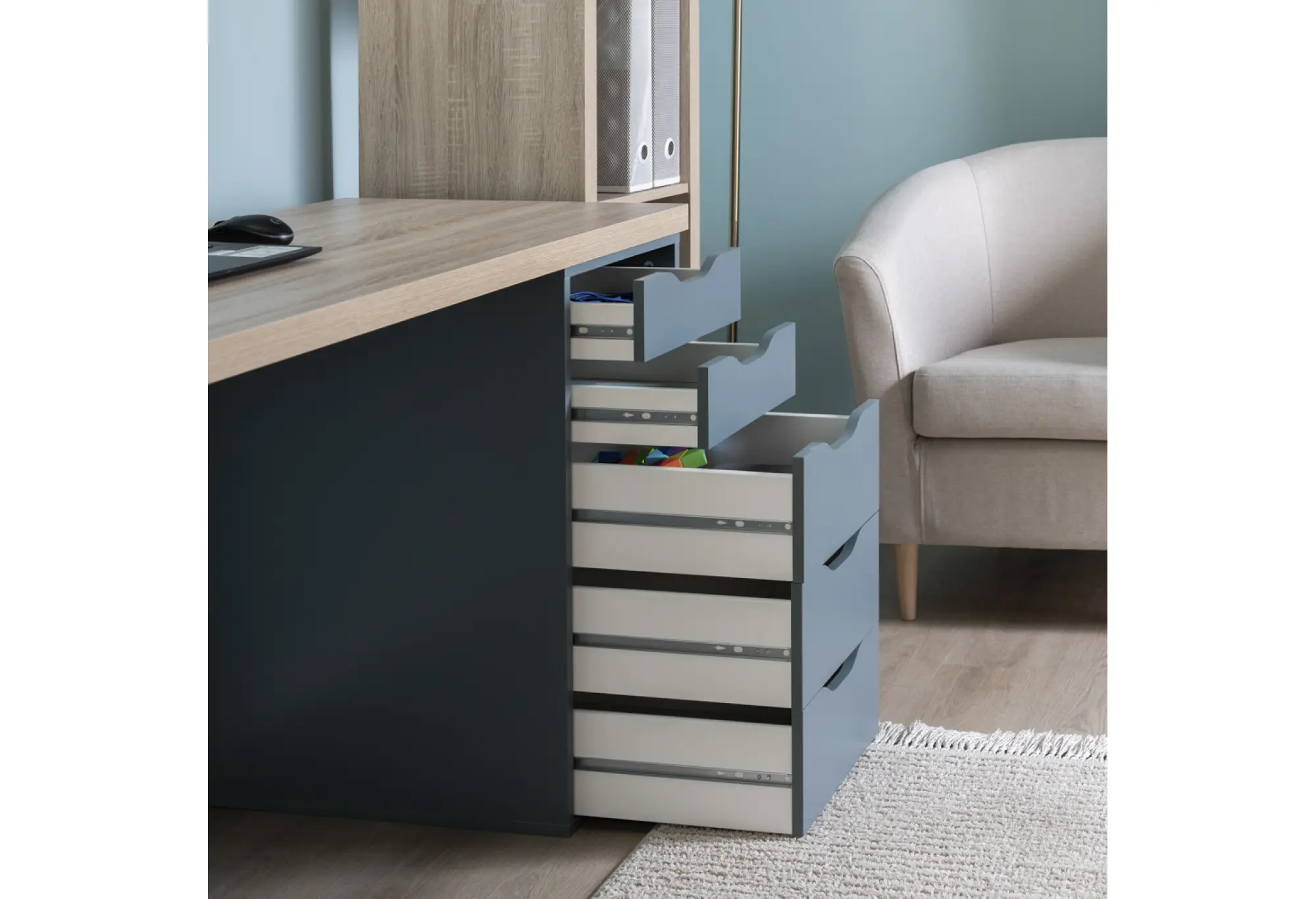 Элегантные металлические ножки в черном цвете регулируются по высоте для идеальной устойчивости. Функциональная тумба с пятью выдвижными ящиками, декорированная изящной бумагой и окрашенная УФ-материалами, предлагает удобное хранение документов и различных предметов. Отсутствие ручек на ящиках и аккуратные вырезы для выдвижения обеспечивают минималистичный и аккуратный вид.