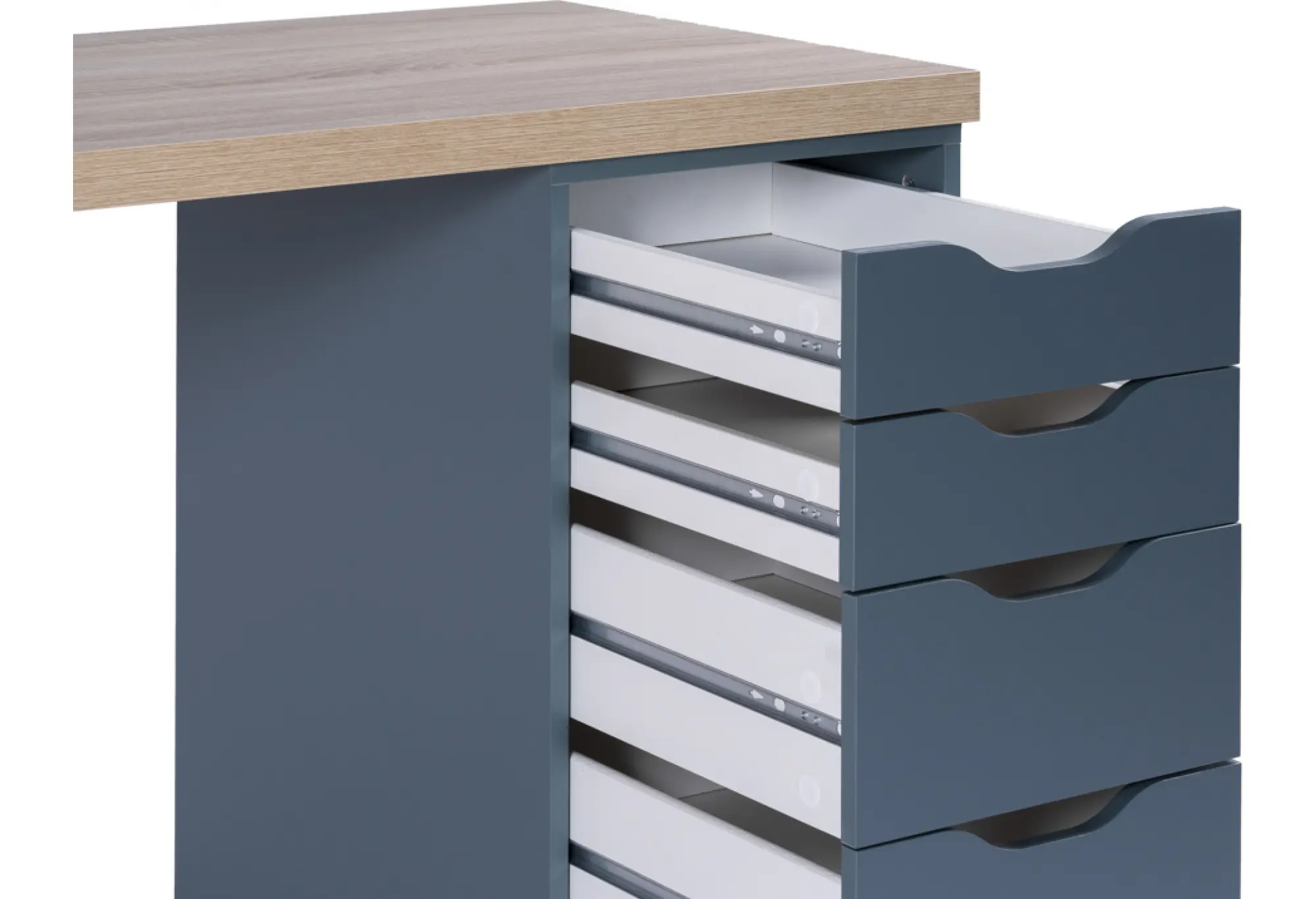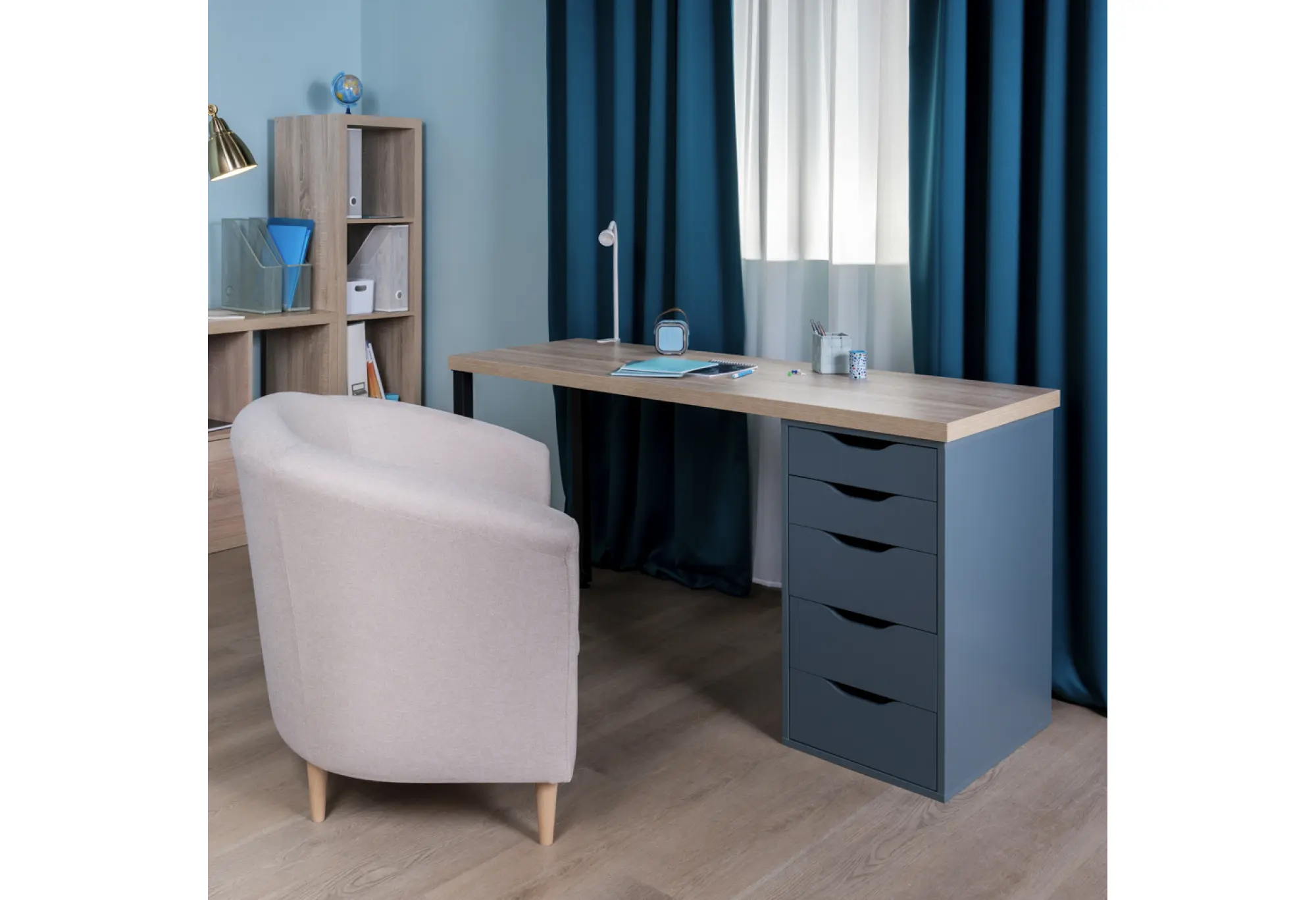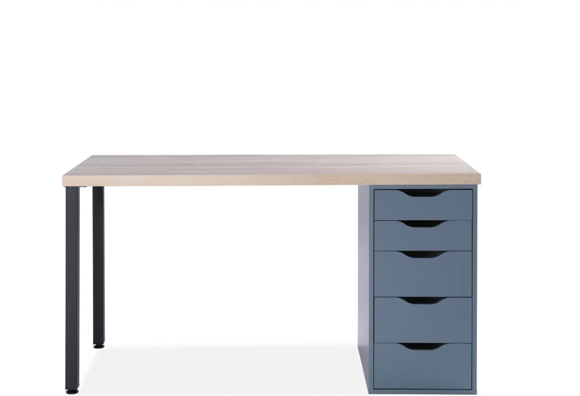 Стол письменный Ингар 2/5Т, 140x75x55, цвет Дуб беленый/серо-бирюзовый/черный. Стол комплектуется столешницей, двумя металлическими ножками и тумбой под столешницу с пятью выдвижными ящиками. Конструкция столешницы - тамбурат (рамка из ДСП и HDF с сотовым заполнением) - популярная современная технология, активно внедряемая крупнейшими производителями для изготовления мебели по скандинавским стандартам. Ножки - крашенный металл в черный цвет. Опоры ножек регулируемые. Конструкция тумб стола: ДСП, поверхность, декорированная бумага, окраска УФ материалами. Фасады ящиков без ручек, с вырезами для удобного выдвижения. Ящики переменной высоты позволяют использовать их для хранения разнообразных предметов.Преимущества: облегченная конструкция (тамбурат); высокая прочность, устойчивость; простая, быстрая сборка; эстетичный внешний вид. Гарантийный срок для жилых и общественных помещений 24 месяца.