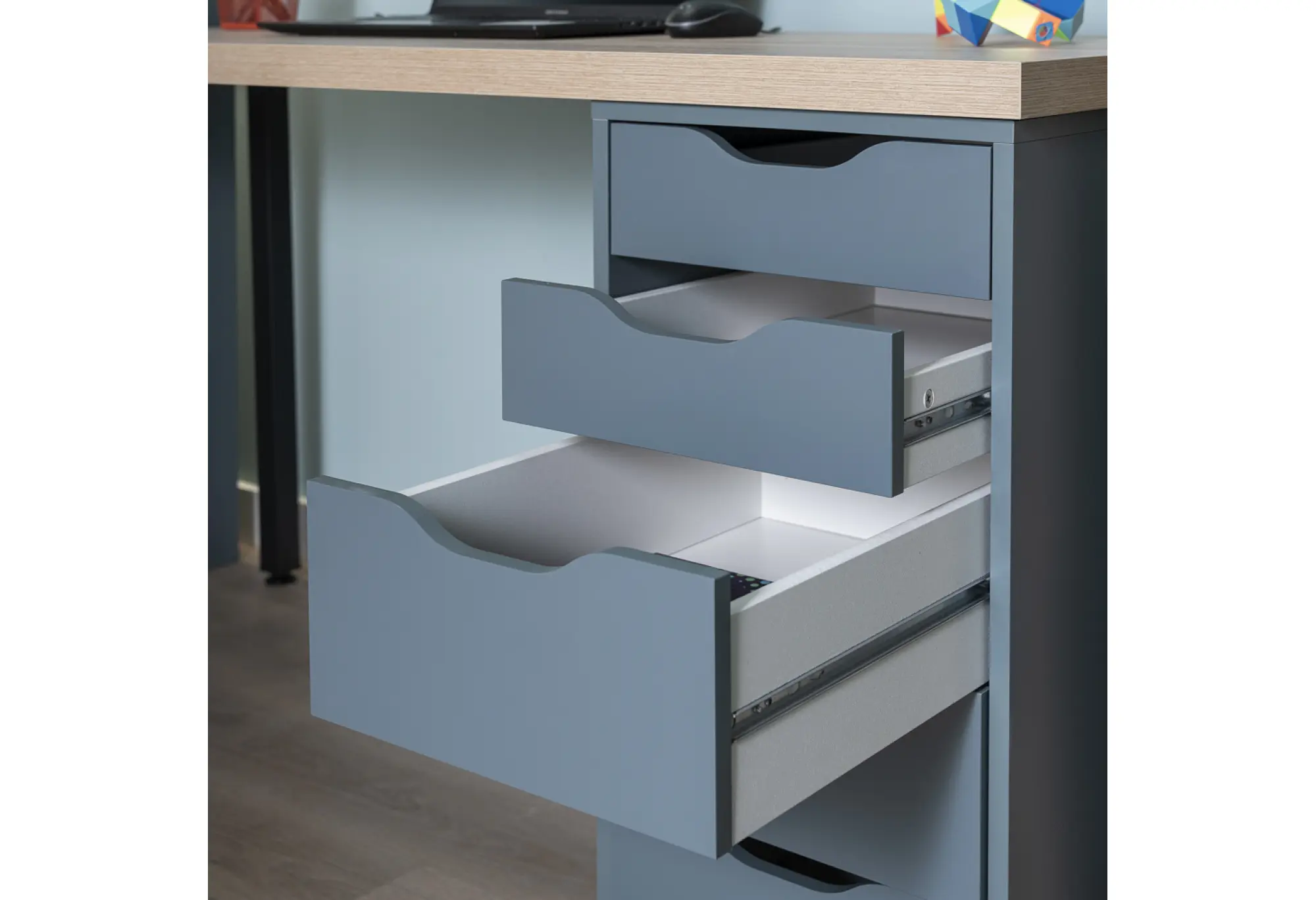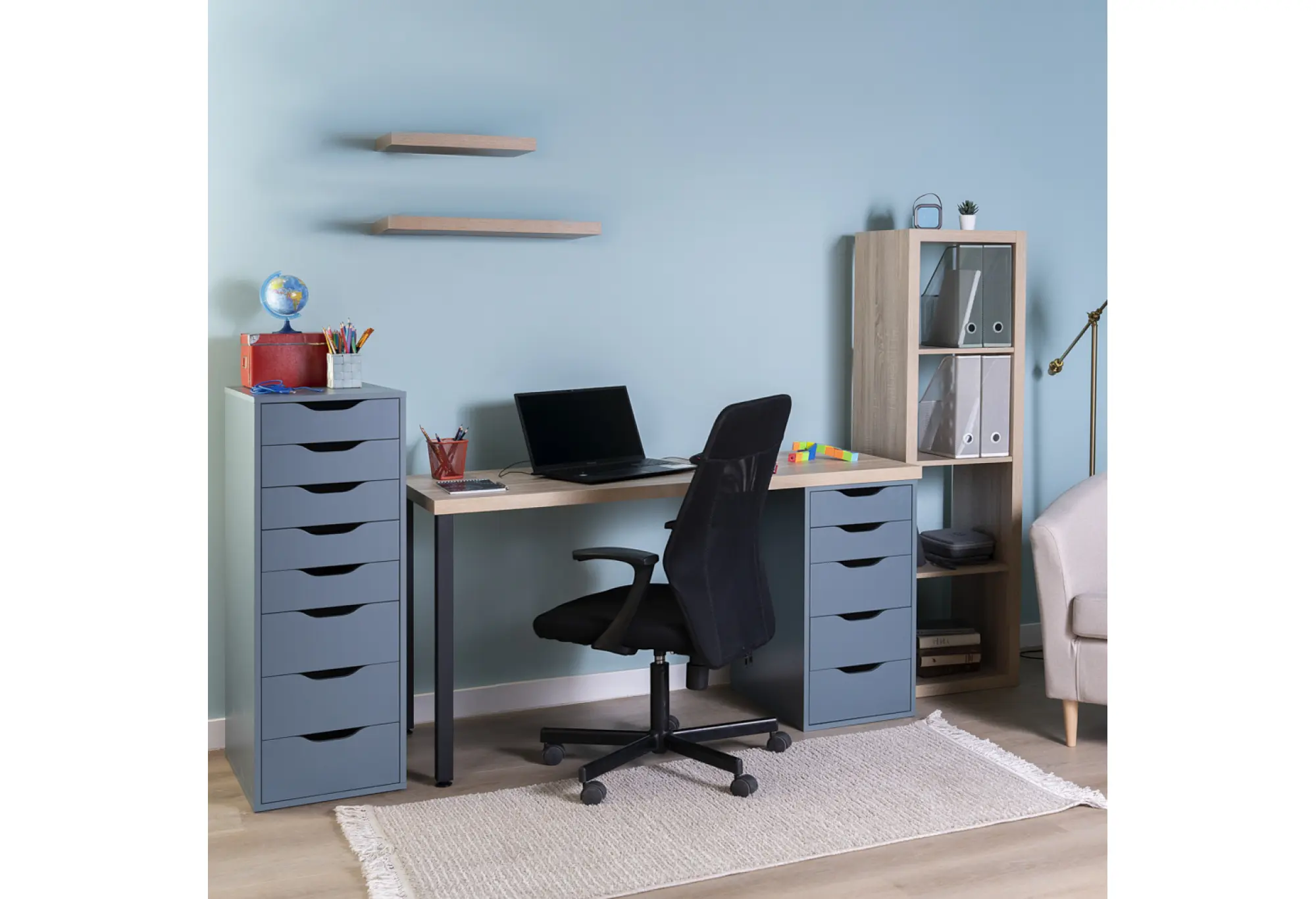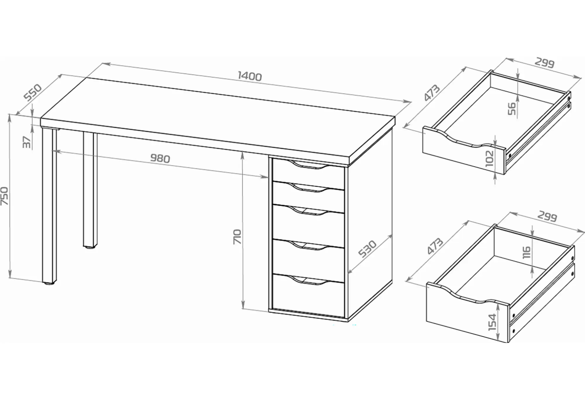 Стол письменный Ингар 2/5Т, 140x75x55, цвет Дуб беленый/серо-бирюзовый/черный. Стол комплектуется столешницей, двумя металлическими ножками и тумбой под столешницу с пятью выдвижными ящиками. Конструкция столешницы - тамбурат (рамка из ДСП и HDF с сотовым заполнением) - популярная современная технология, активно внедряемая крупнейшими производителями для изготовления мебели по скандинавским стандартам. Ножки - крашенный металл в черный цвет. Опоры ножек регулируемые. Конструкция тумб стола: ДСП, поверхность, декорированная бумага, окраска УФ материалами. Фасады ящиков без ручек, с вырезами для удобного выдвижения. Ящики переменной высоты позволяют использовать их для хранения разнообразных предметов.Преимущества: облегченная конструкция (тамбурат); высокая прочность, устойчивость; простая, быстрая сборка; эстетичный внешний вид. Гарантийный срок для жилых и общественных помещений 24 месяца.