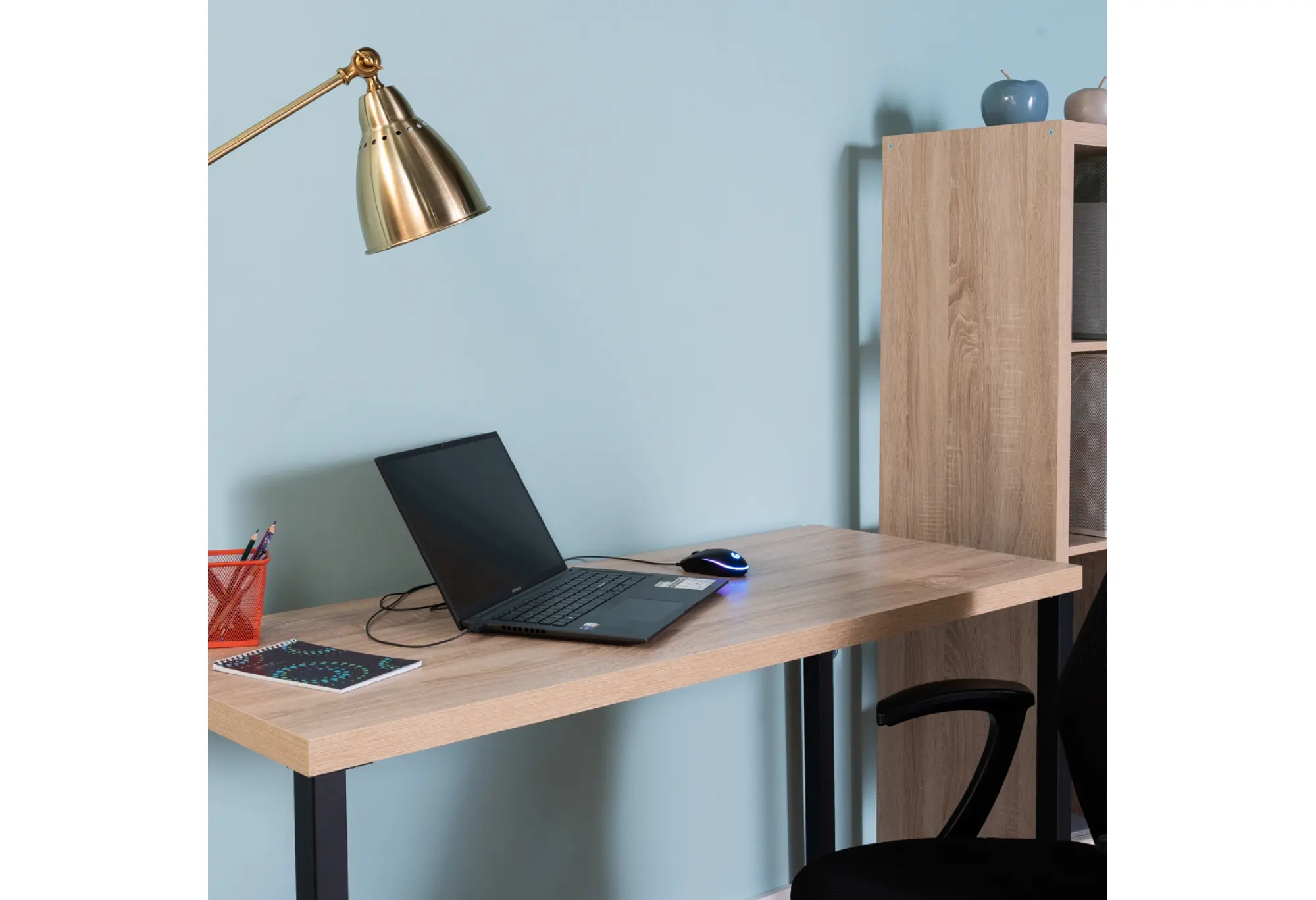 Металлические ножки, окрашенные в черный цвет, придают столу устойчивость и визуальную легкость. Регулируемые опоры позволяют выровнять стол даже на неровном полу, чтобы рабочая поверхность оставалась стабильной. Материалы корпуса — ДСП с декорированной поверхностью, защищенной УФ-окраской, что способствует сохранению внешнего вида при повседневной эксплуатации.