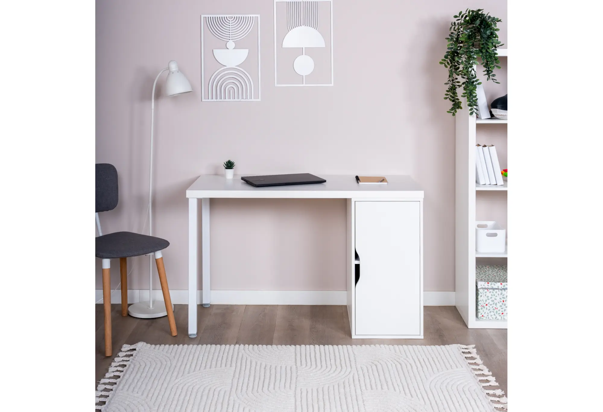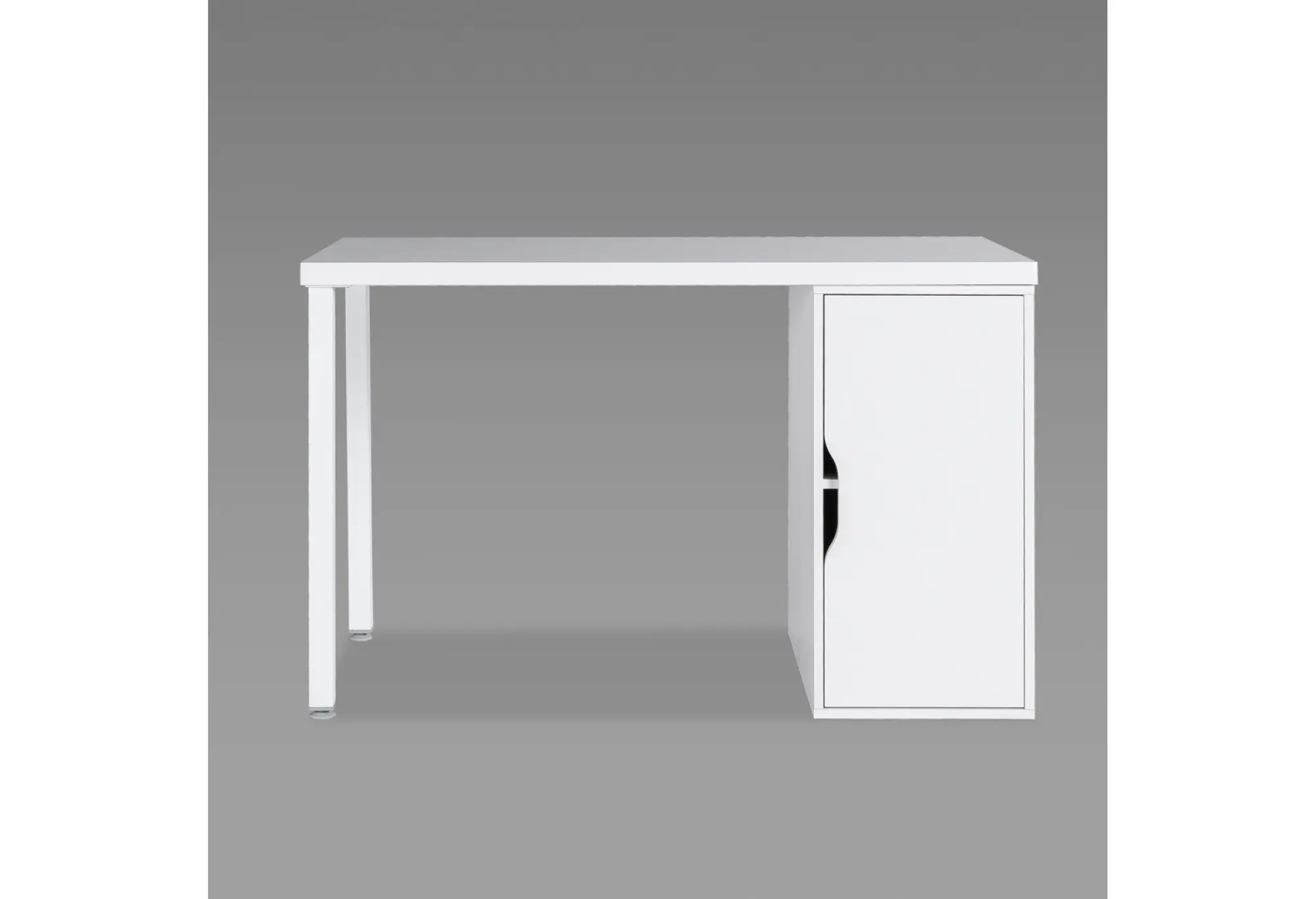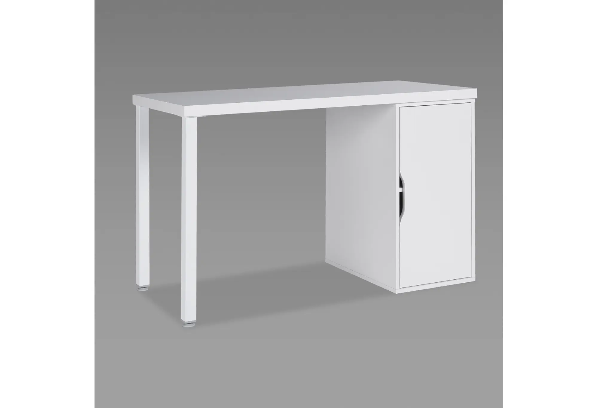 Боковая тумба с распашной дверцей дает закрытое пространство для хранения папок, учебников, офисных принадлежностей и личных вещей. Продолговатый вырез вместо ручки делает фасад более лаконичным и безопасным в ежедневном использовании, без выступающих элементов. Светлый белый цвет визуально облегчает конструкцию и делает рабочую зону более светлой и организованной.