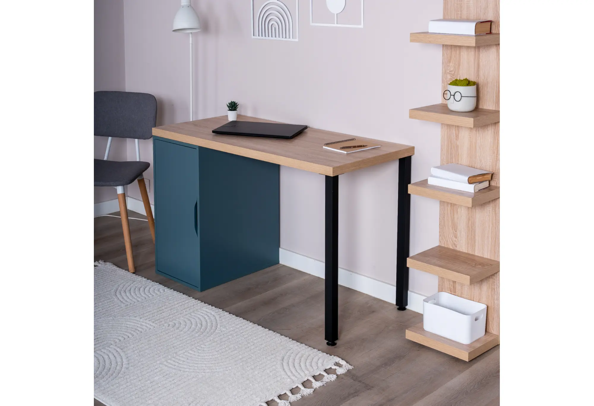 Опора в виде черных металлических ножек с одной стороны и закрытой тумбы в серо-бирюзовом цвете с другой обеспечивает устойчивость и визуальный баланс. Контрастная цветовая комбинация делает стол выразительным, но не перегружает пространство, органично вписываясь как в минималистичные, так и в более динамичные интерьеры.