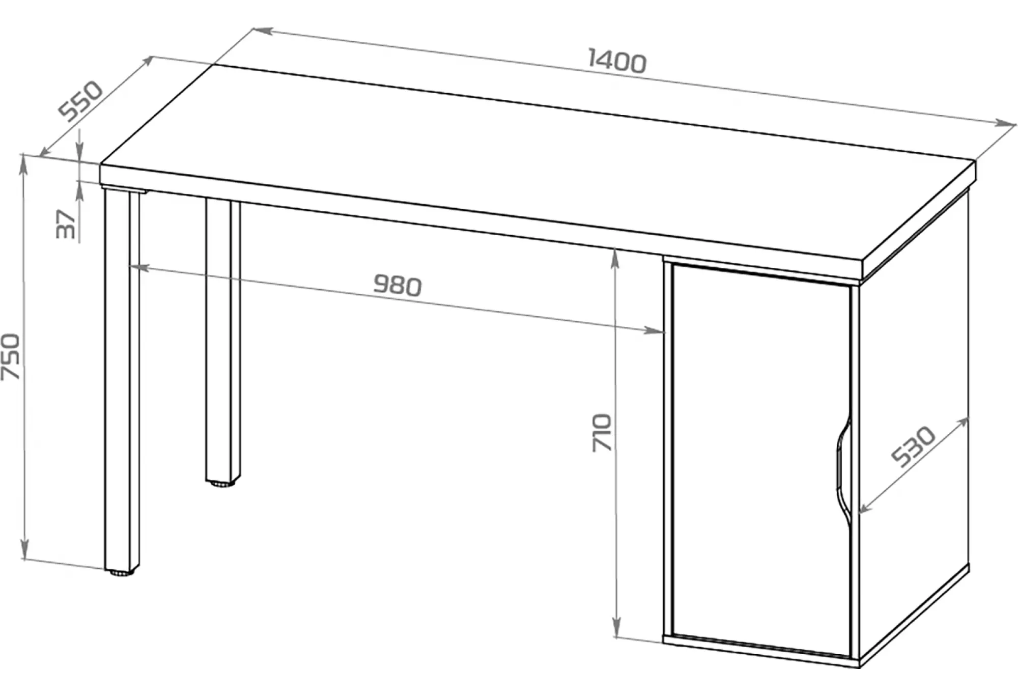 Компактная глубина 550 мм позволяет разместить стол у стены или у окна даже в относительно небольших комнатах, а длина 1400 мм предоставляет достаточно пространства для комфортного расположения монитора, клавиатуры и рабочих материалов. Высота 750 мм соответствует стандарту для письменных столов и подходит для большинства офисных и домашних кресел.